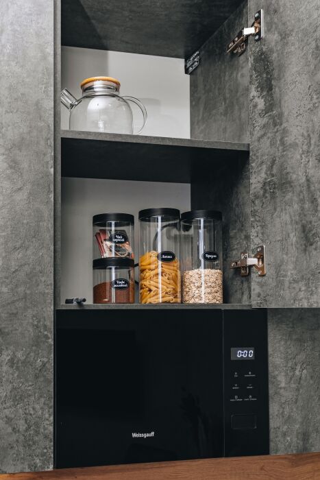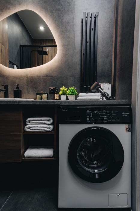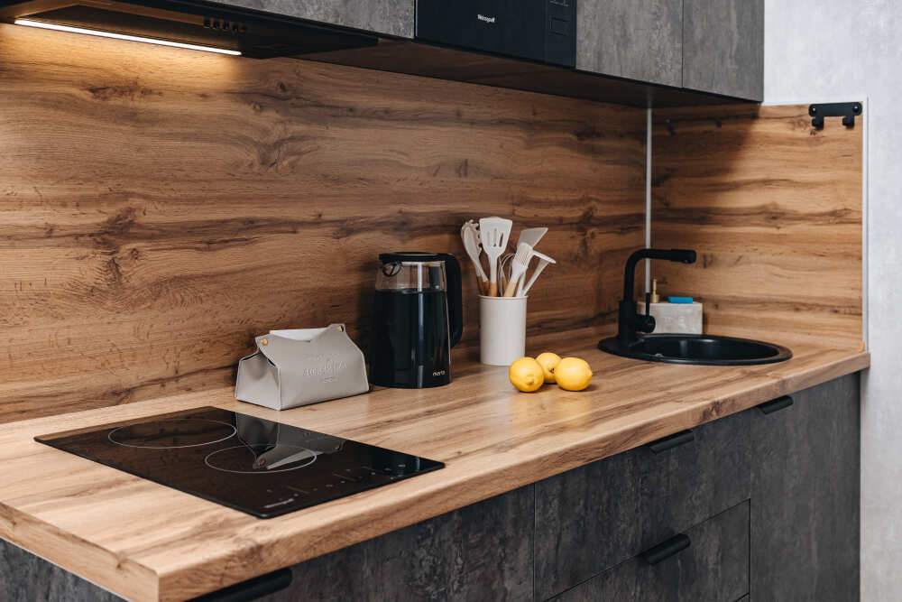 - Холодильник, варочная поверхность, стиральная машина, микроволновка, чайник и гейзерная кофеварка.