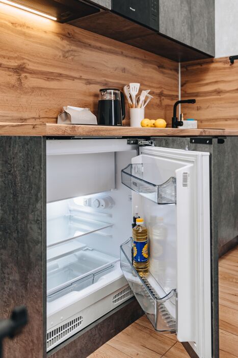 В квартире есть все, что может понадобиться для приготовления еды. Также есть вся посуда для комфортного проживания: ножи, столовые приборы на 2 человека, кастрюля, сковородка, тарелки, бокалы и многое другое включено, если снять студию у нас.