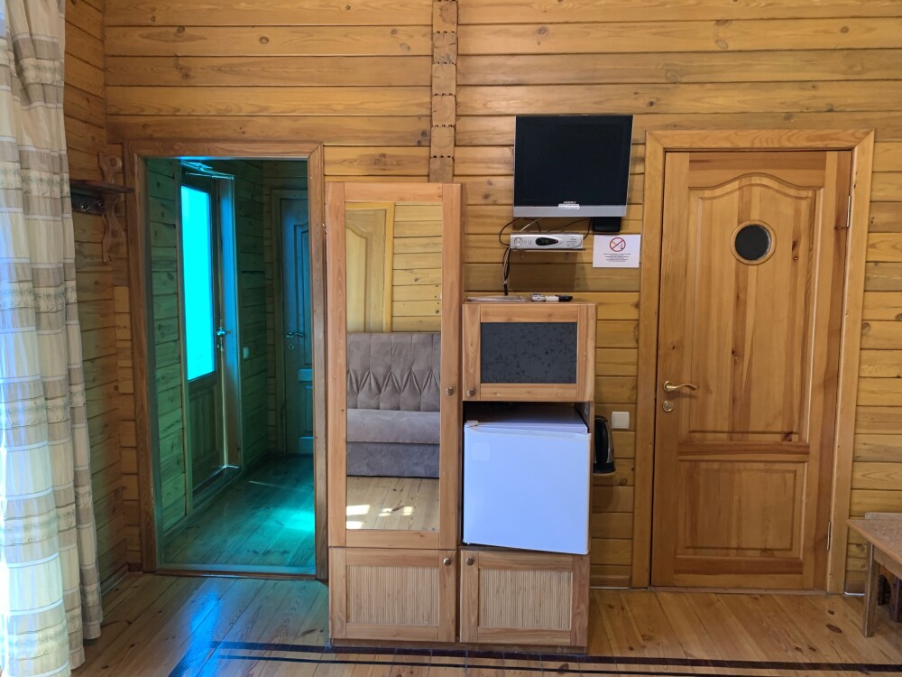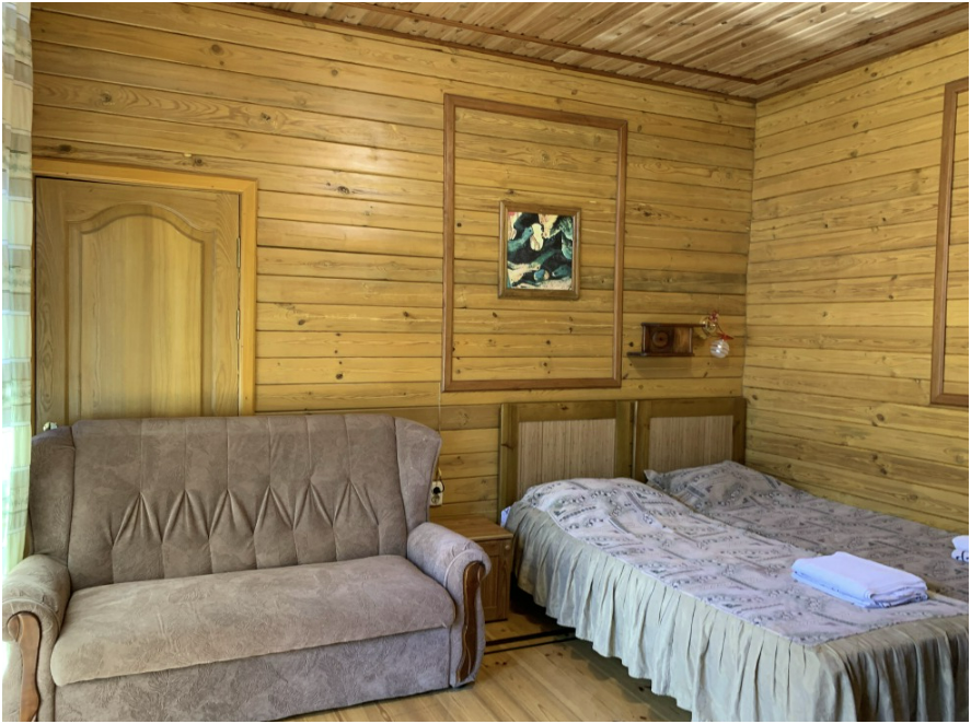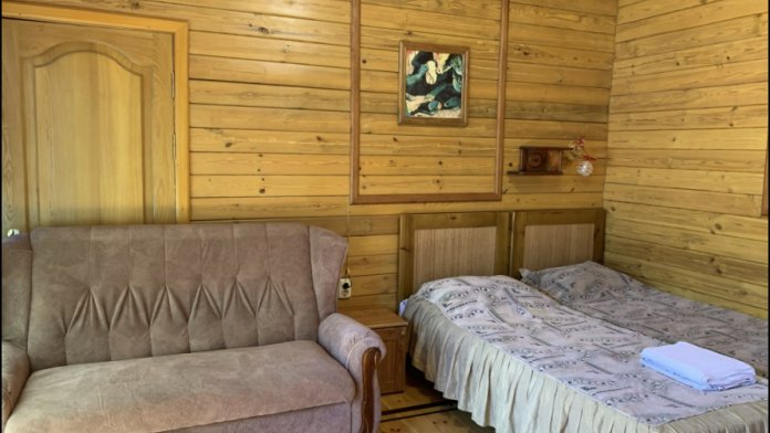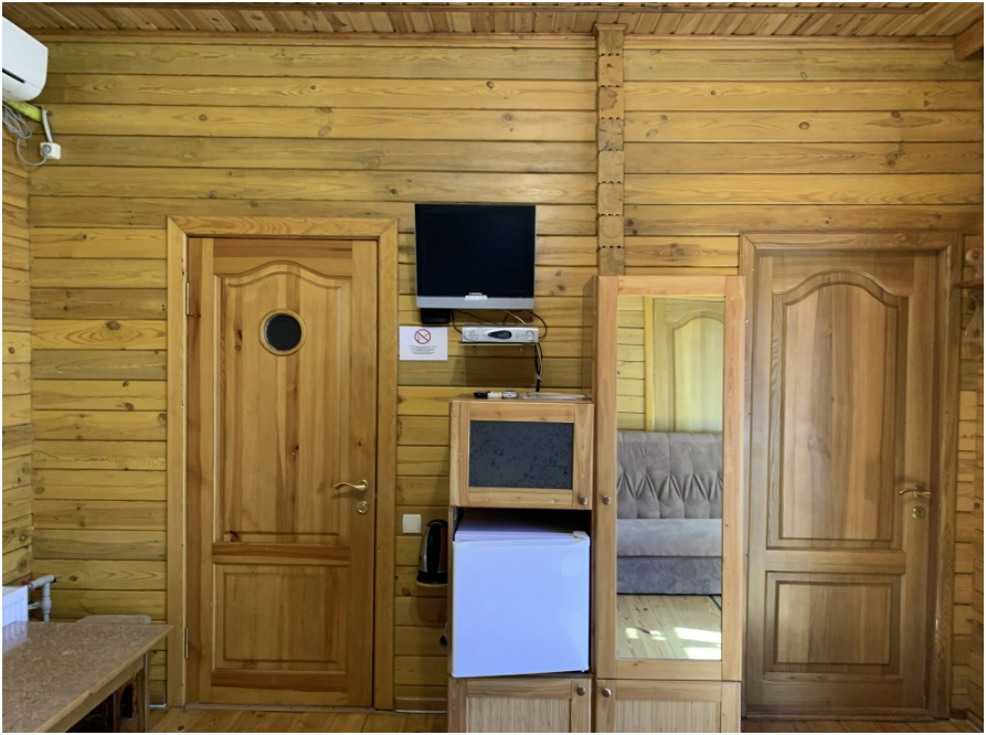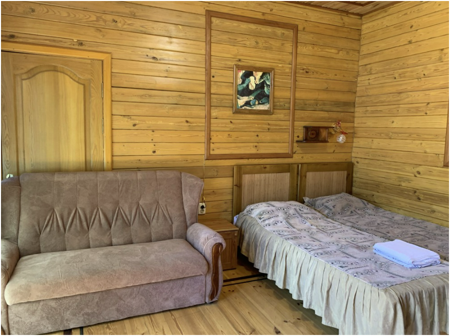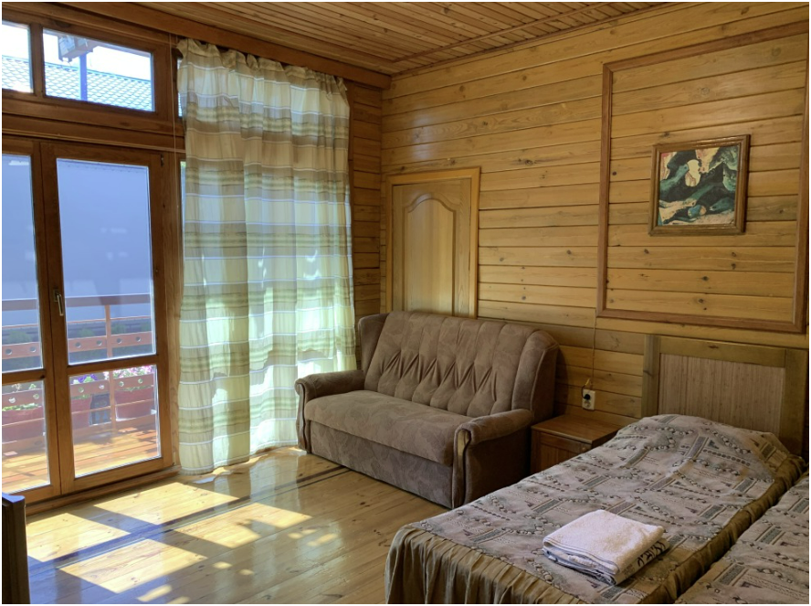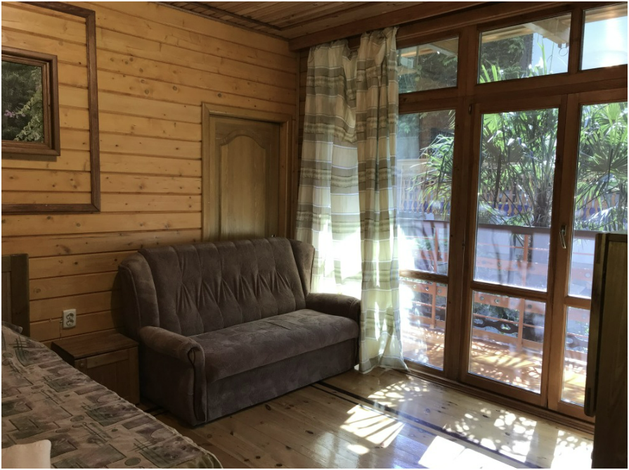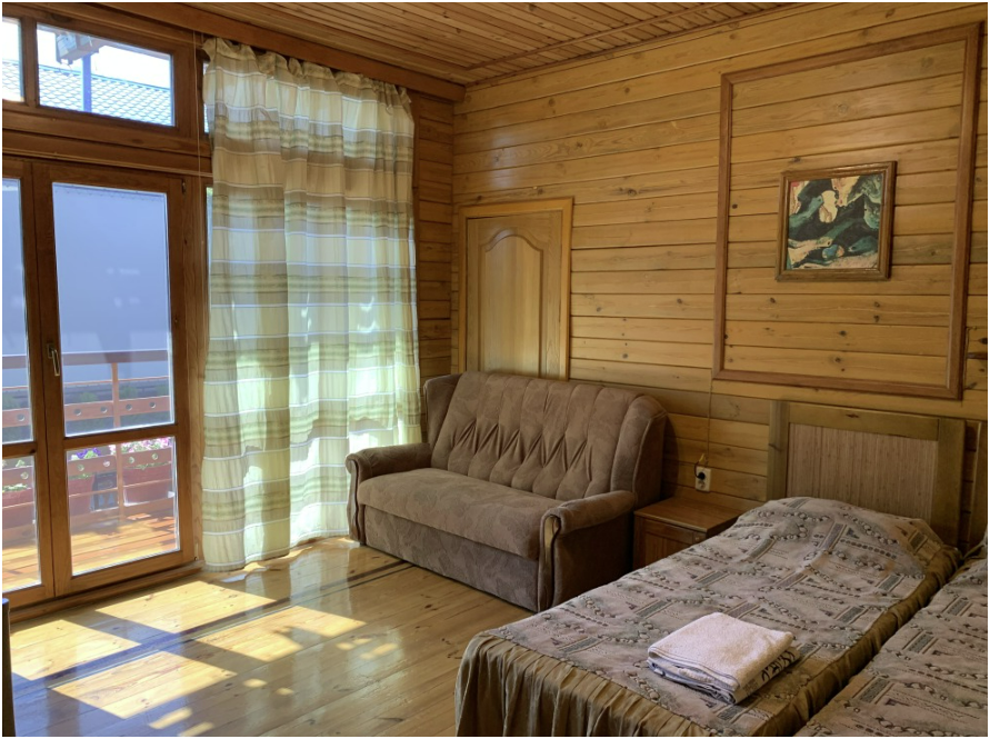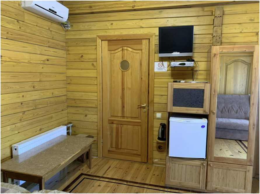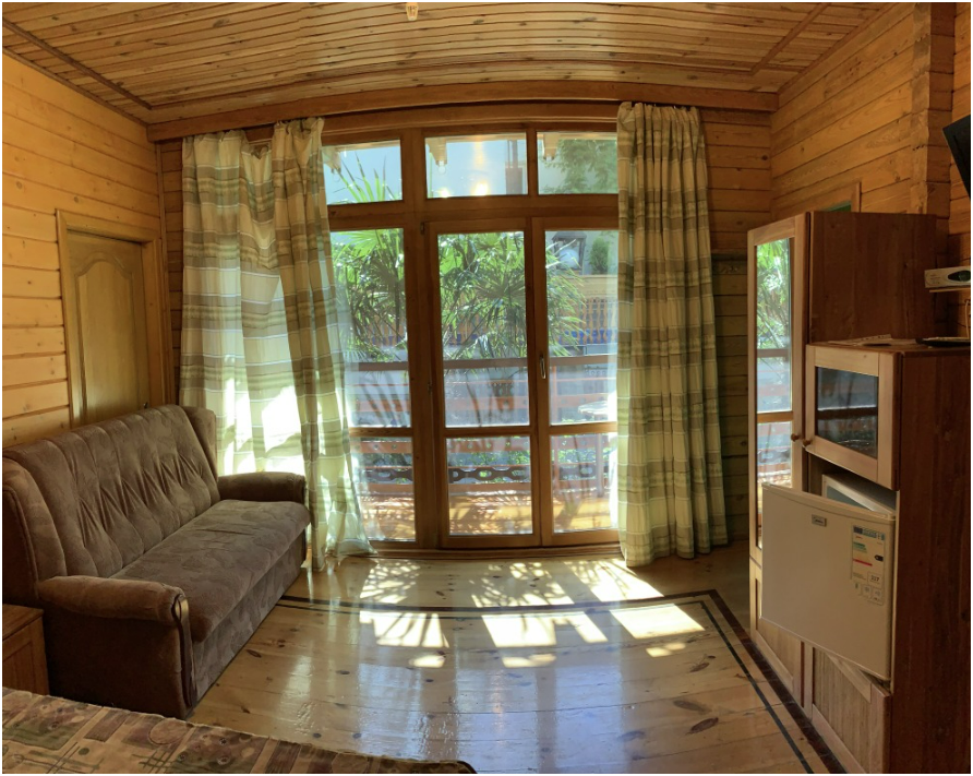 Просторный номер состоит из одной комнаты с санузлом. В комнате две односпальные кровати и большой диван. Журнальный столик, шкаф, тумба. Телевизор, кондиционер, холодильник, чайник. В санузле: душ, раковина, унитаз. Стиральная машинка и гладильная доска предоставляются. Есть место где пообедать, приготовить шашлык. Действующий бассейн с горкой для детей. Есть бильярд. По вечерам показываем фильмы на большом экране. Можно смотреть с балкона. Есть соляная комната, для улучшения работы органов дыхания