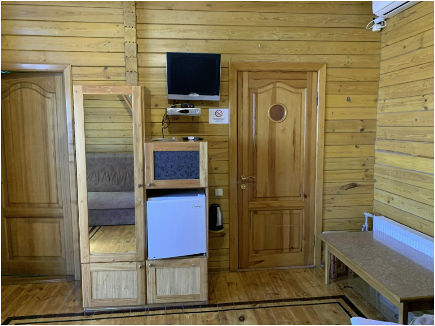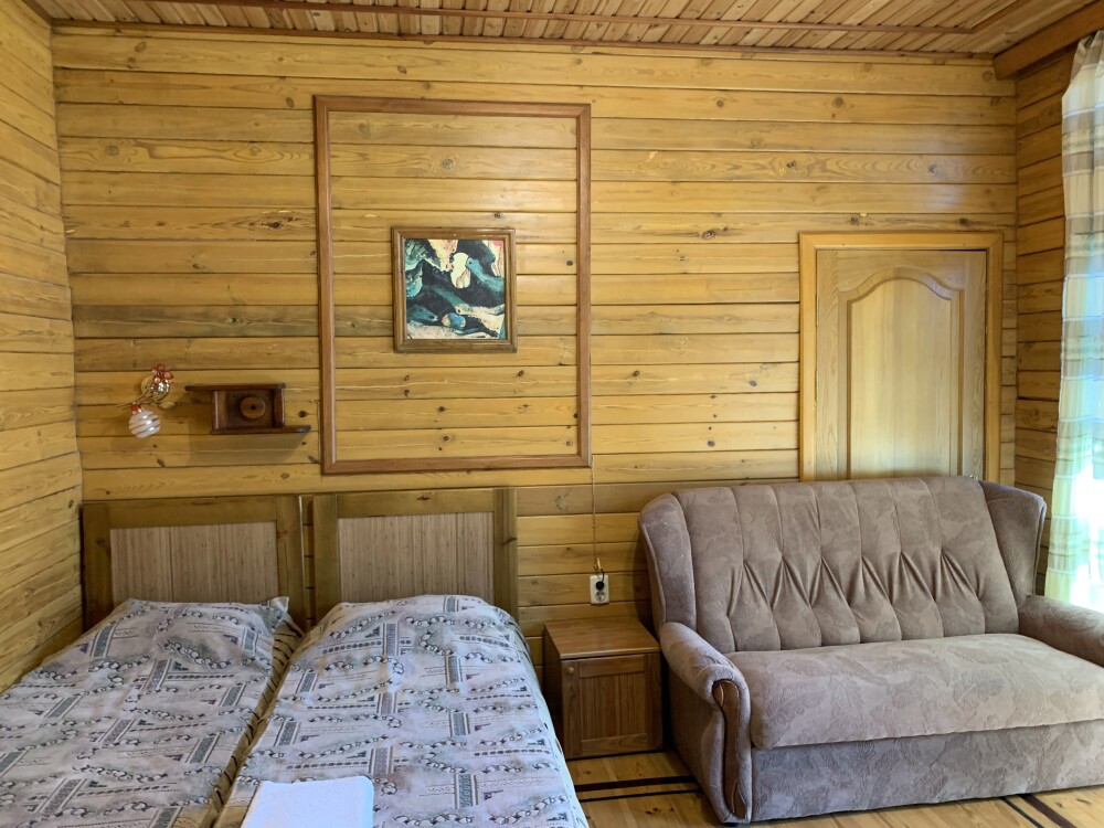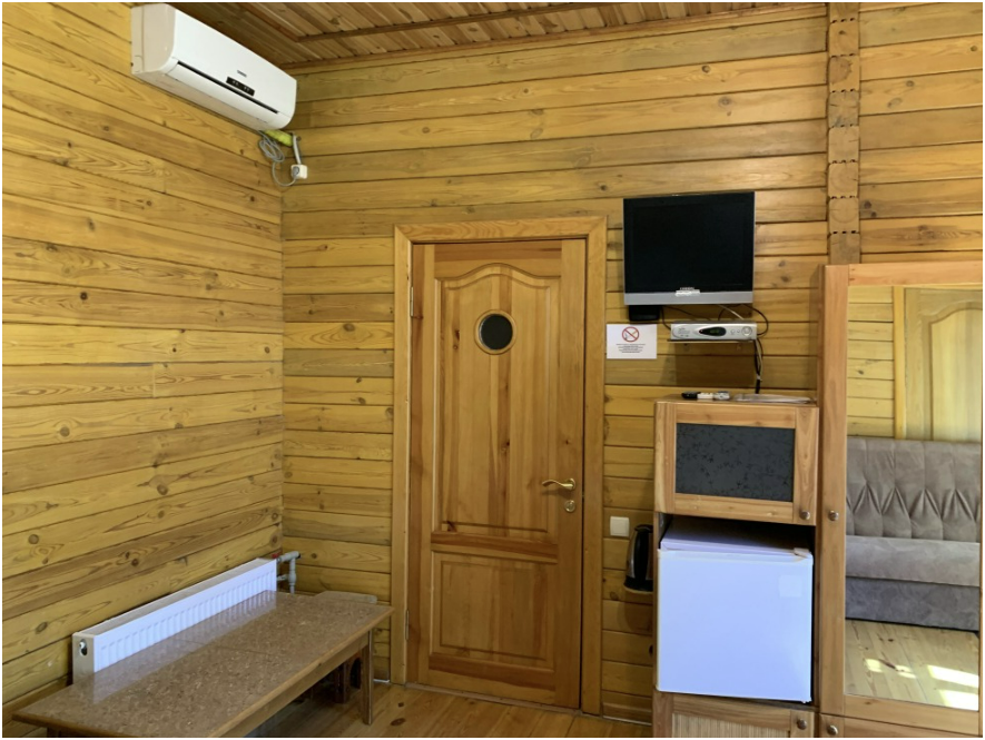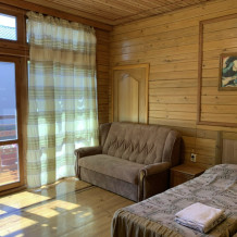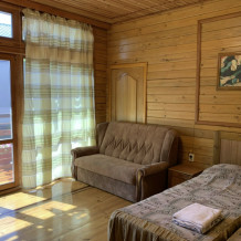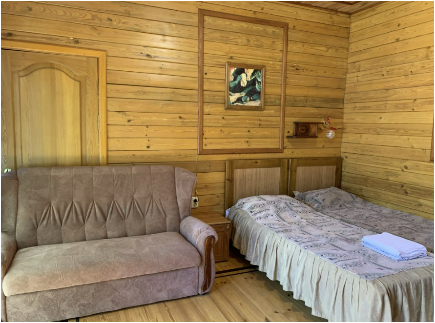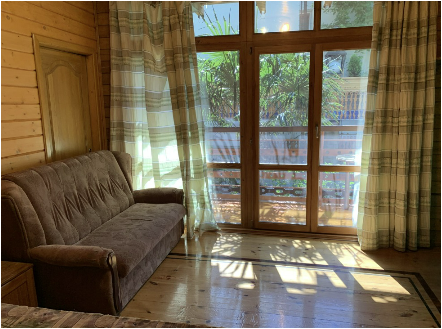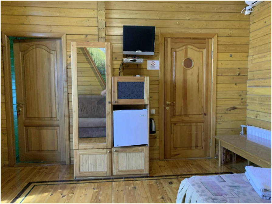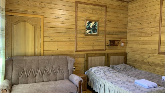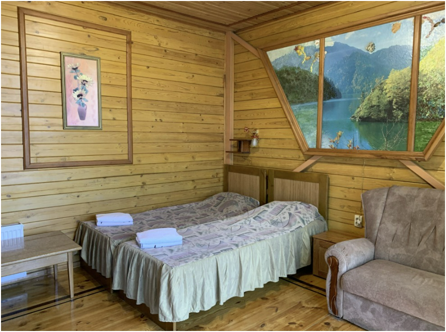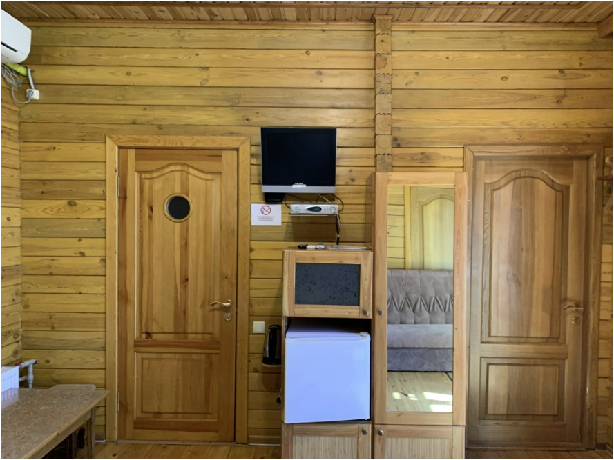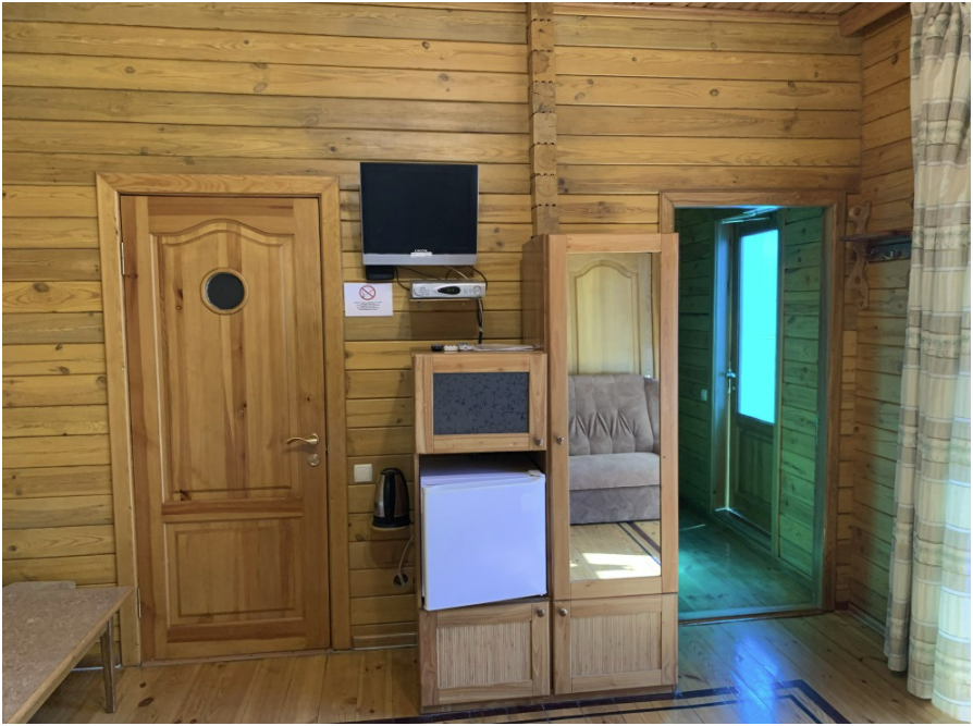 Просторный номер состоит из одной комнаты с санузлом. В комнате две односпальные кровати и большой диван. Журнальный столик, шкаф, тумба. Телевизор, кондиционер, холодильник, чайник. В санузле: душ, раковина, унитаз. Стиральная машинка и гладильная доска предоставляются. Есть место где пообедать, приготовить шашлык. Действующий бассейн с горкой для детей. Есть бильярд. По вечерам показываем фильмы на большом экране. Можно смотреть с балкона. Есть соляная комната, для улучшения работы органов дыхания