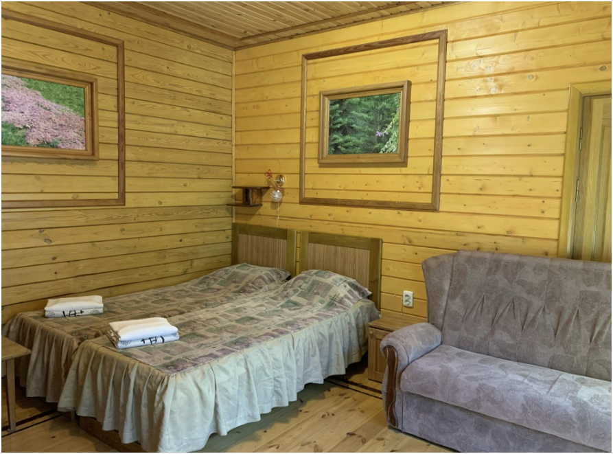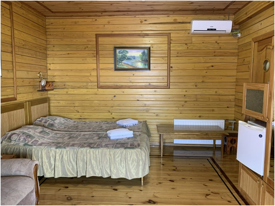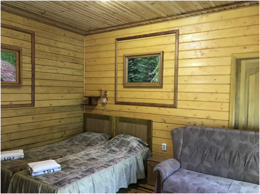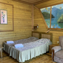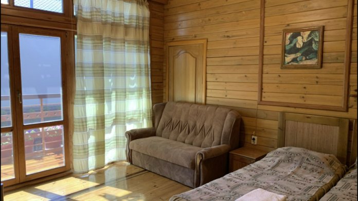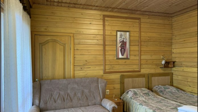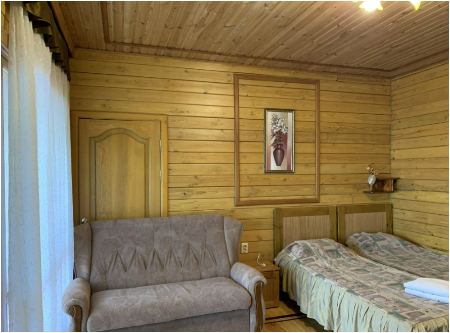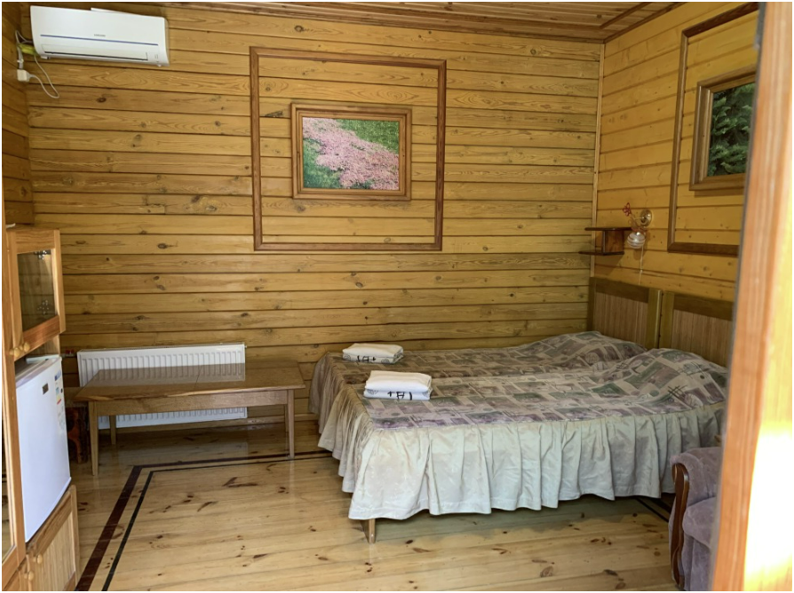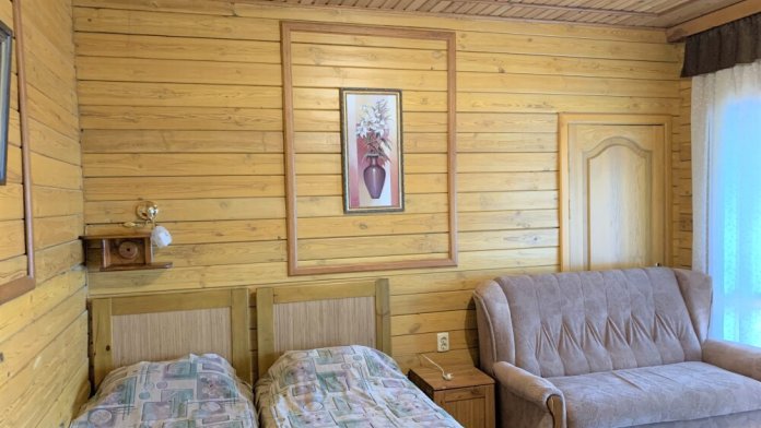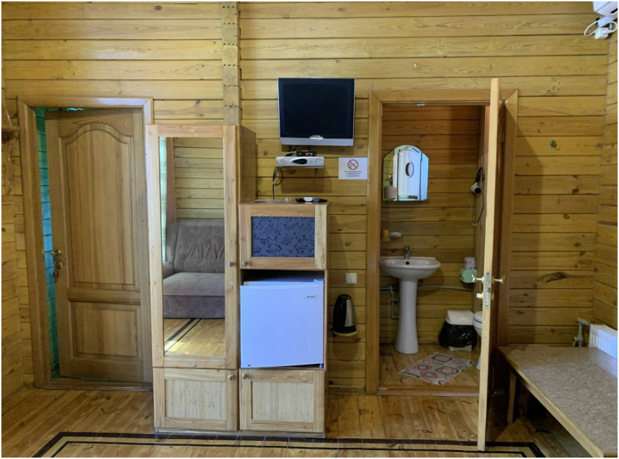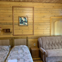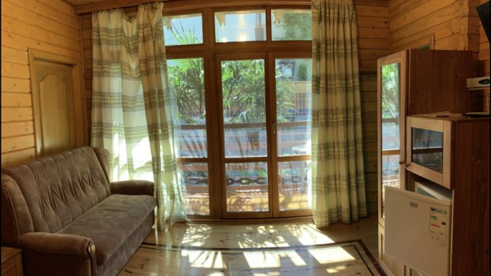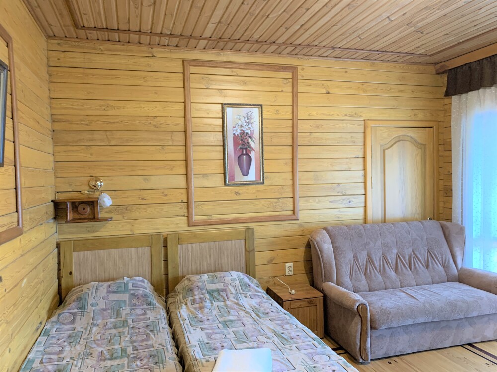 Просторный номер состоит из одной комнаты с санузлом. В комнате две односпальные кровати и большой диван. Журнальный столик, шкаф, тумба. Телевизор, кондиционер, холодильник, чайник. В санузле: душ, раковина, унитаз. Стиральная машинка и гладильная доска предоставляются. Есть место где пообедать, приготовить шашлык. Действующий бассейн с горкой для детей. Есть бильярд. По вечерам показываем фильмы на большом экране. Можно смотреть с балкона. Есть соляная комната, для улучшения работы органов дыхания