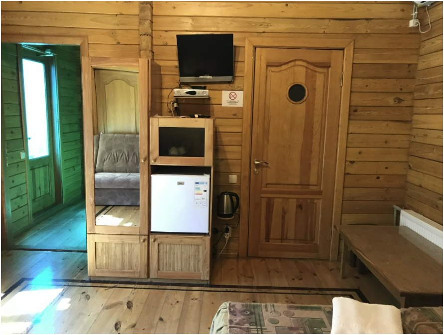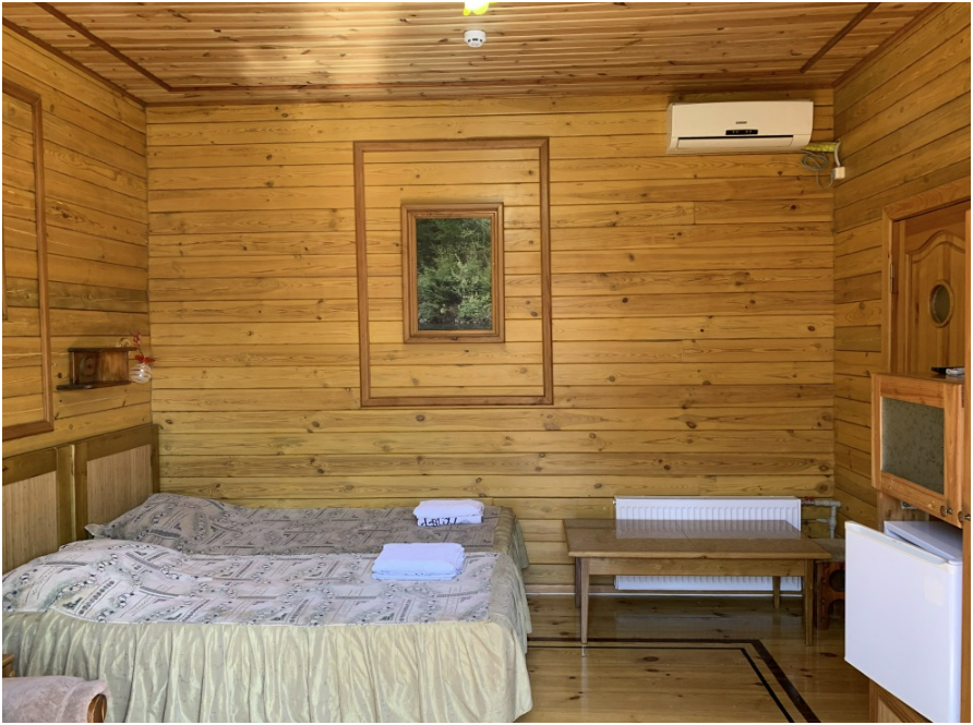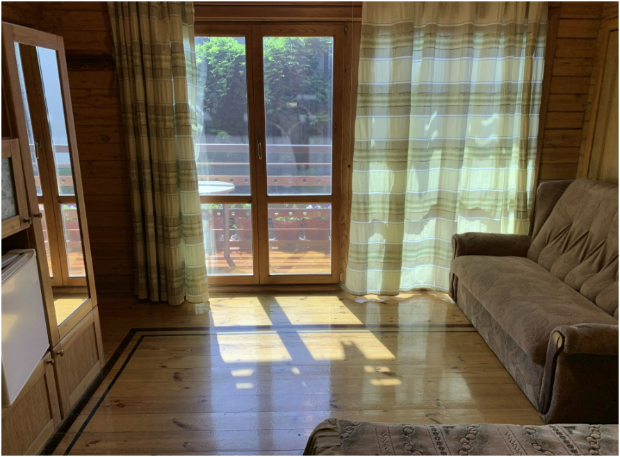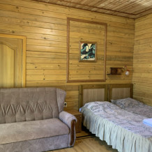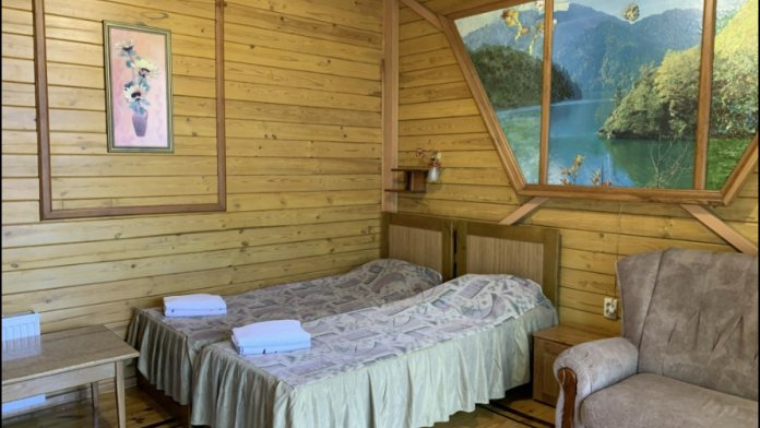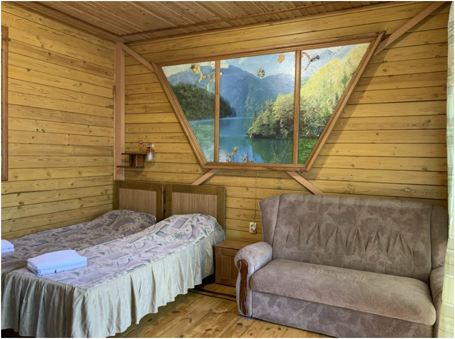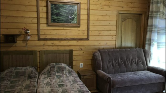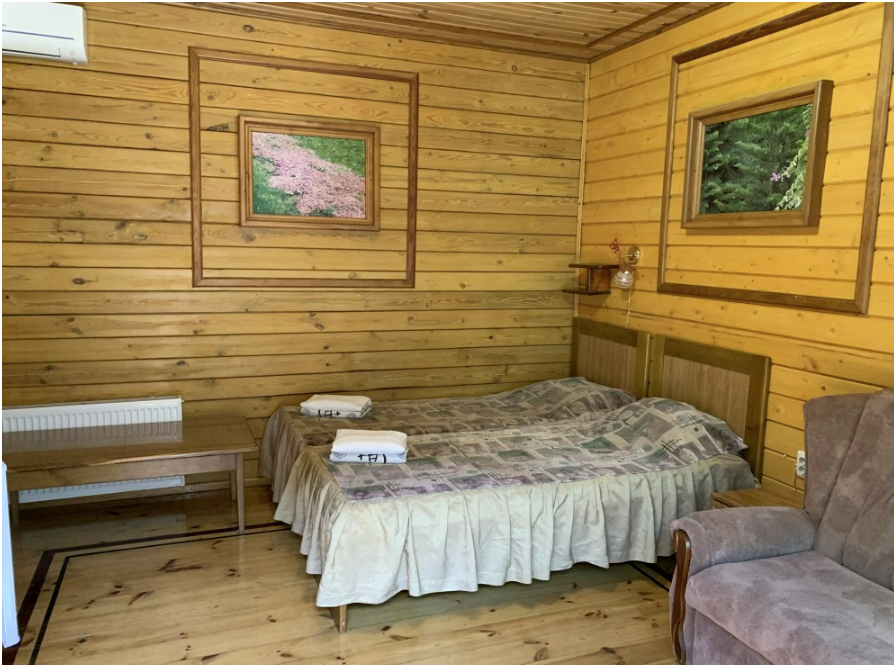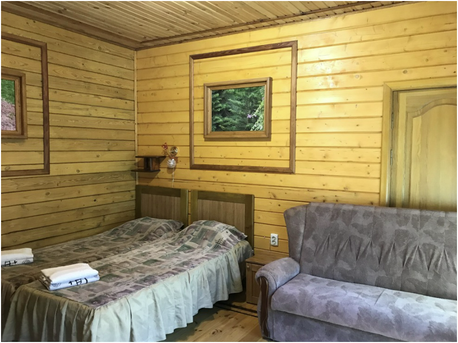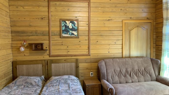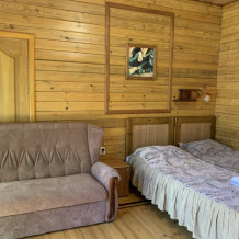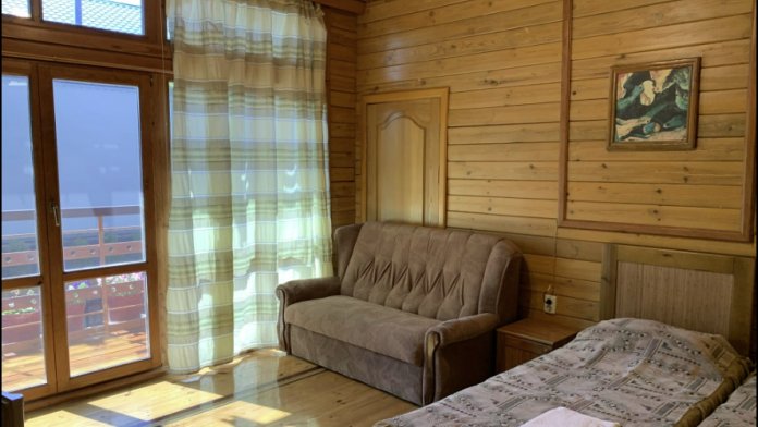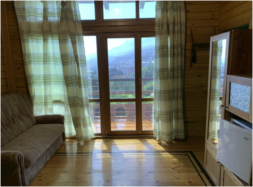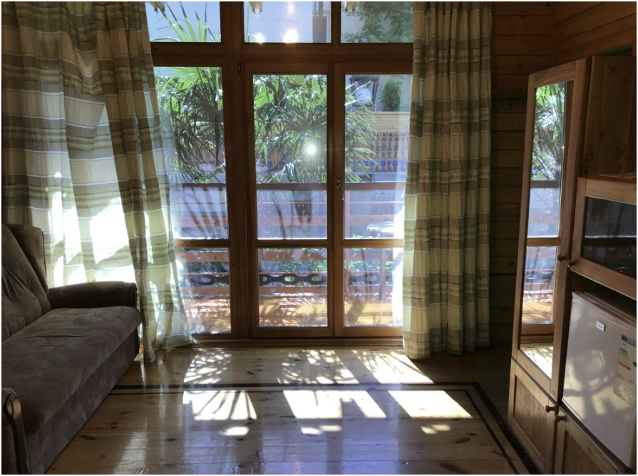 Просторный номер состоит из одной комнаты с санузлом. В комнате две односпальные кровати и большой диван. Журнальный столик, шкаф, тумба. Телевизор, кондиционер, холодильник, чайник. В санузле: душ, раковина, унитаз. Стиральная машинка и гладильная доска предоставляются. Есть место где пообедать, приготовить шашлык. Действующий бассейн с горкой для детей. Есть бильярд. По вечерам показываем фильмы на большом экране. Можно смотреть с балкона. Есть соляная комната, для улучшения работы органов дыхания