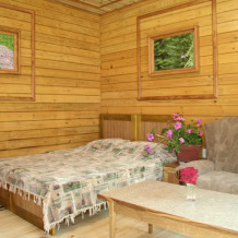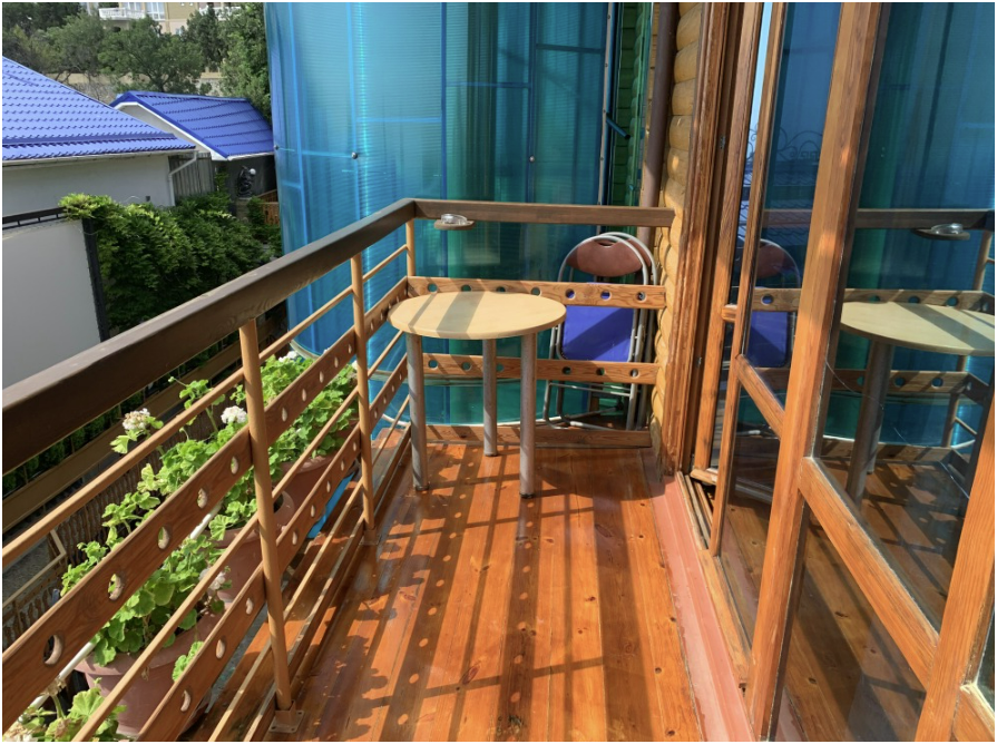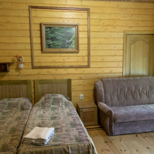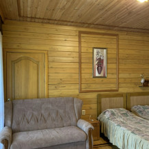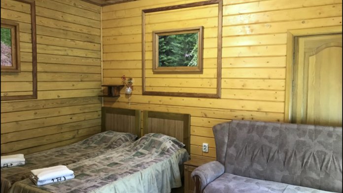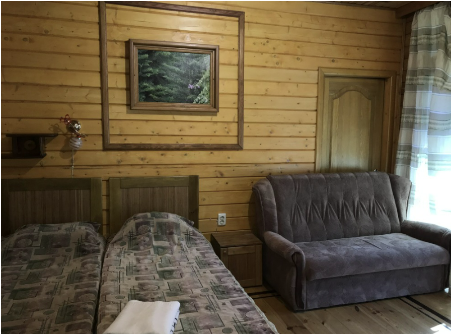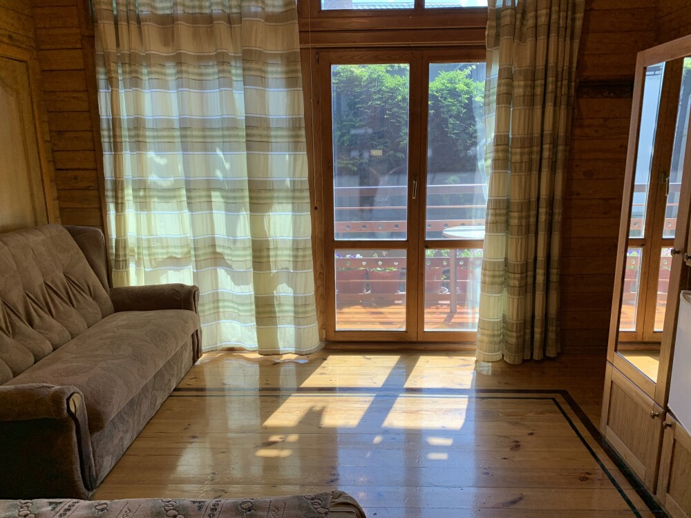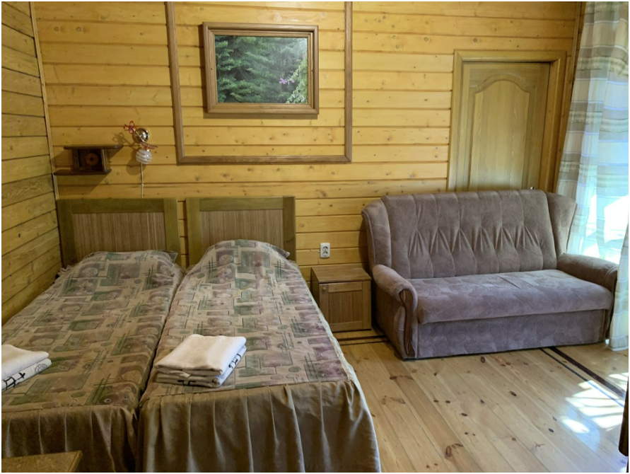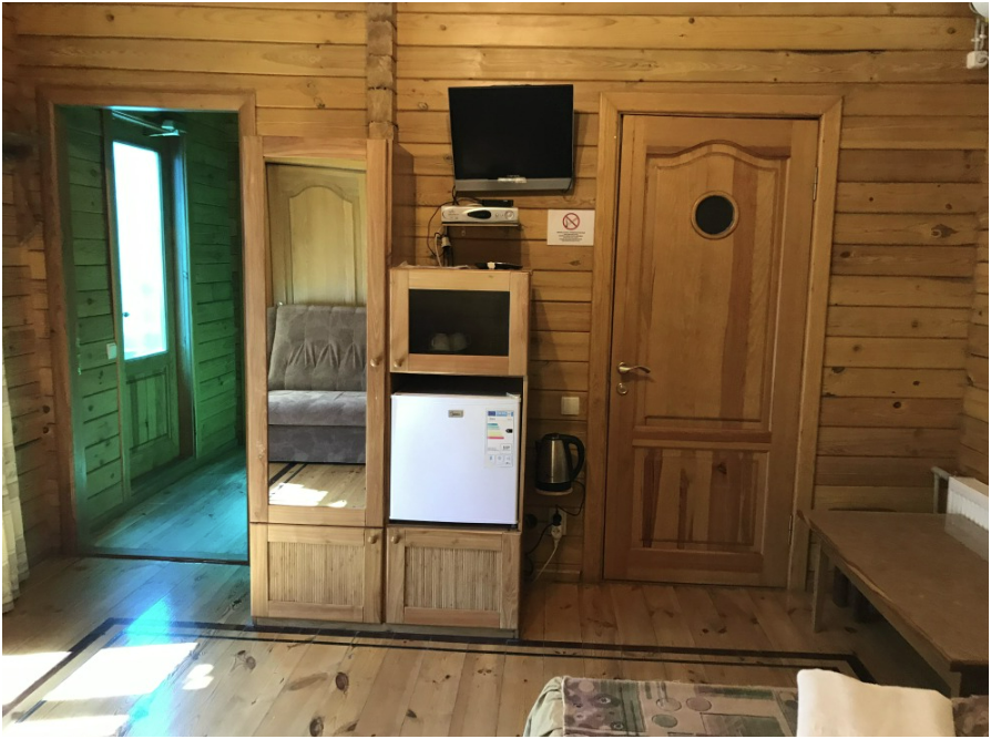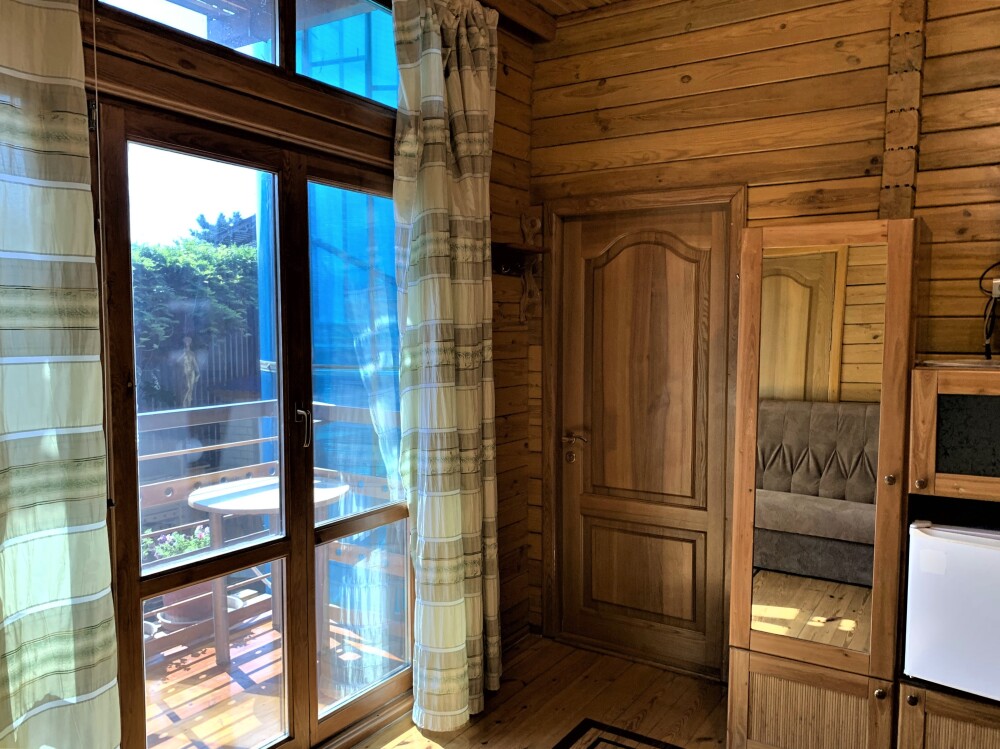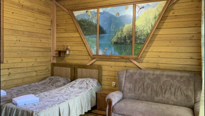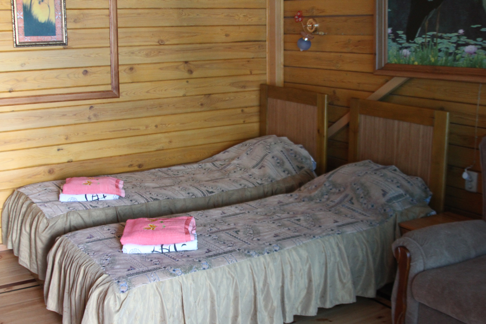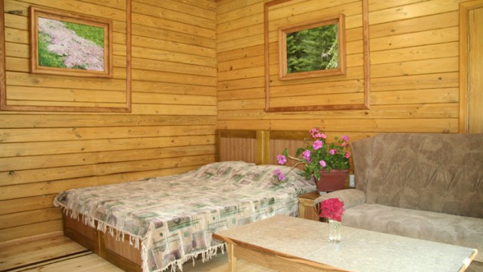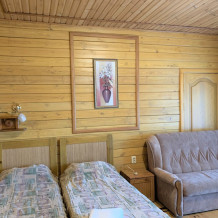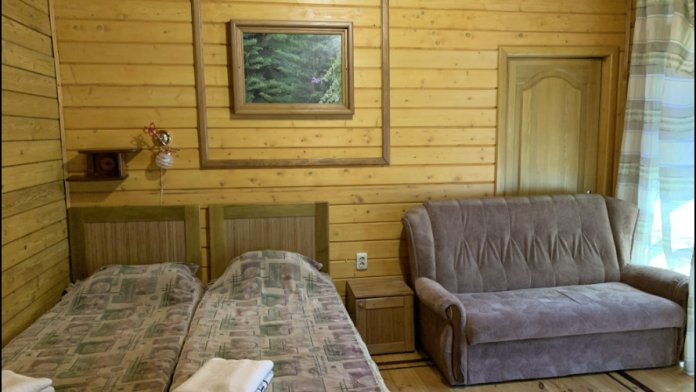 Просторный номер состоит из одной комнаты с санузлом. В комнате две односпальные кровати и большой диван. Журнальный столик, шкаф, тумба. Телевизор, кондиционер, холодильник, чайник. В санузле: душ, раковина, унитаз. Стиральная машинка и гладильная доска предоставляются. Есть место где пообедать, приготовить шашлык. Действующий бассейн с горкой для детей. Есть бильярд. По вечерам показываем фильмы на большом экране. Можно смотреть с балкона. Есть соляная комната, для улучшения работы органов дыхания