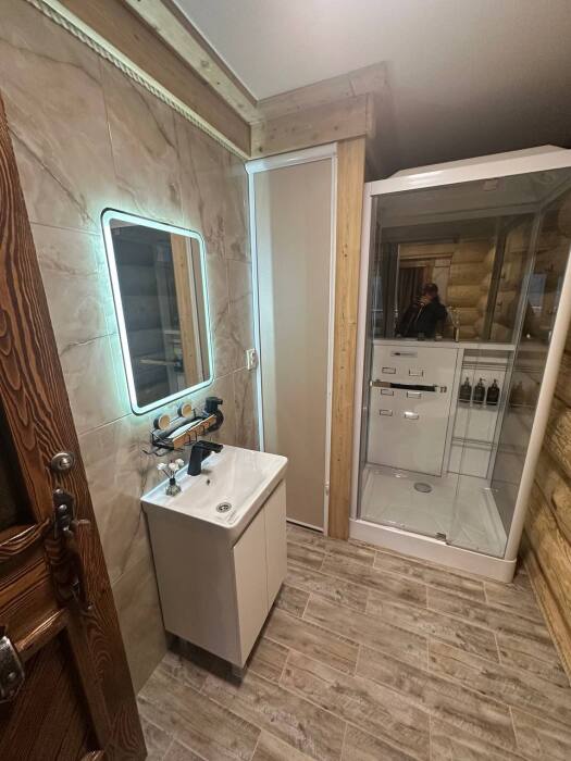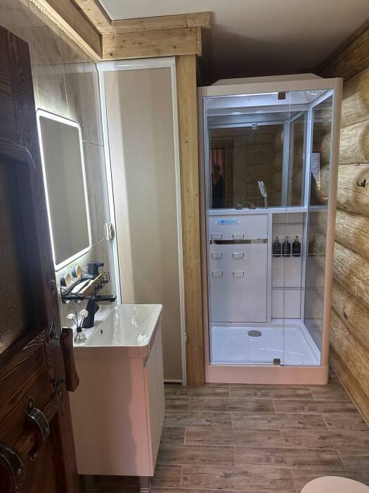 Индивидуальная ванная комната: душ, раковина, туалет.