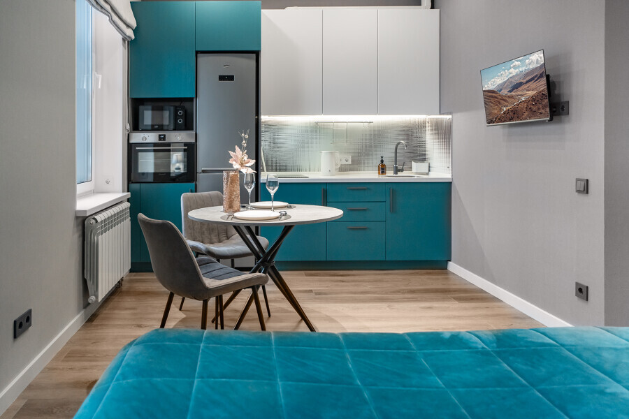 - Кухня (плита, холодильник, стиральная машина, микроволновая печь, чайник, духовой шкаф, посуда, столовые приборы).