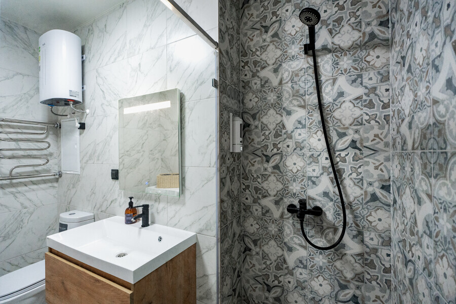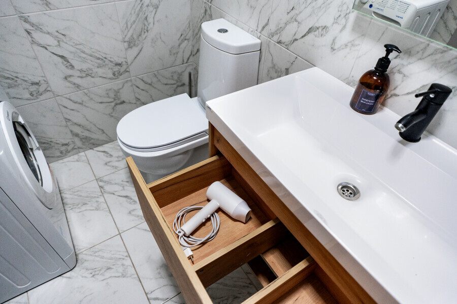 - Душевая кабина, необходимые бытовые приборы: фен, гладильная доска и утюг.
