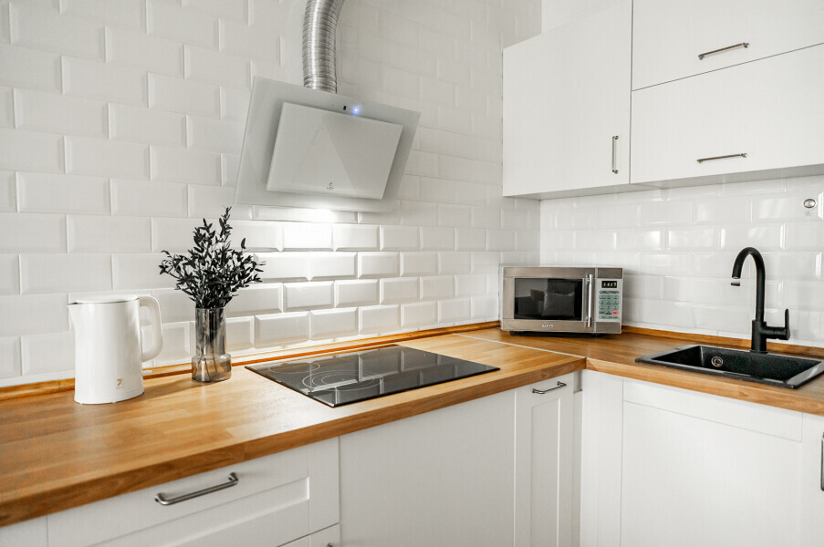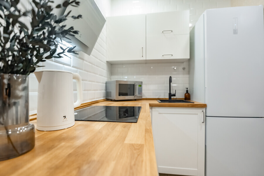 - Кухня (плита, холодильник, стиральная машина, микроволновая печь, чайник, посуда, столовые приборы).