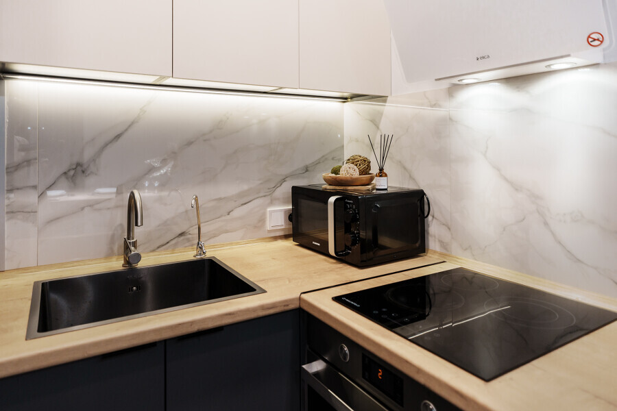 - Кухня (плита, холодильник, стиральная машина, микроволновая печь, чайник, посуда, столовые приборы).