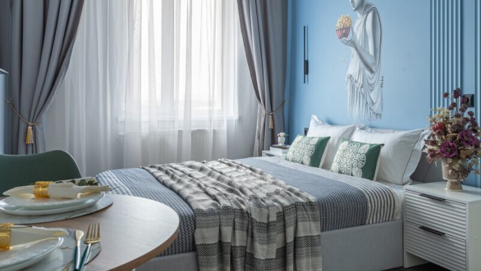 Каждая студия оформлена в неповторимом греческом стиле. Особенность интерьера — роспись ручной работы, посвященная одному из богов Олимпа. Это не просто место для проживания, это погружение в атмосферу мифов и эстетики.