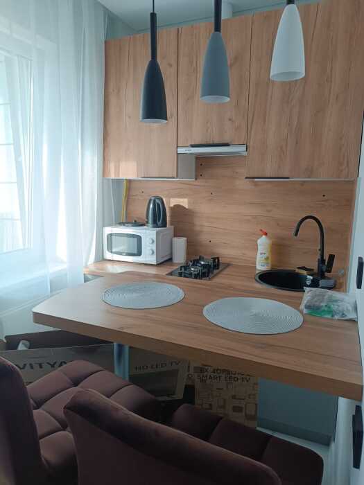 Двуспальная кровать, телевизор, Wi-Fi, полностью оборудованная кухня: плита, чайник, холодильник, вся необходимая посуда и принадлежности. Стиральная машина, утюг, фен. Чистое постельное бельё.