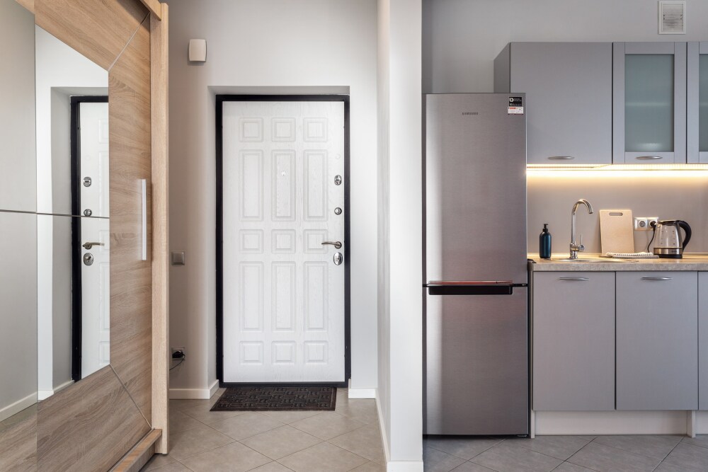 Кухня оснащена: холодильником, плитой, микроволновой печью, электрическим чайником.