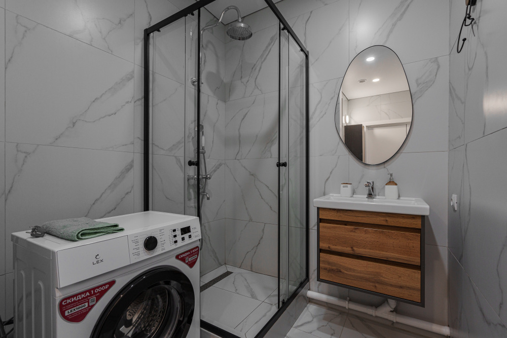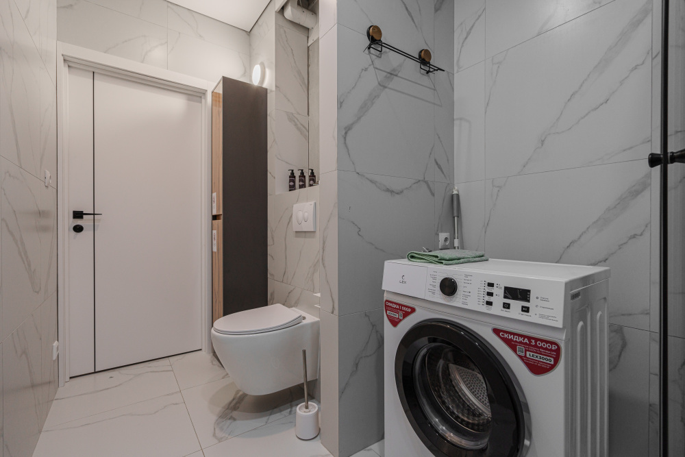 Полный комплект техники: надежная стиральная машина, мощный утюг, удобная гладильная доска, быстрый фен.