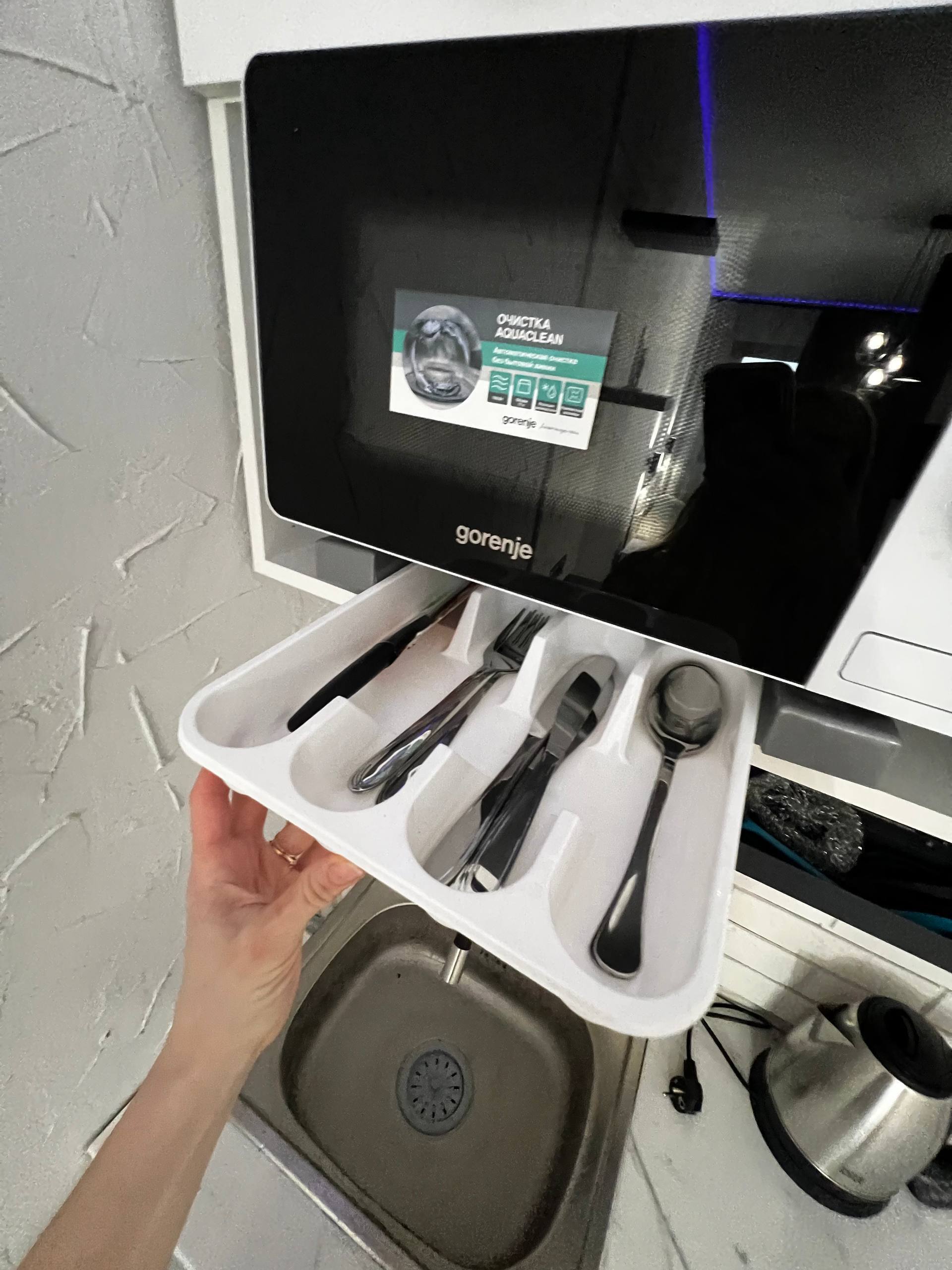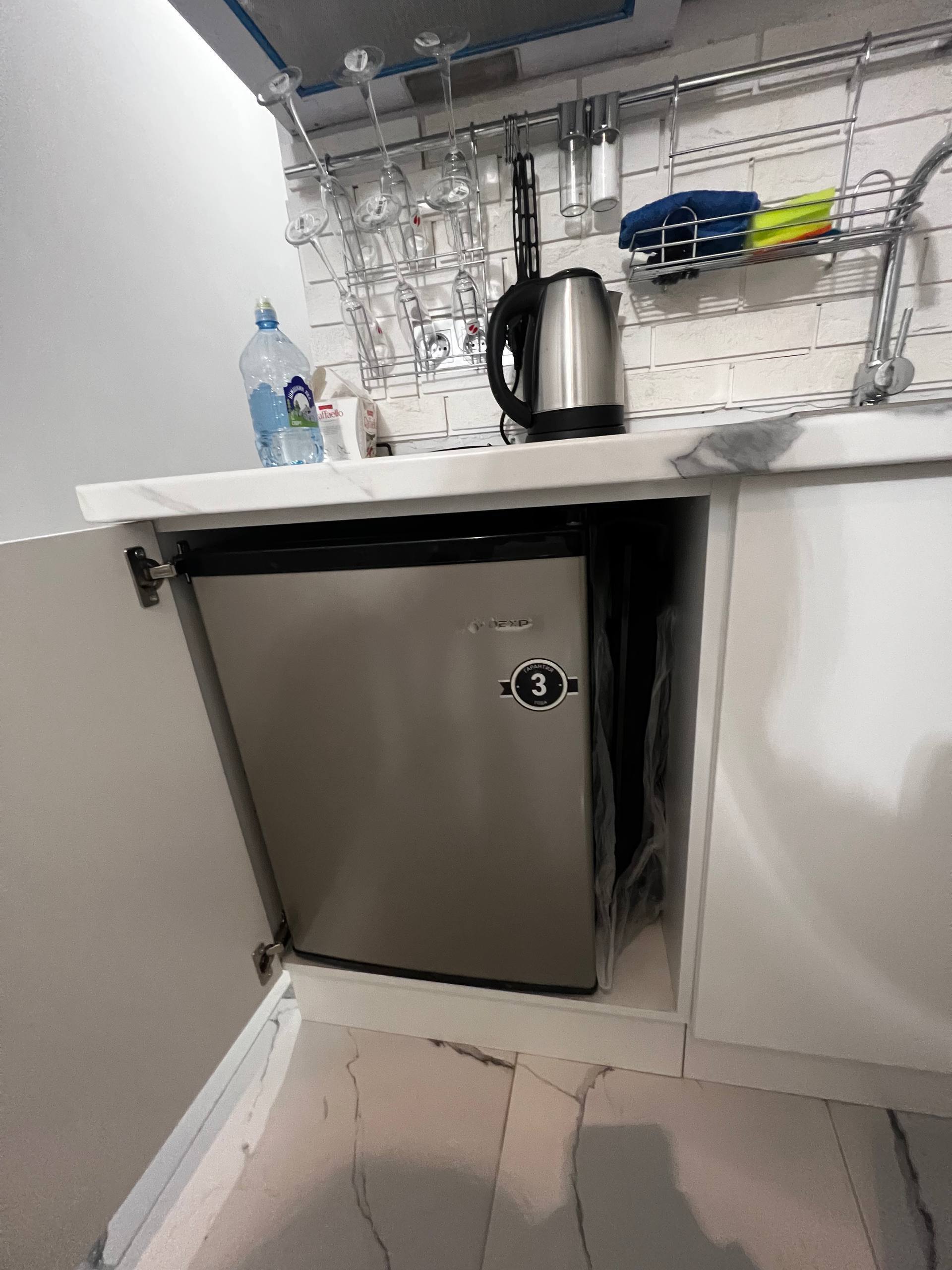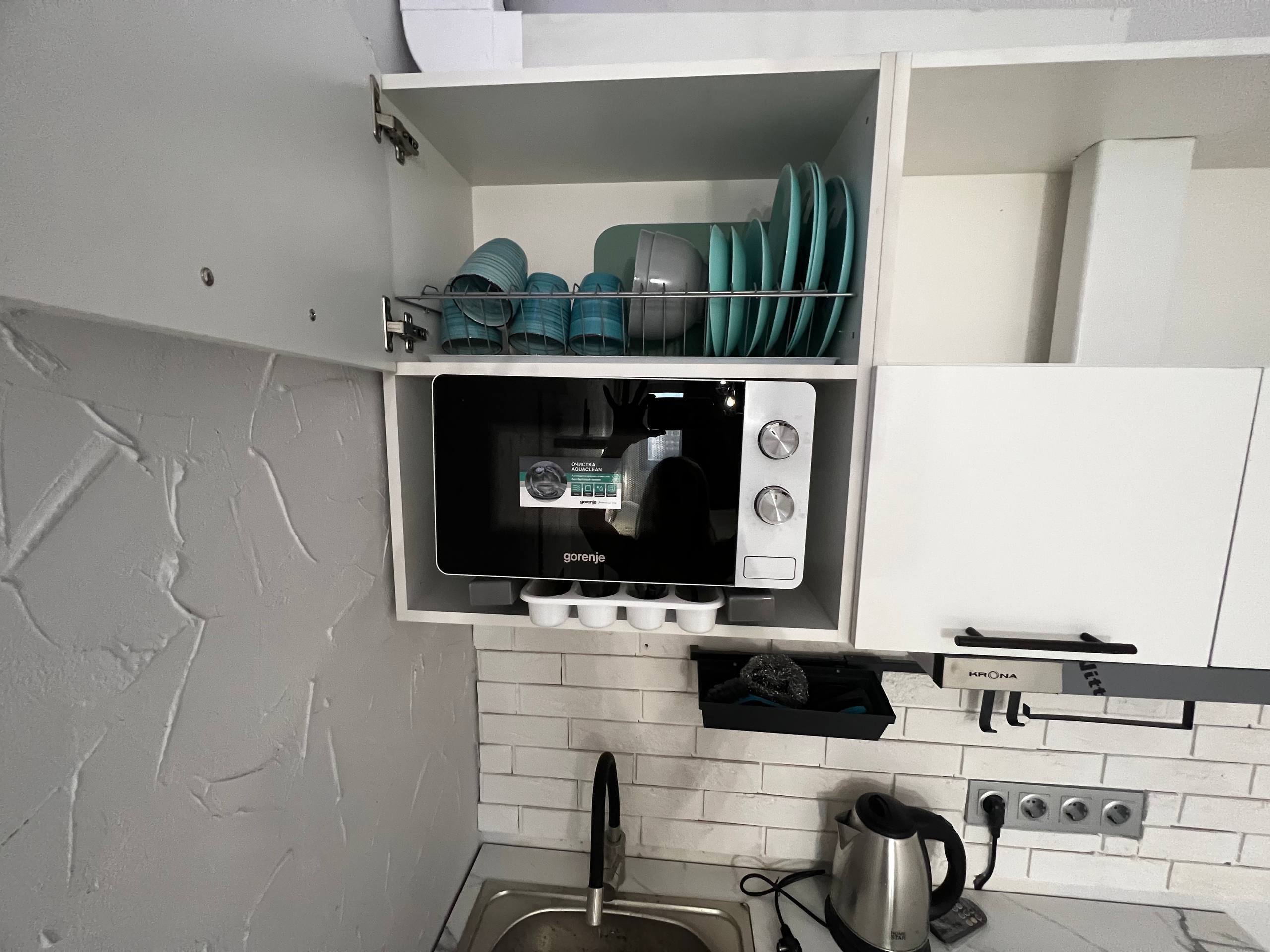 После прохода в основную студию слева располагается кухонная гарнитура, где можно легко приготовить ужин. Кухонная гарнитура оборудована компактной 2-конфорочный сенсорной плитой, чайником, чашками, посудой, бокалами, все и столовыми приборами, а также кастрюлей и сковородкой.