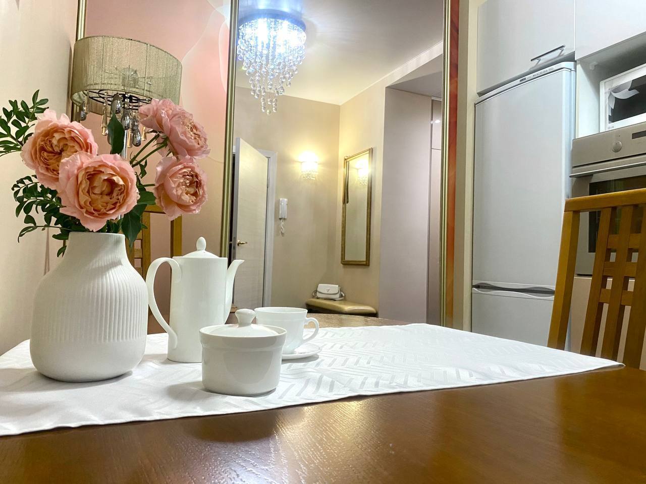 Кухня обустроена всем необходимым: духовой шкаф, чайник, фильтр для воды, капельная кофеварка, набор посуды для приготовления и сервировки.