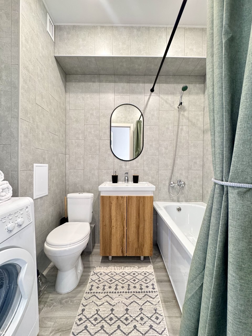 В квартире предусмотрены удобные спальные места: двуспальная кровать в спальной зоне и раскладывающийся диван в гостиной, обеспечивающий дополнительный комфорт. Полностью оборудованная кухня оснащена всем необходимым для приготовления и сервировки блюд. В ванной комнате установлена просторная ванна, подготовлены белоснежные полотенца и все средства личной гигиены.