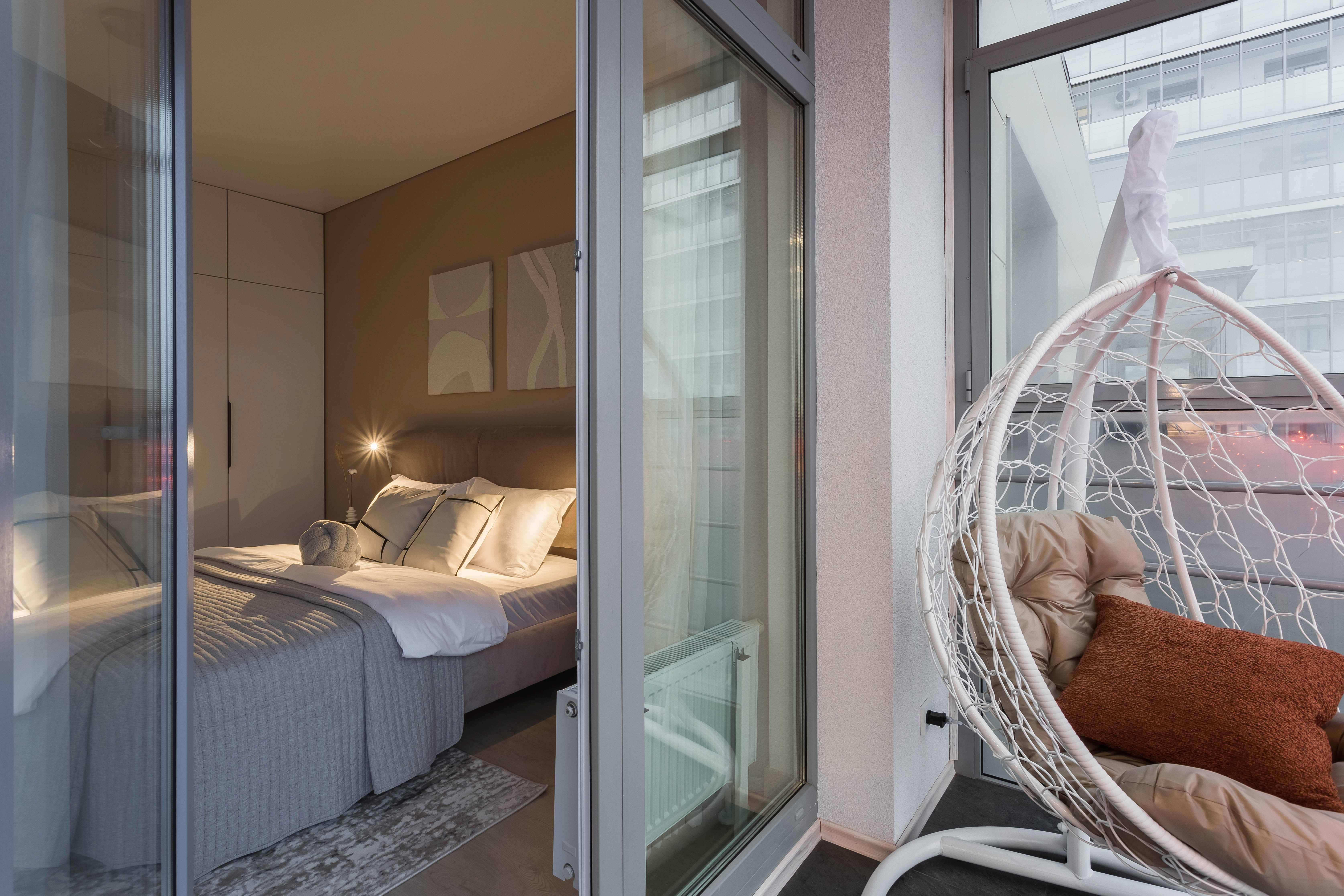 Спальня-мечты. Погрузитесь в глубокий сон на качественном ортопедическом матрасе. Утром к туалетному столику, а затем прямо на балкон, чтобы вдохнуть озерный воздух полной грудью. Телевизор для вечернего просмотра в уюте.