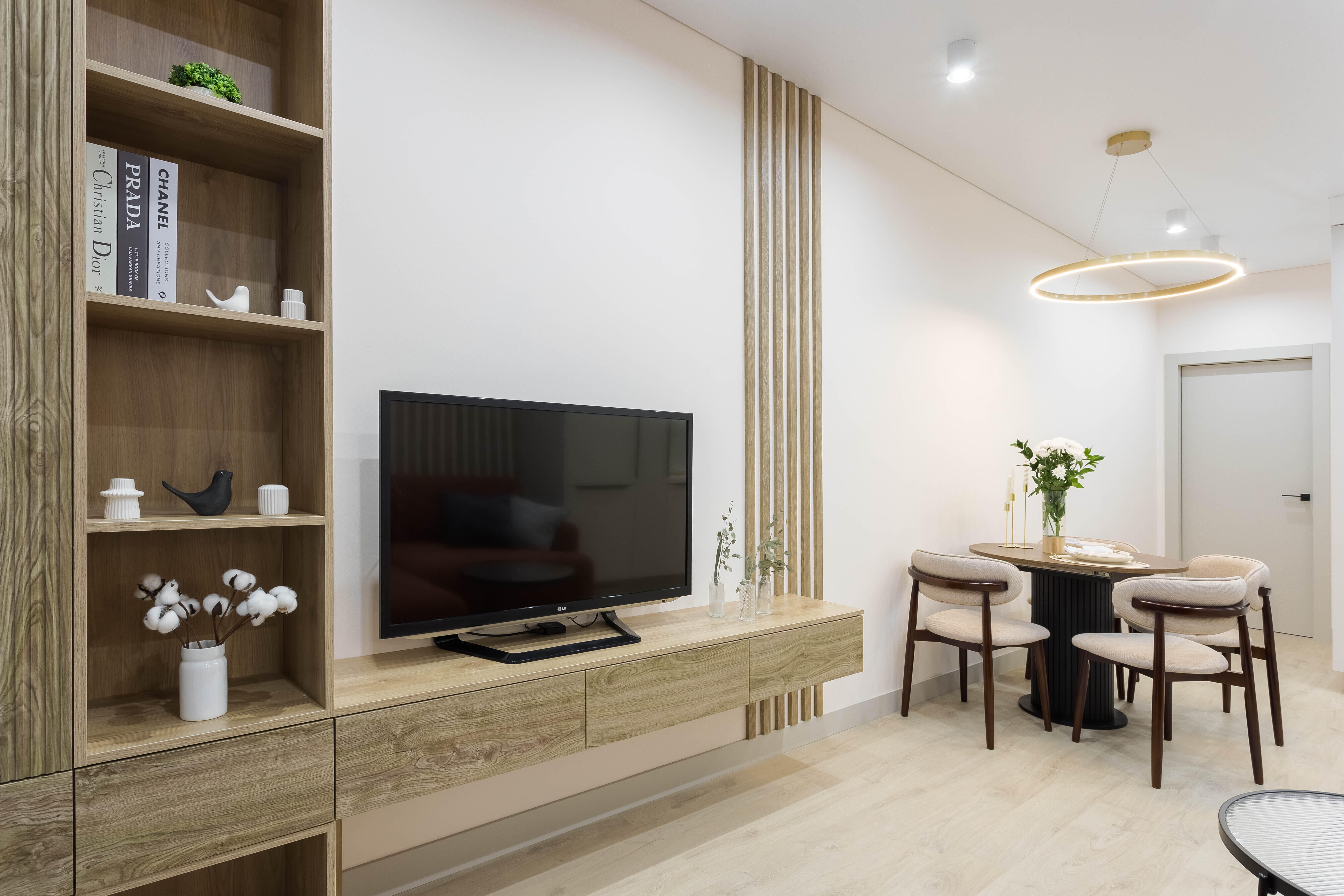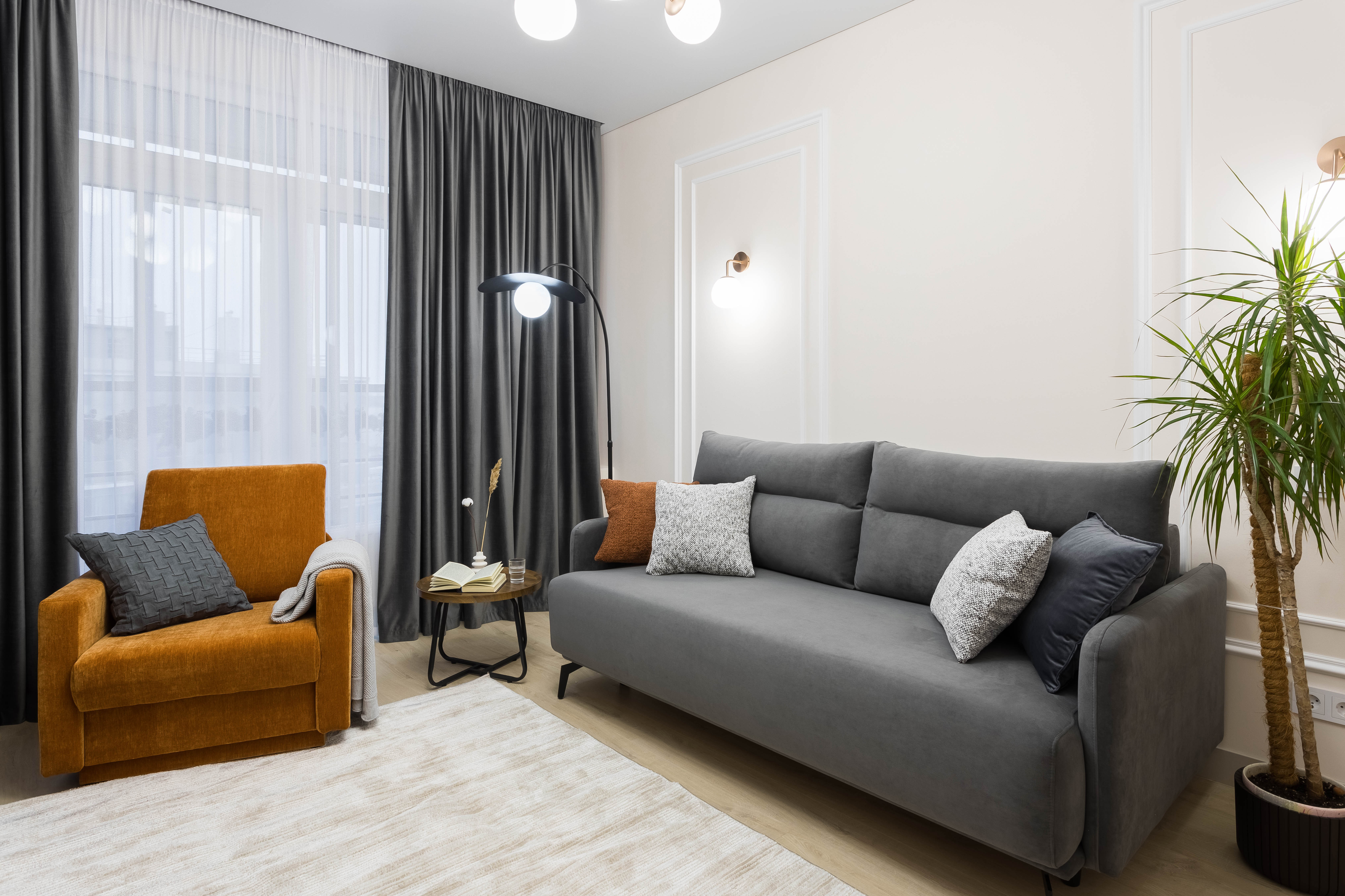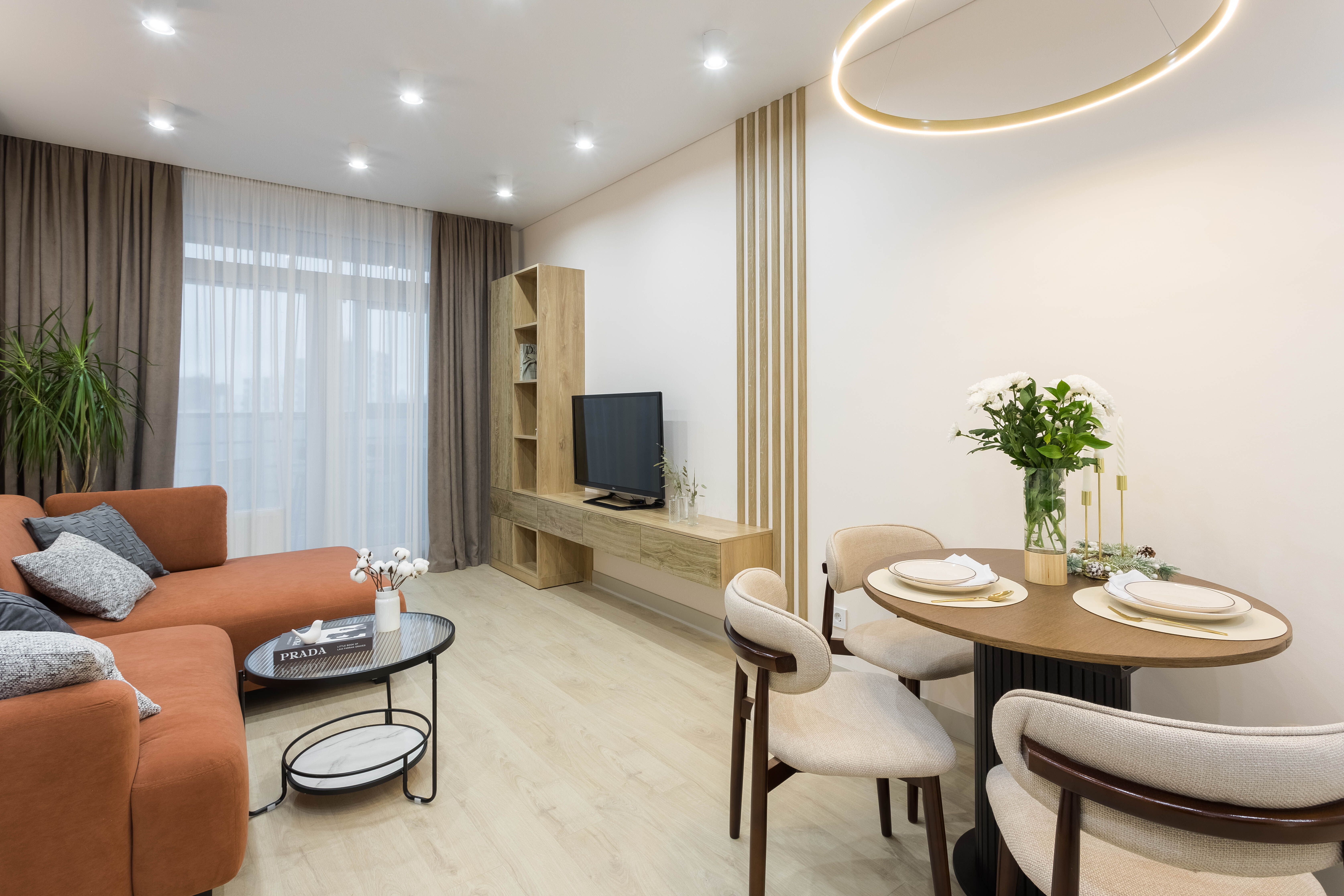 Уникальный каминный зал. Настоящая душа этой квартиры. Мягкий свет электронного камина создаёт неповторимую атмосферу для романтического вечера или душевных разговоров. Здесь же раскладывающийся диван и кресло-кровать для дополнительных гостей.