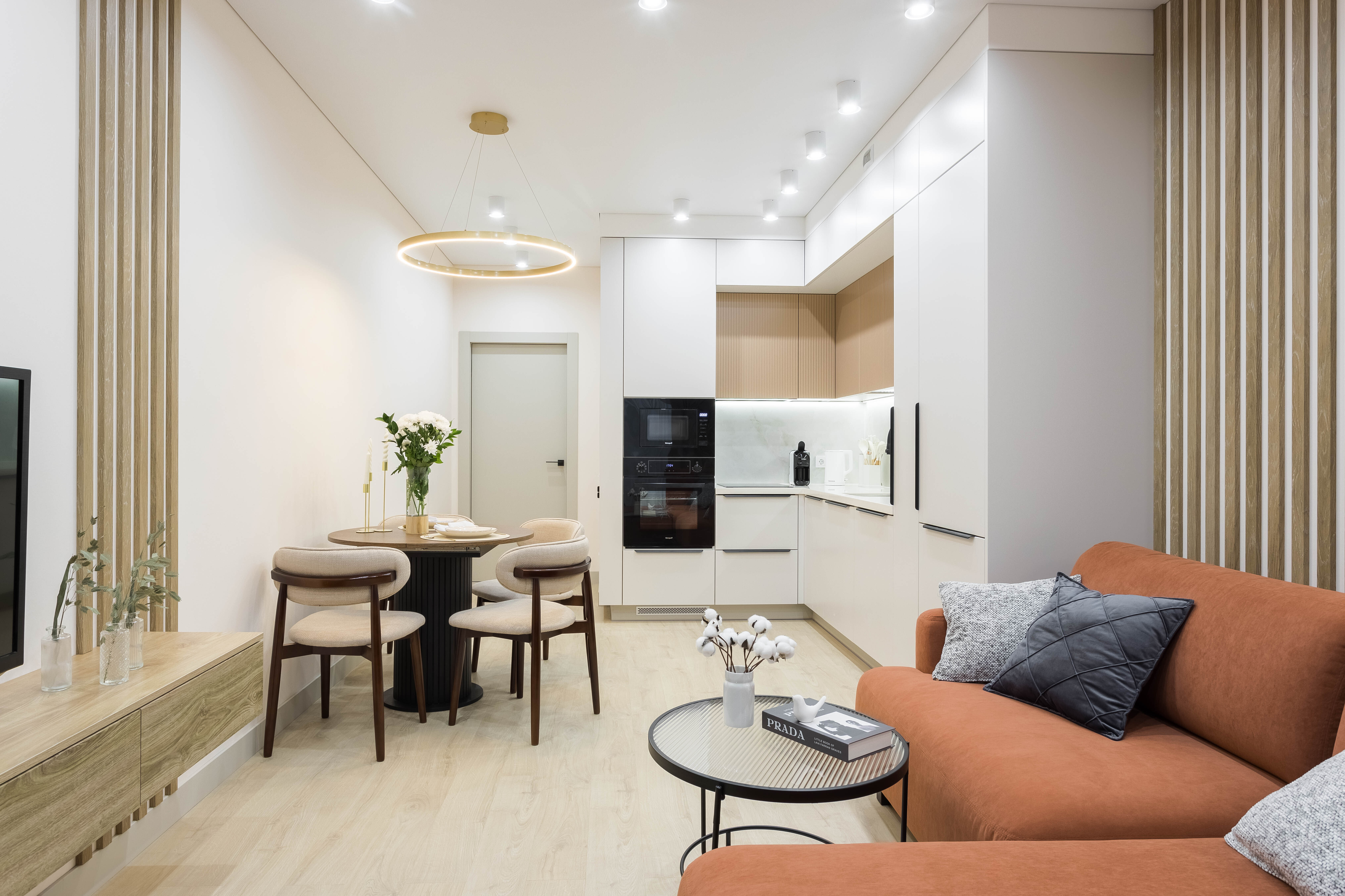 Сердце дома — кухня-гостиная. Просторная, светлая, оснащённая всем необходимым для жизни и праздника. Ужин у окна, приготовленный в духовом шкафу, будет сервирован на красивой посуде. Капельная кофемашина с чаем ждёт вас каждое утро. А после трапезы просто загрузите всё в посудомоечную машину и наслаждайтесь отдыхом на удобном раскладном диване.