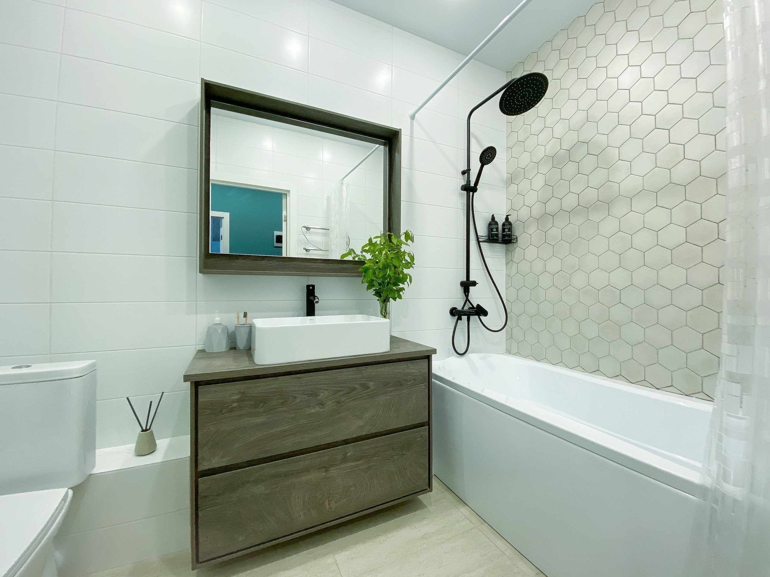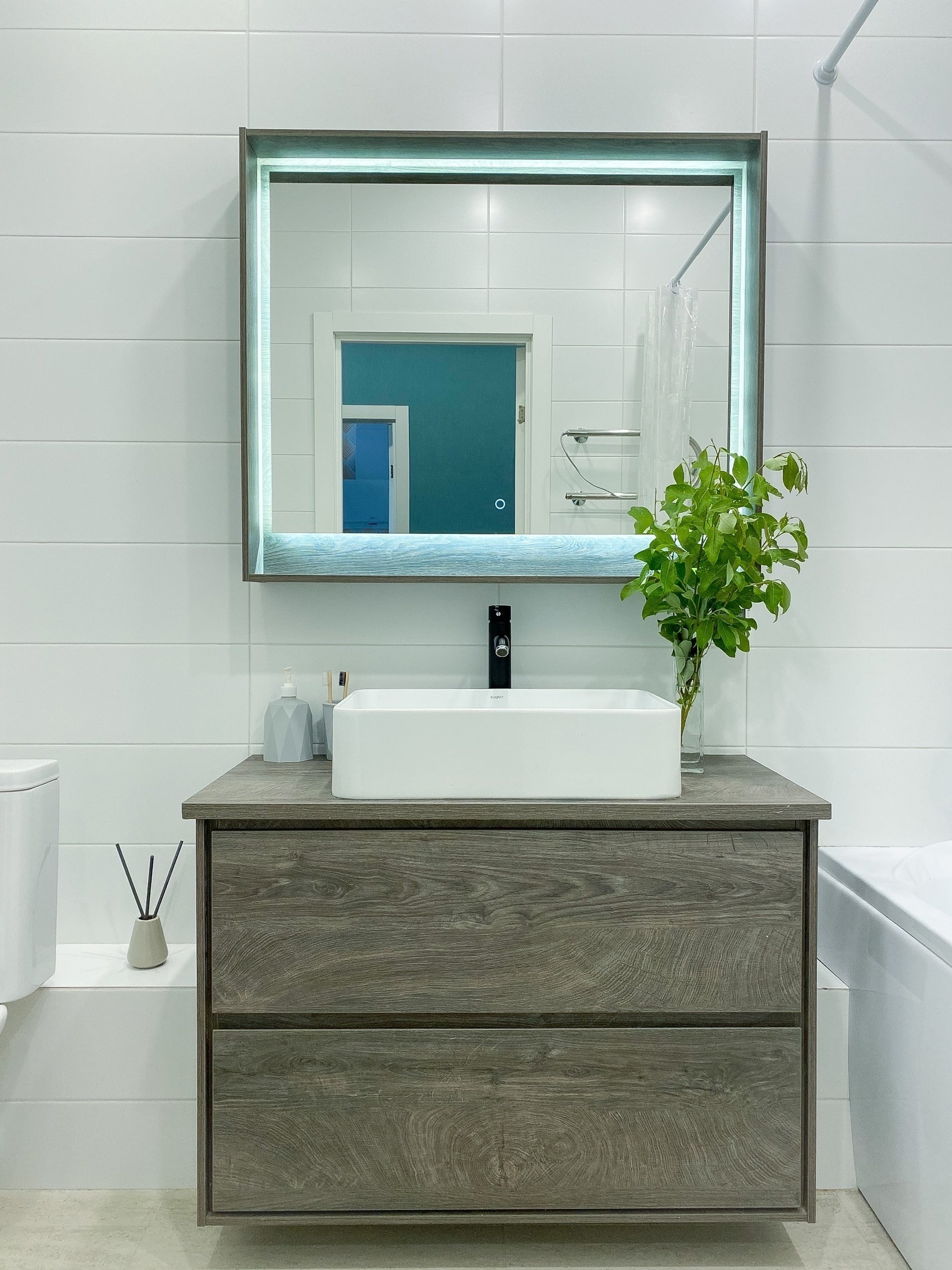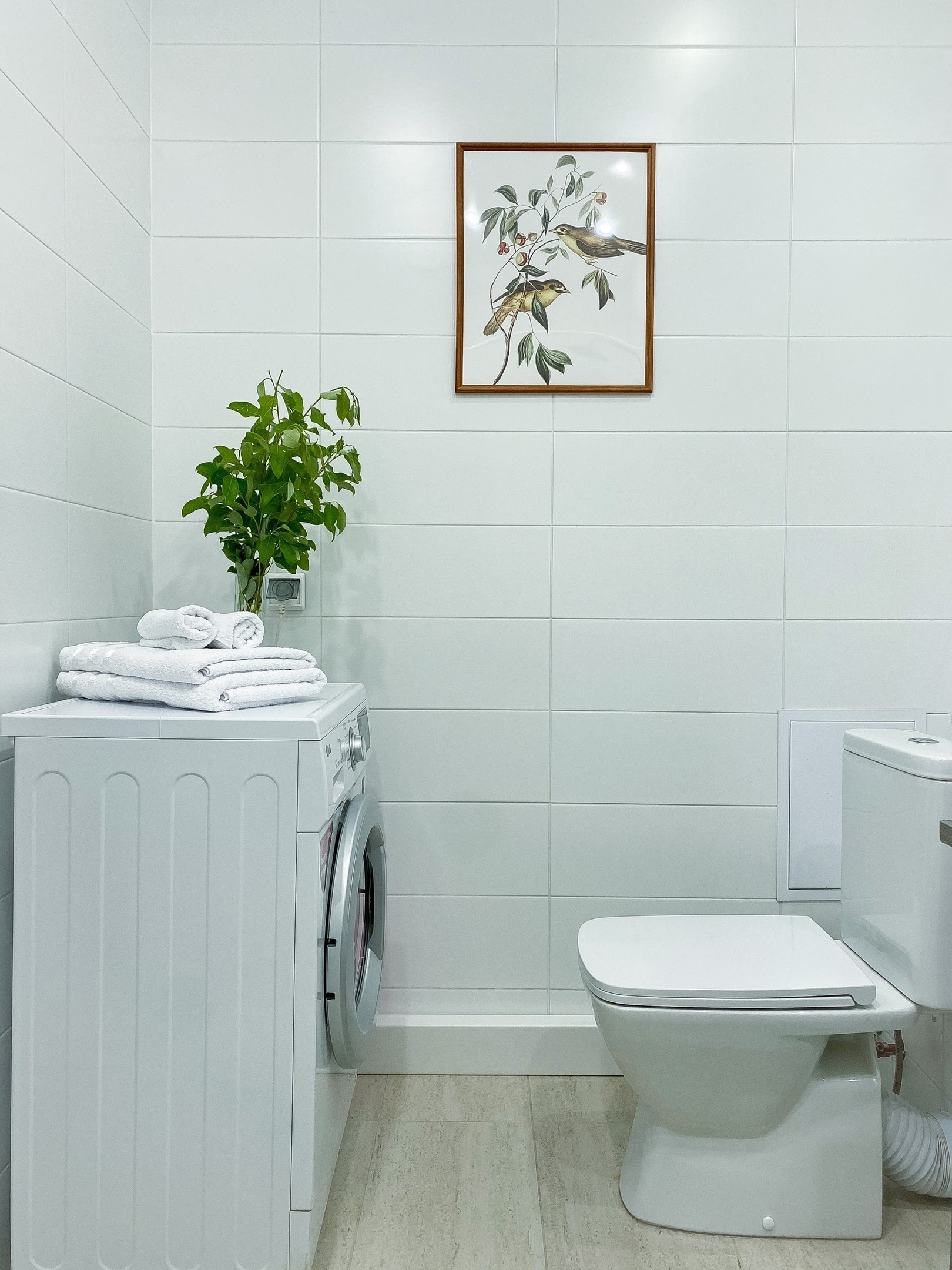 В ванной комнате удобная ванная, стиральная машина и необходимые предметы гигиены.