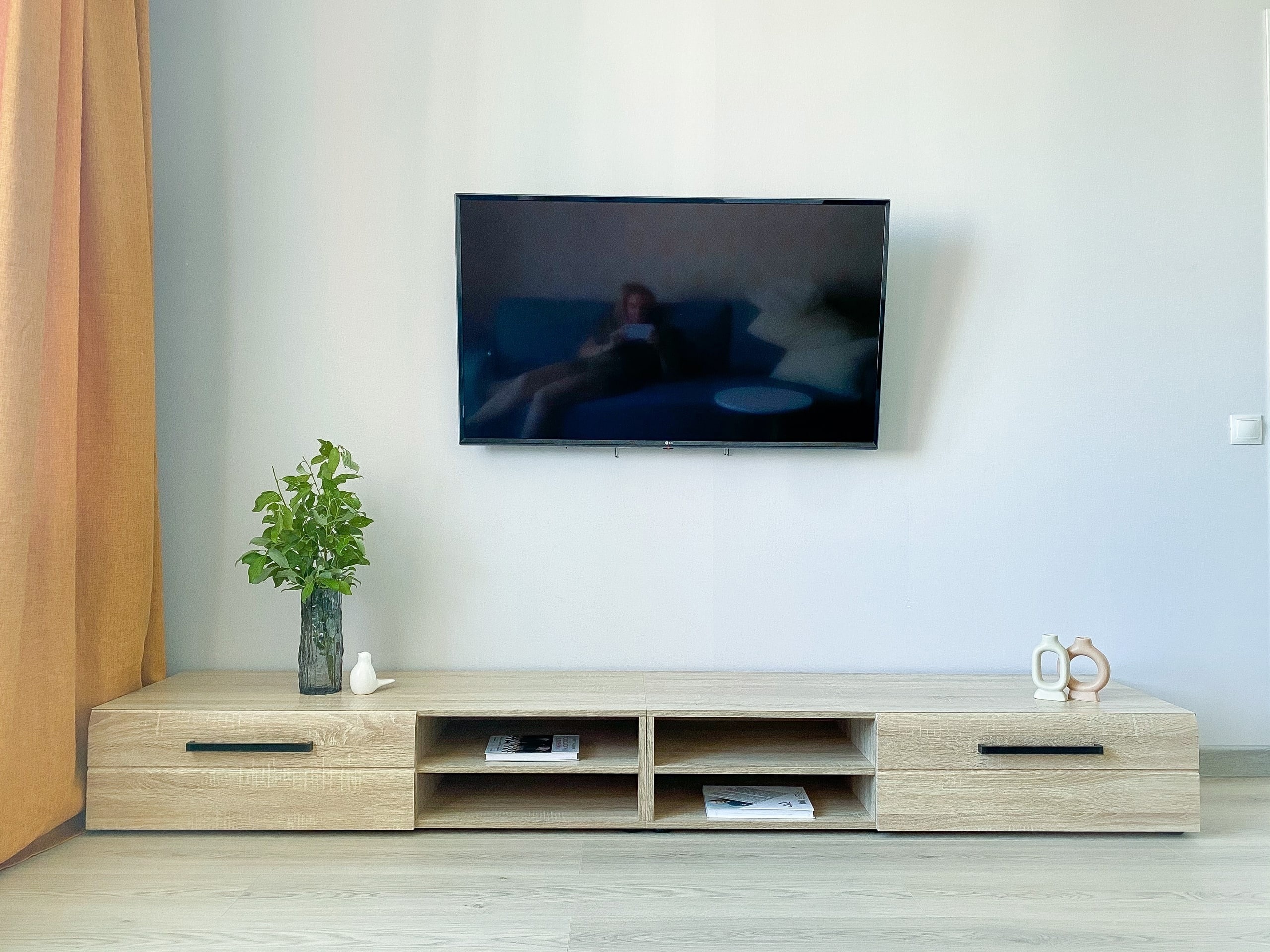 В гостиной комфортный диван-кровать, большой телевизор с кабельными каналами есть и в спальне.