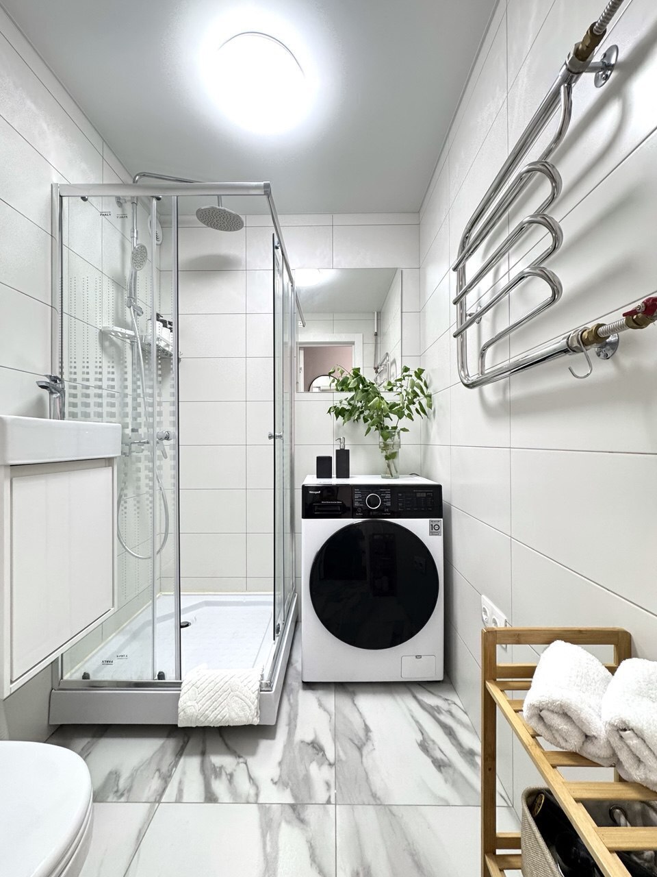 В ванной комнате Вас ждут гигиенический душ, белые полотенца, душевая кабина, фен и стиральная машина - всё для Вашего комфорта и гигиены.