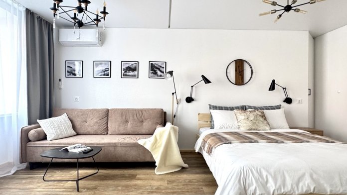 Просторная спальня с двуспальной кроватью обеспечит вам спокойный сон, а раскладной диван позволит разместить еще двоих гостей.