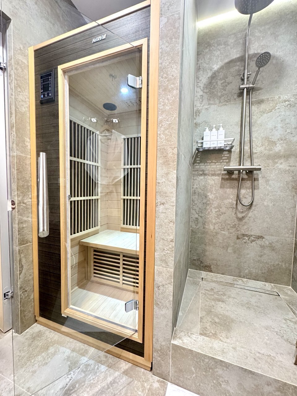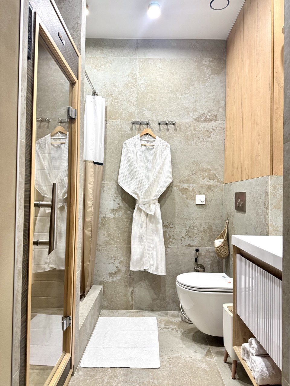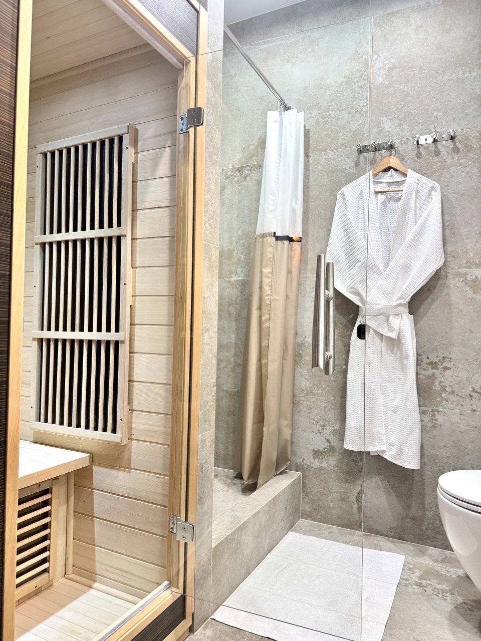 Собственная Финская Сауна! После долгого дня, почувствуйте, как уходит напряжение. Белоснежные халаты, тапочки и пушистые полотенца уже ждут Вас. Все банные принадлежности и средства гигиены – в Вашем распоряжении!