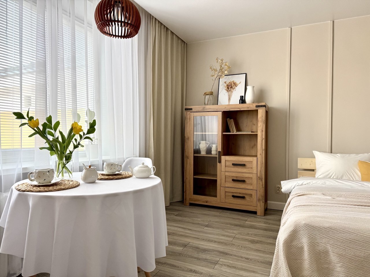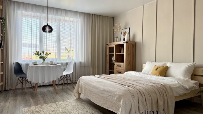 Апартаменты идеально подходят для двоих: Вас ждет удобная широкая кровать и уютная обеденная зона, где можно насладиться совместными трапезами.