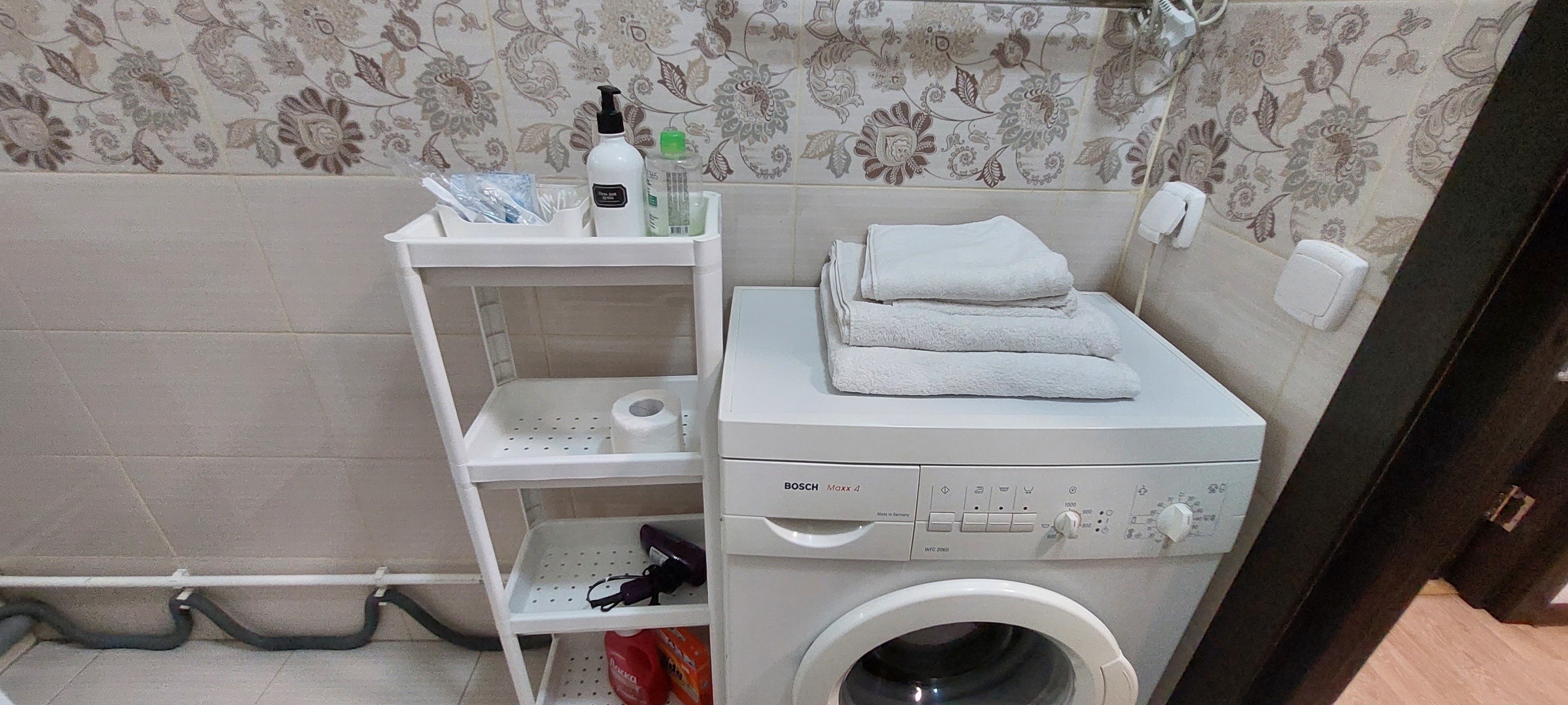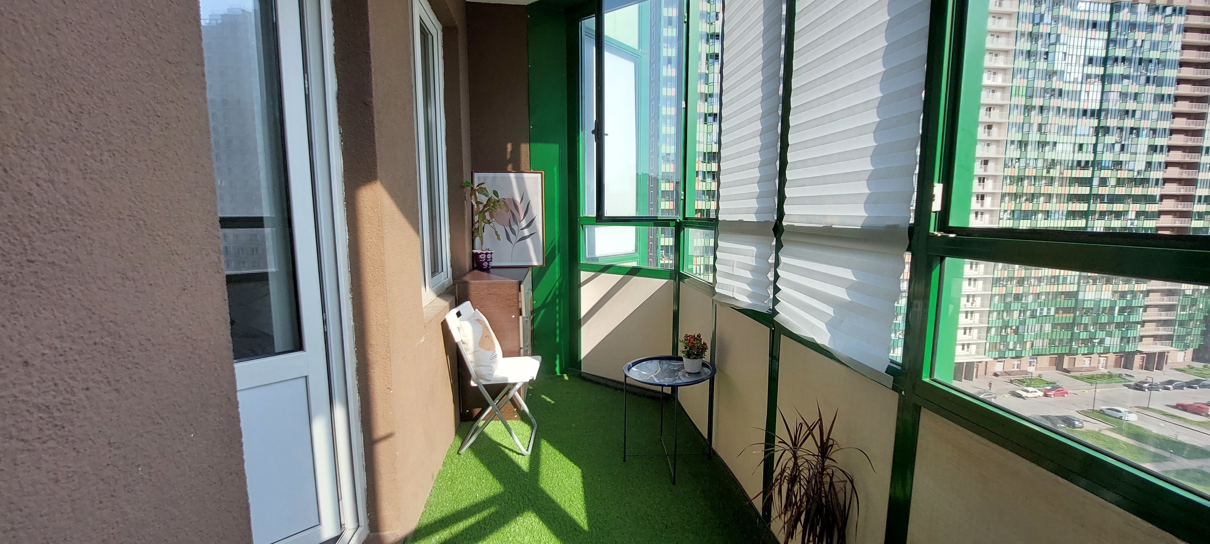 Кухня со всем необходимым, стиральная машина, двухкомфорочная плита и уютный балкон с зоной отдыха.