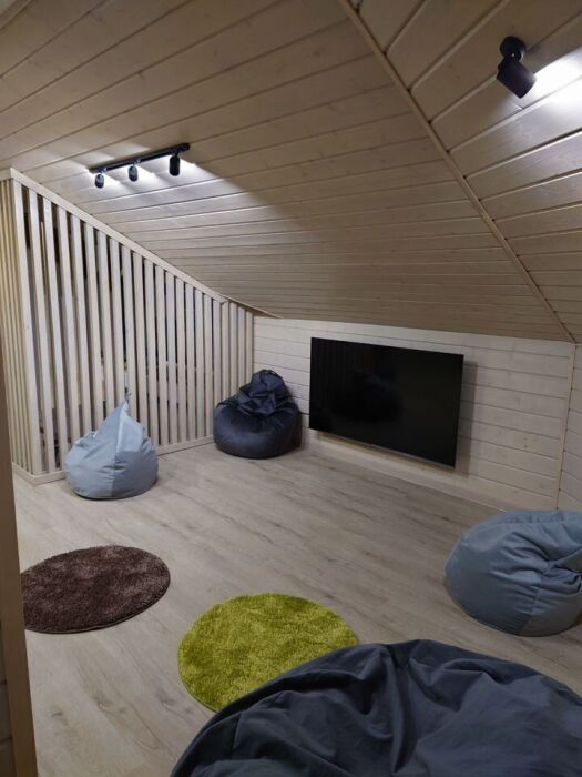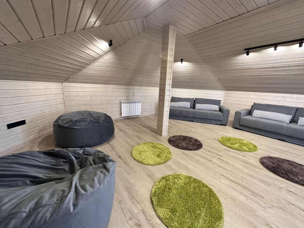 За дополнительную плату (1500 р./сутки за человека) возможно дополнительно разместить до 16 человек на мансардном этаже на больших мягких диванах и на втором этаже бани.