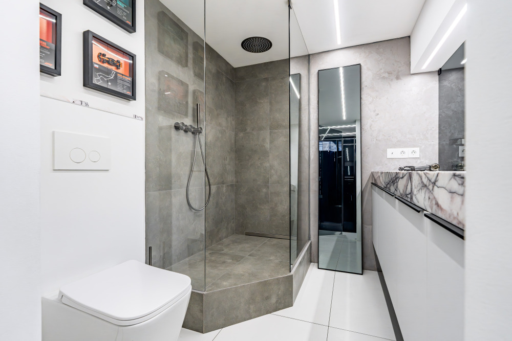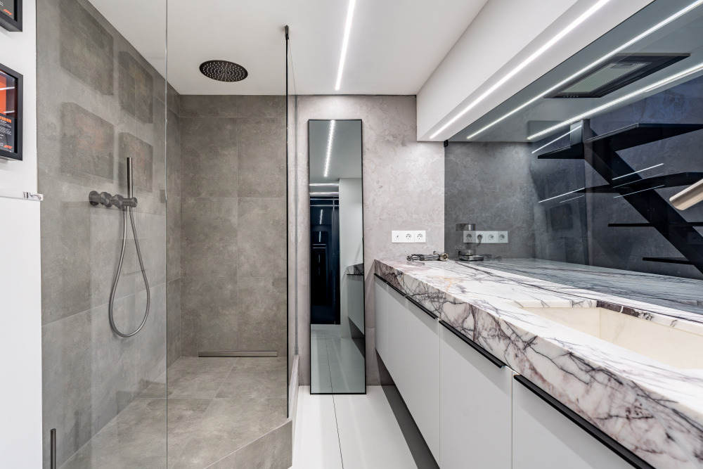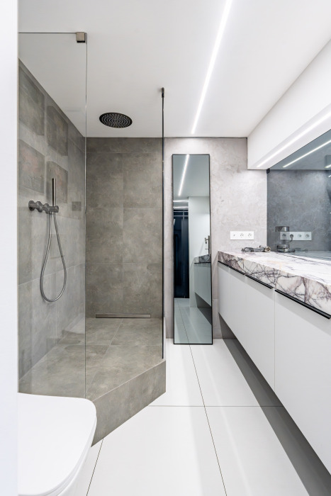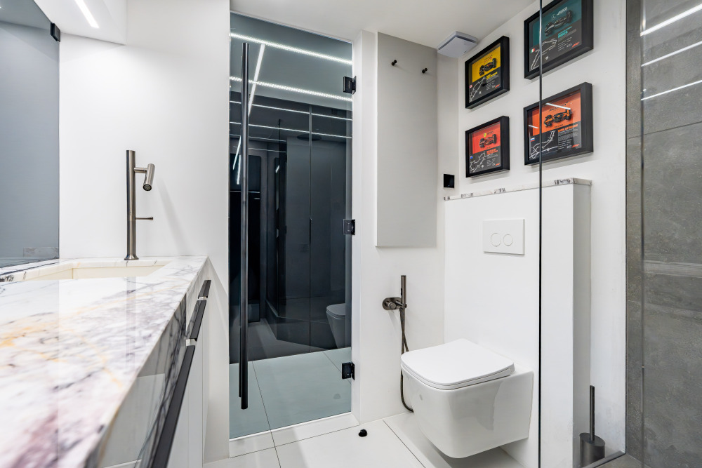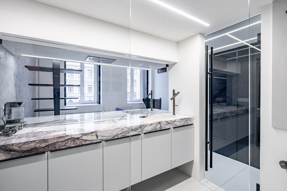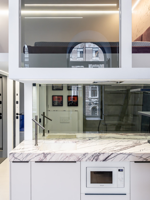 Просторный санузел, установлена современная бытовая техника. Кухонная зона оснащена мраморной столешницей, что добавляет ей элегантности.