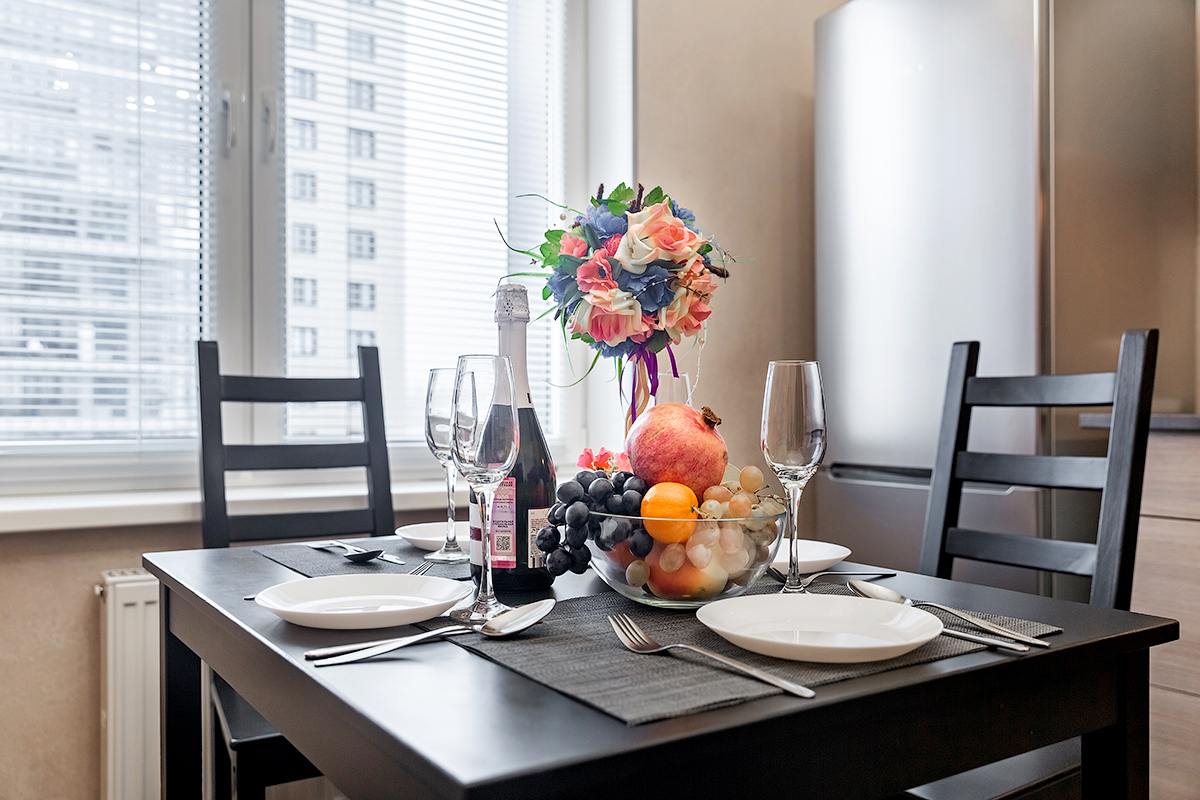 На кухне: холодильник, микроволновка, вся необходимая посуда.
