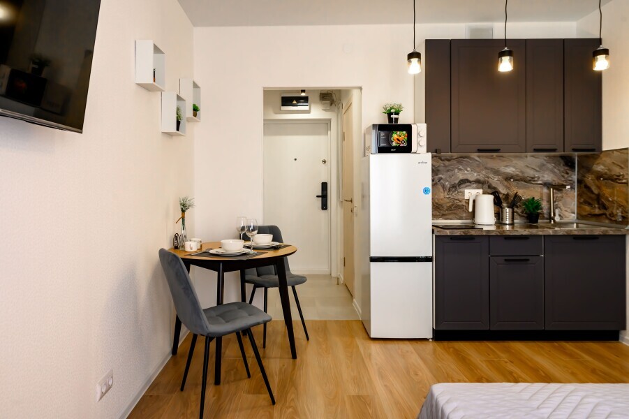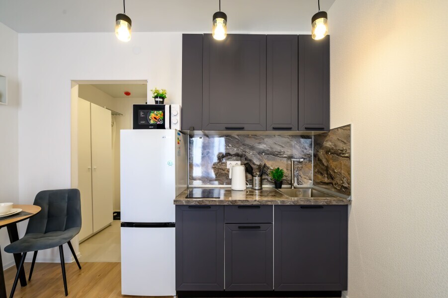 - Кухня с холодильником, плитой, микроволновкой, чайником и посудой.