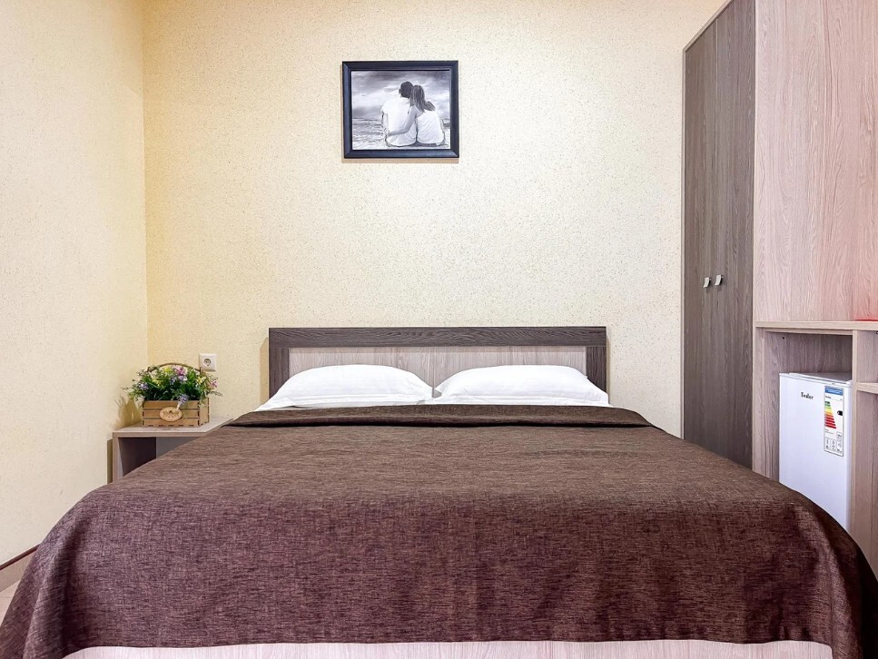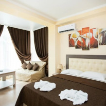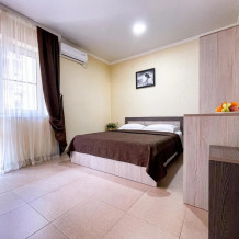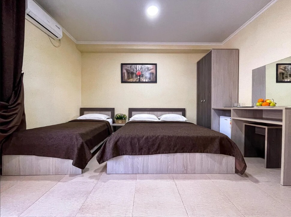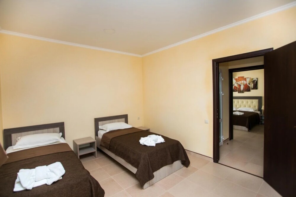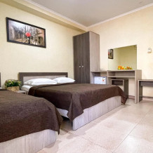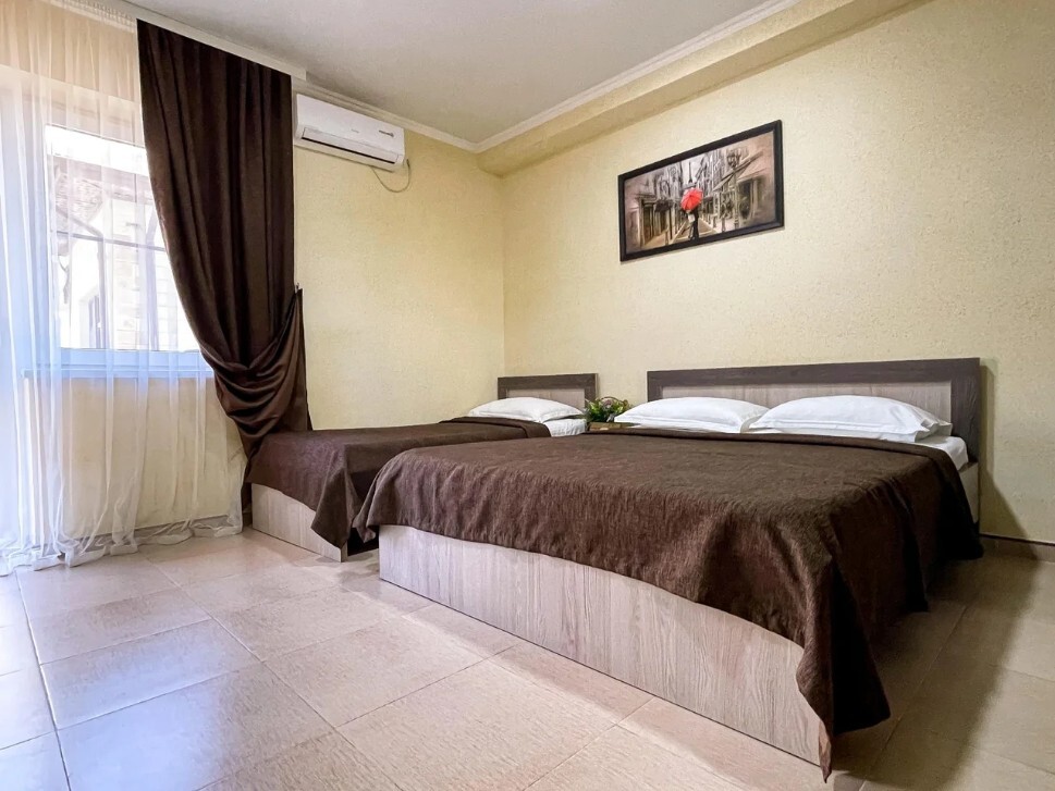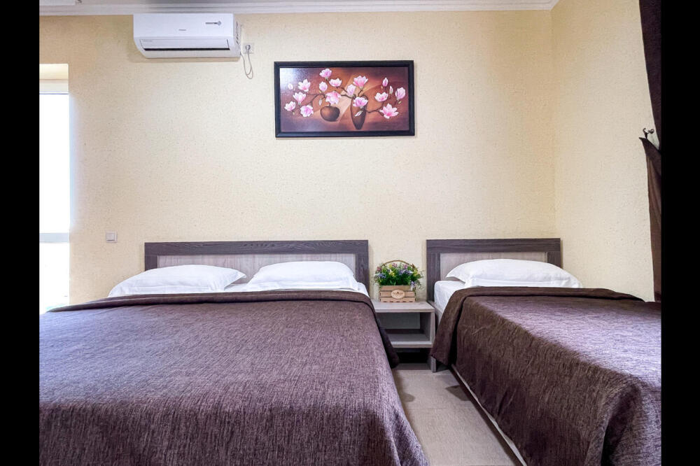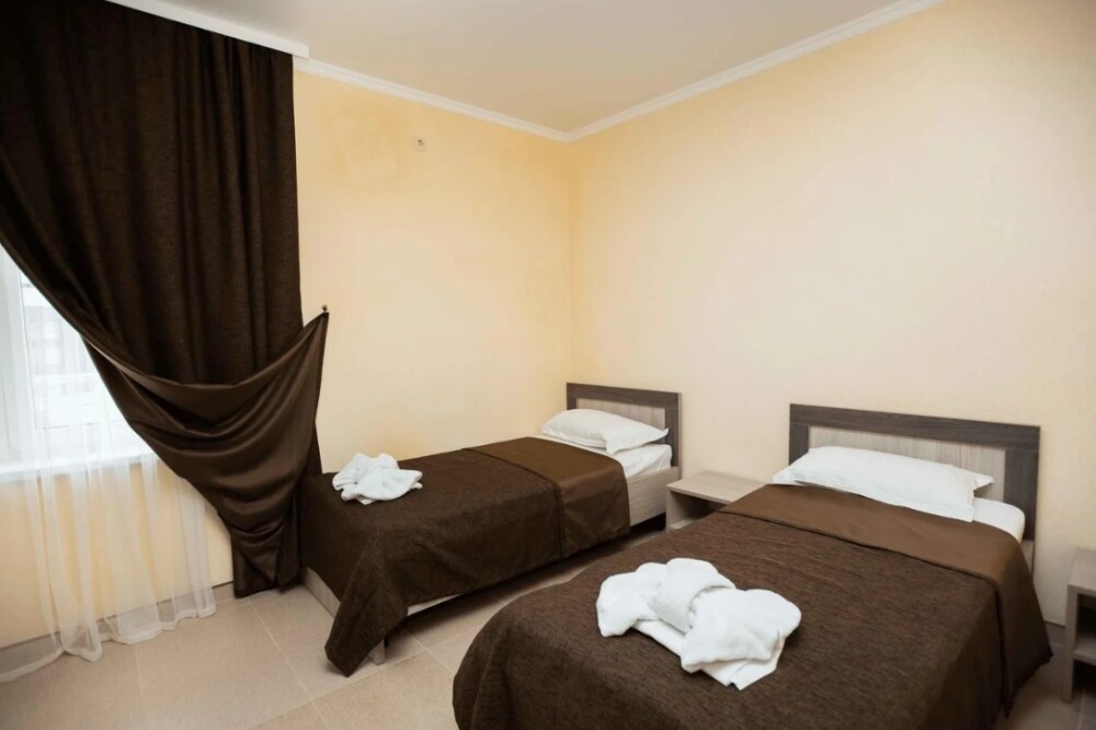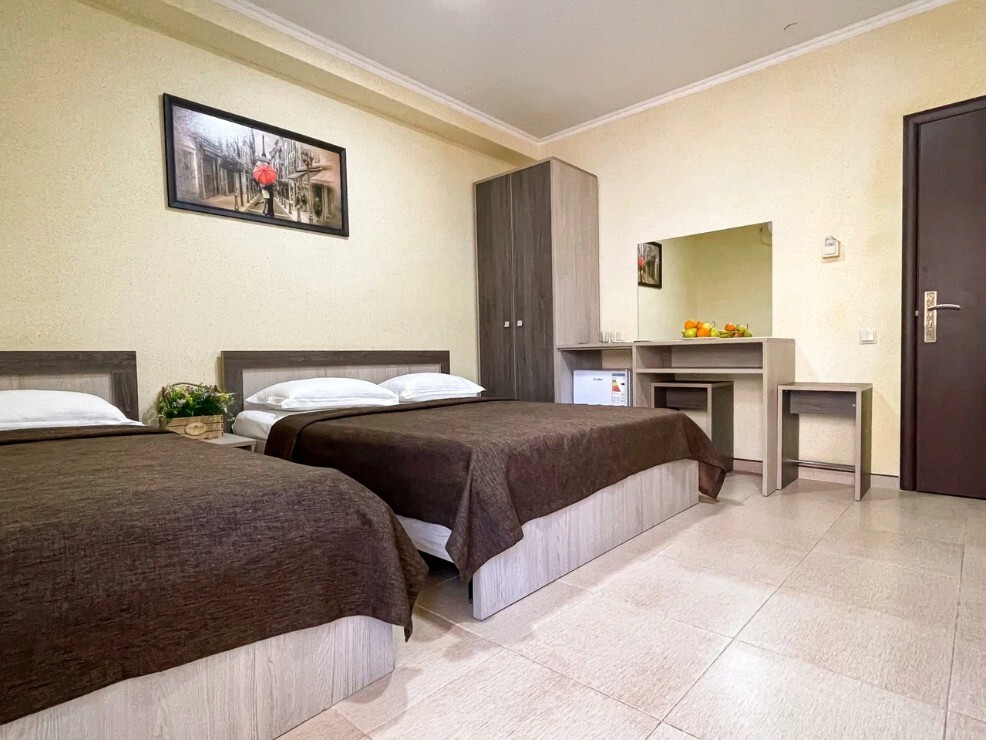 Двуспальная или две односпальные кровати (0,8*1,9м), дополнительное место еврораскладушка или детская кроватка бесплатно, душ, туалет, ТВ, холодильник, кондиционер, балкон.
