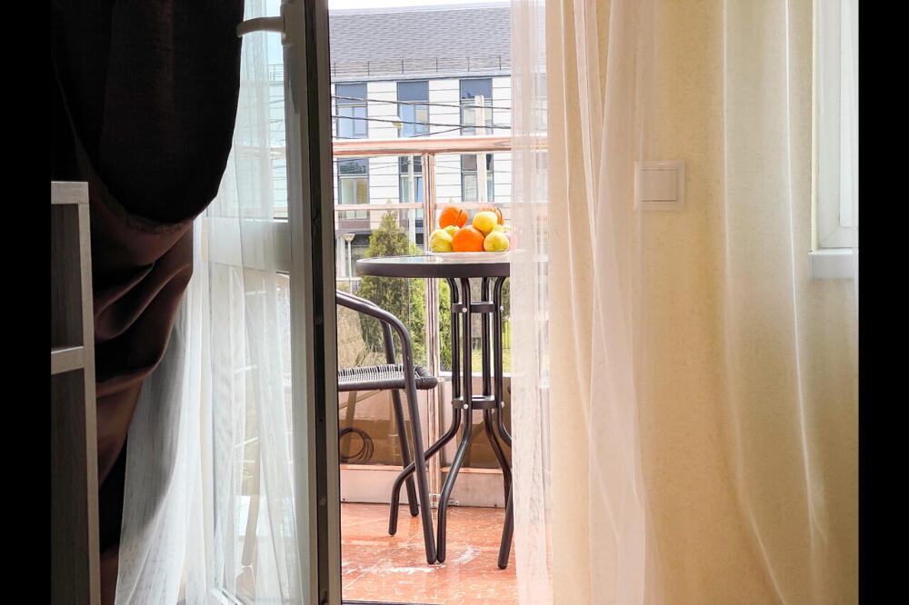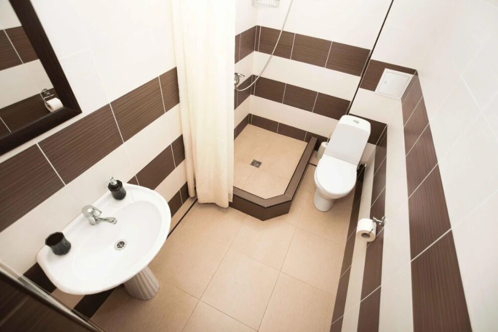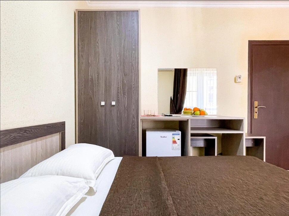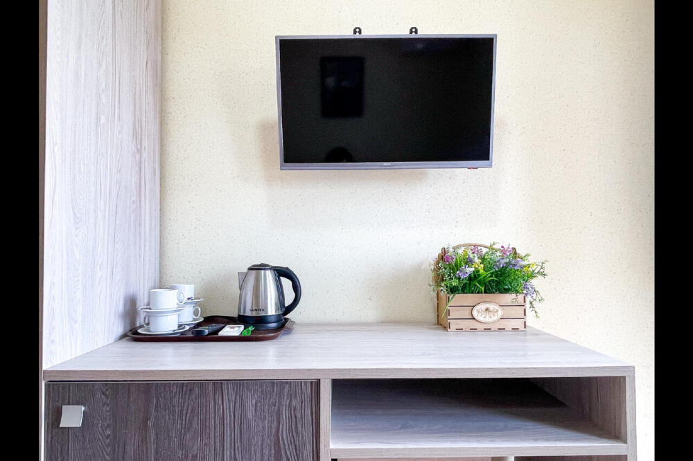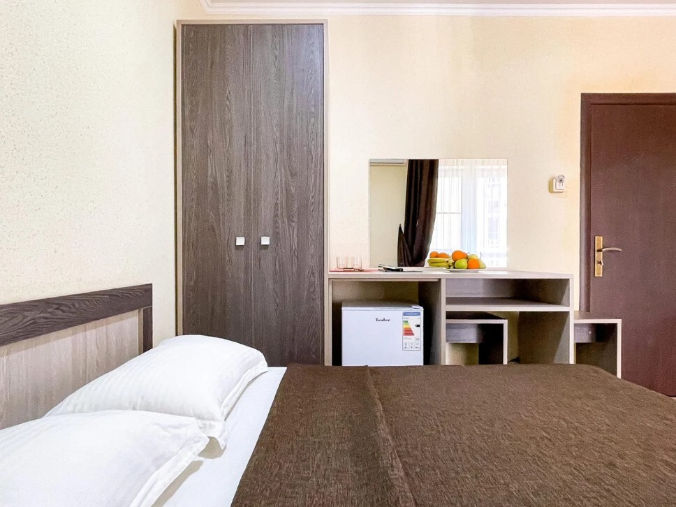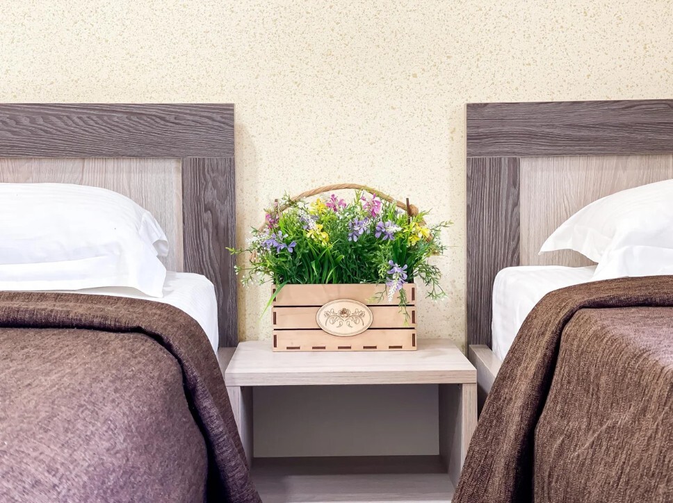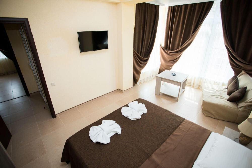 Двуспальная или две односпальные кровати (0,8*1,9м), дополнительное место еврораскладушка или детская кроватка бесплатно, душ, туалет, ТВ, холодильник, кондиционер, балкон.