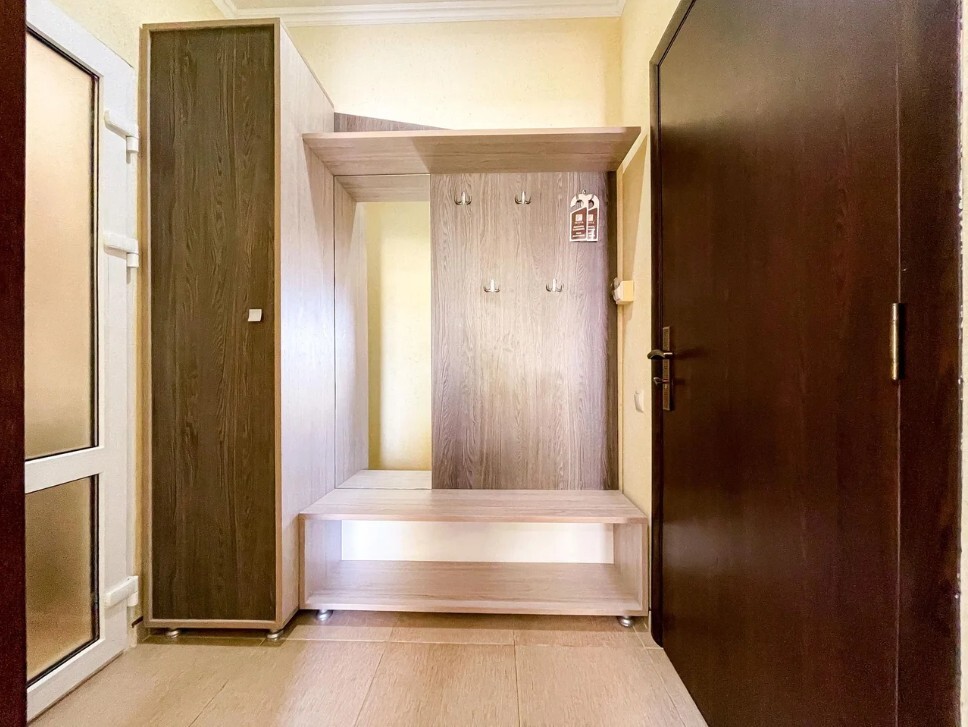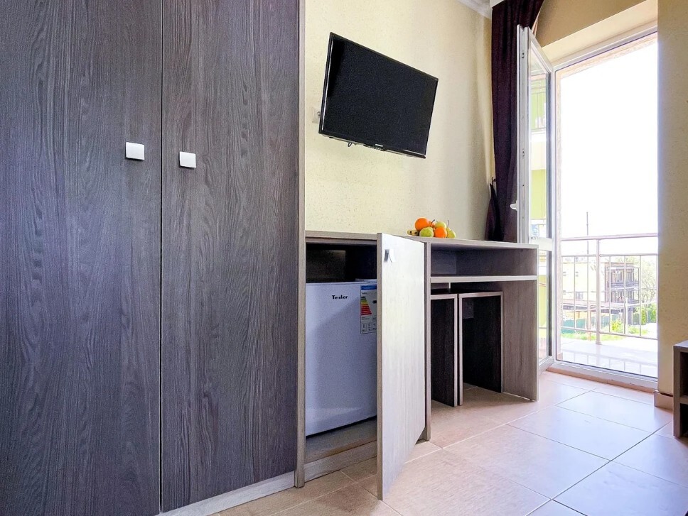Прихожая, двуспальная кровать, две односпальных кровати, дополнительное место еврораскладушка или детская кроватка бесплатно, душ, туалет, ТВ, холодильник, кондиционер, балкон.