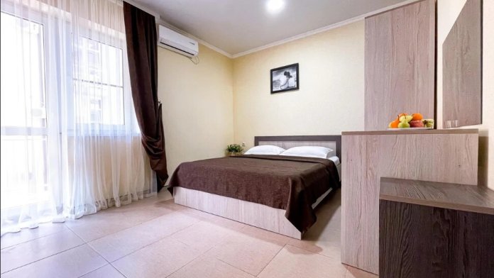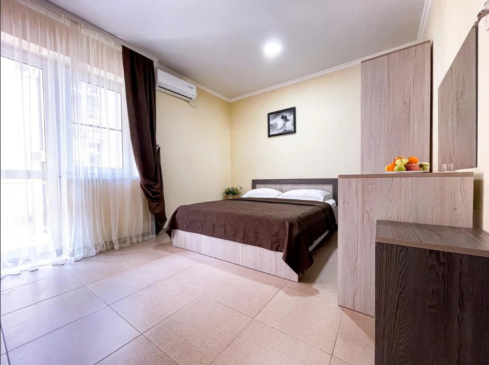 Две изолированные комнаты, 40 кв.м. коридор, комната 1: двуспальная кровать, диван(1,2м), раскладушка, кондиционер, ТВ, комната 2: две односп.кровати(0,8*1,9м), раскладушка, кондиционер, ТВ. Холодильник, душ, туалет, балкон.