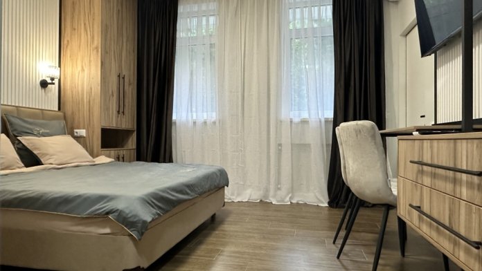 Комплектация: двуспальная кровать, кухонная зона с плитой, СВЧ, чайником и набором посуды, смарт телевизор, холодильник, кондиционер, постельное белье и принадлежности, фен.
