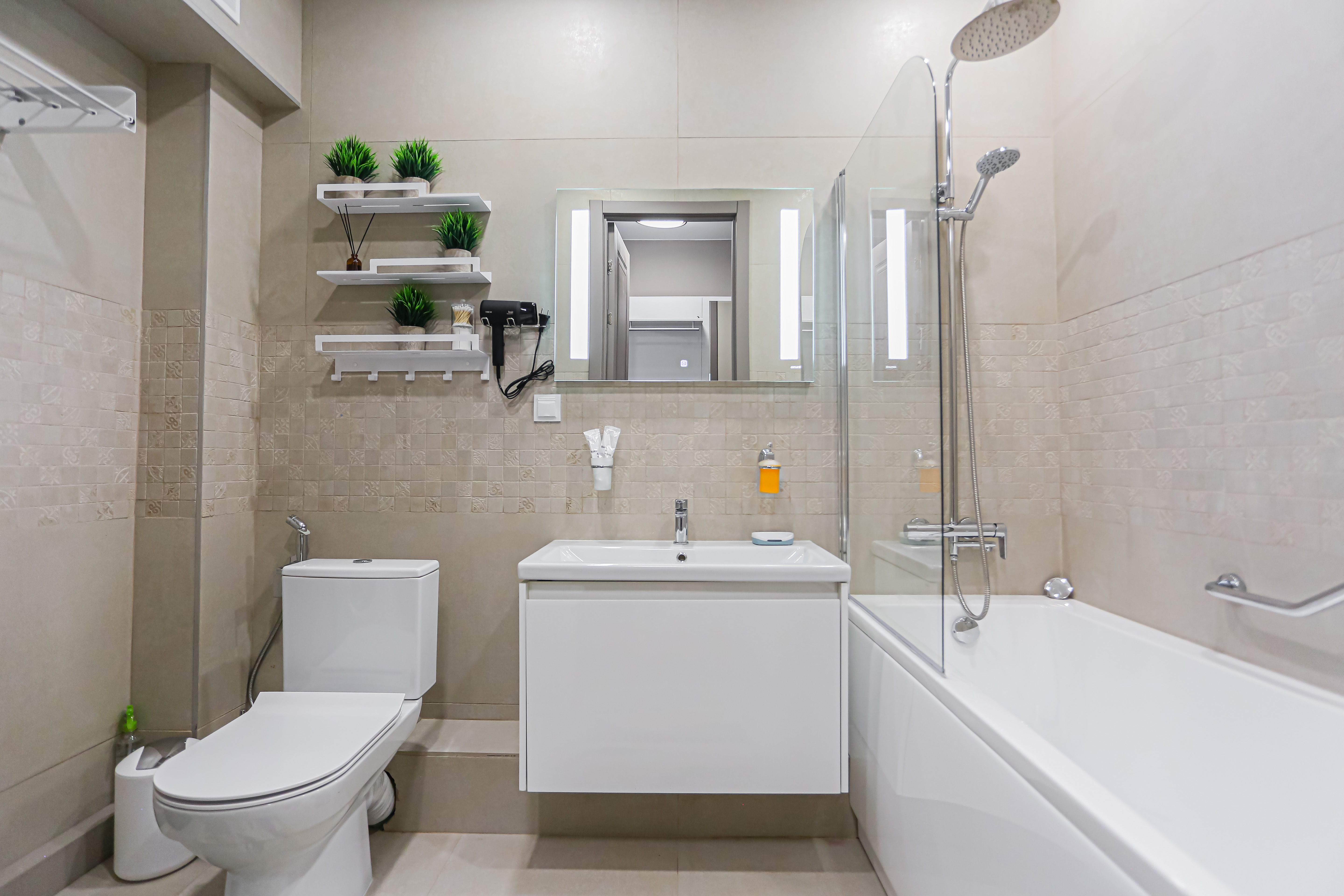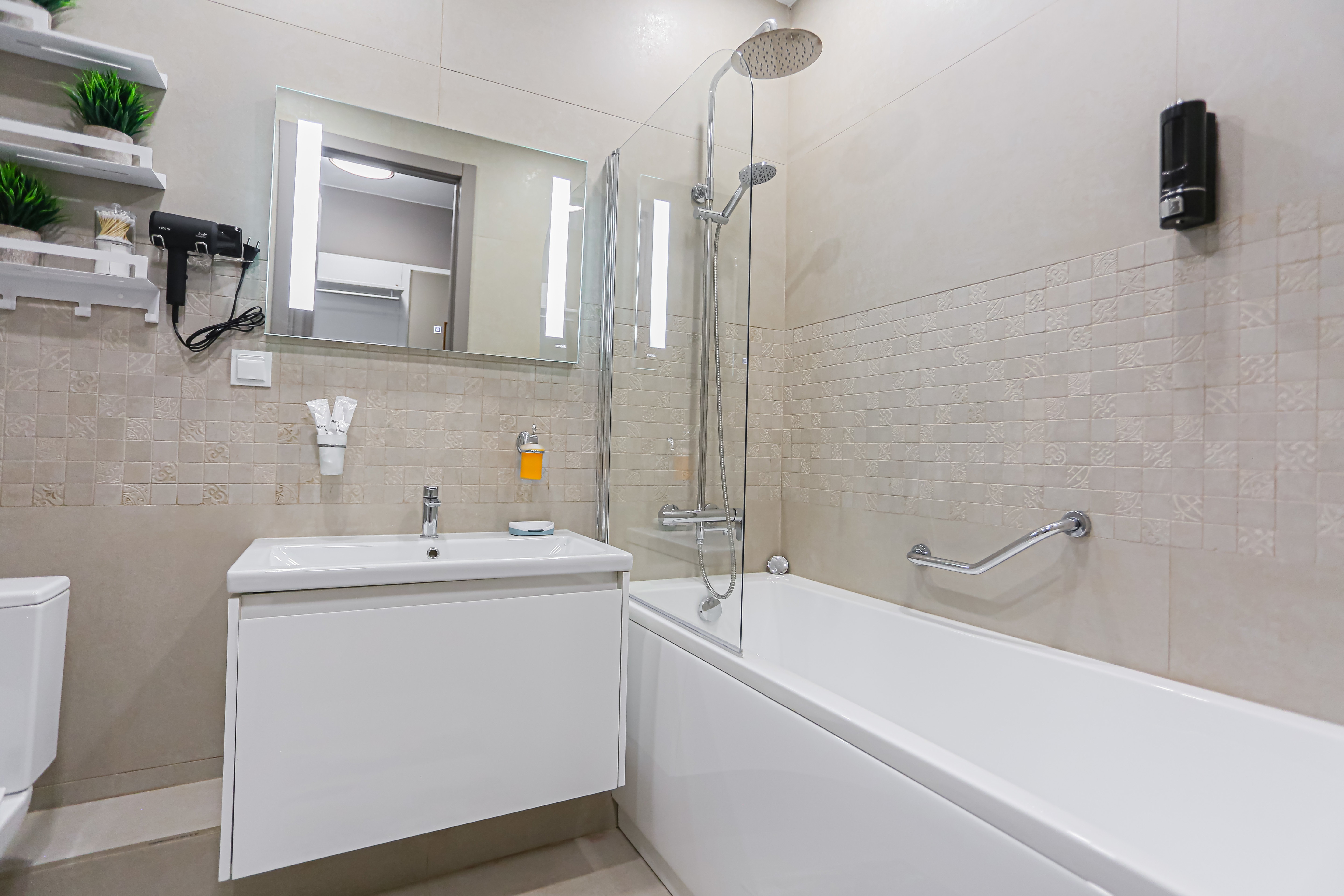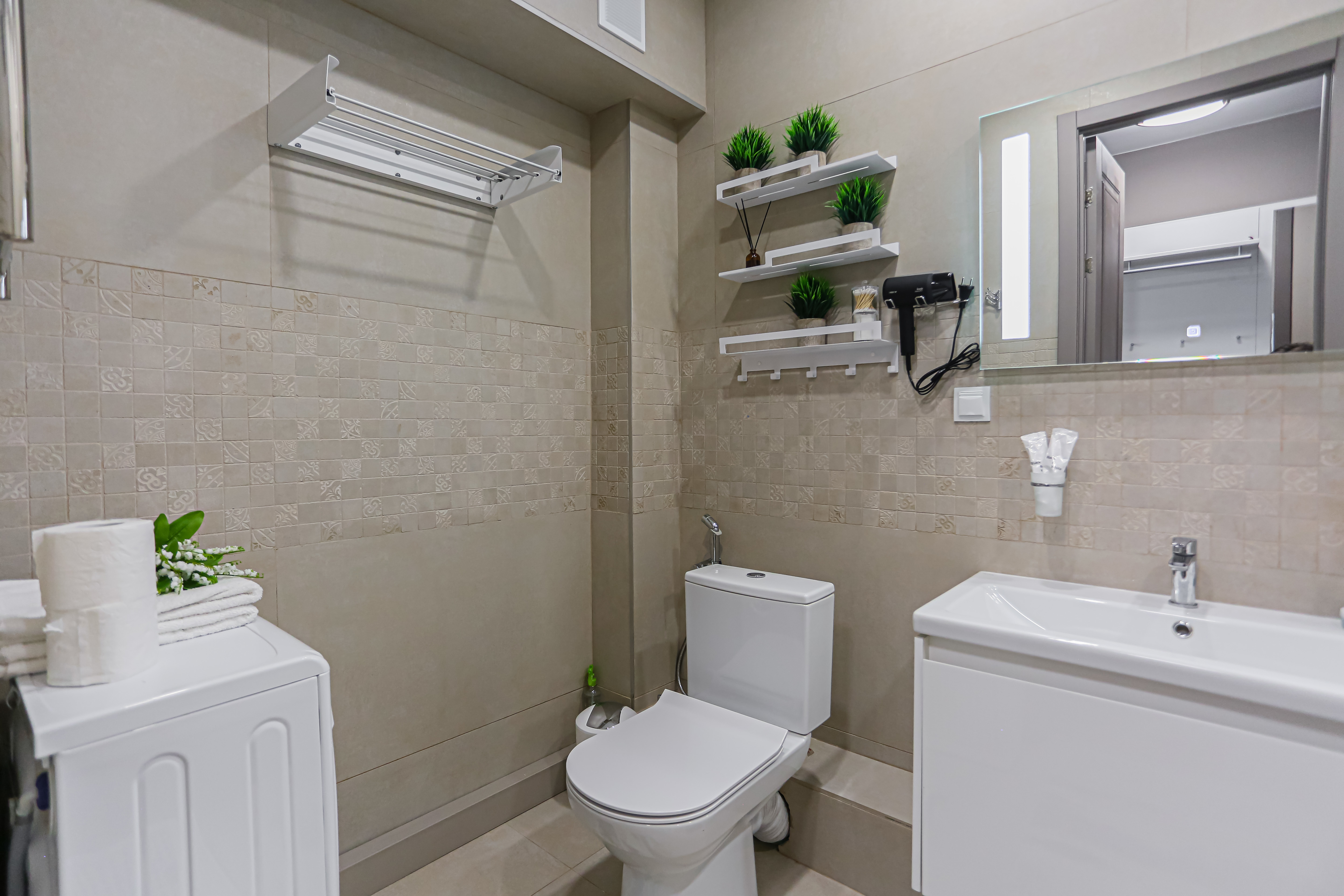 - всё нужное для проживания: кофе, чай, посуда, утюг, стиральная машина, сушилка, гладильная доска;