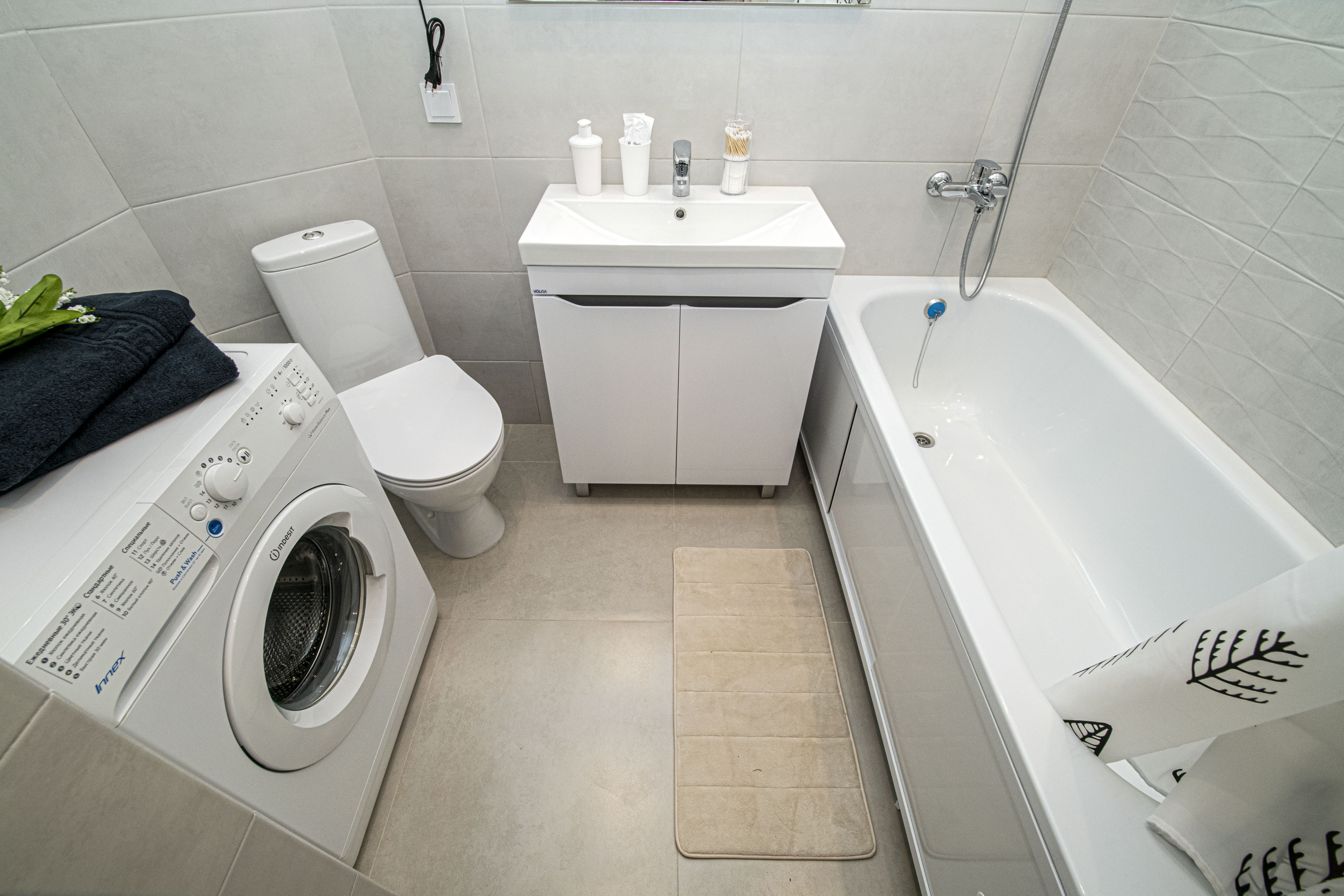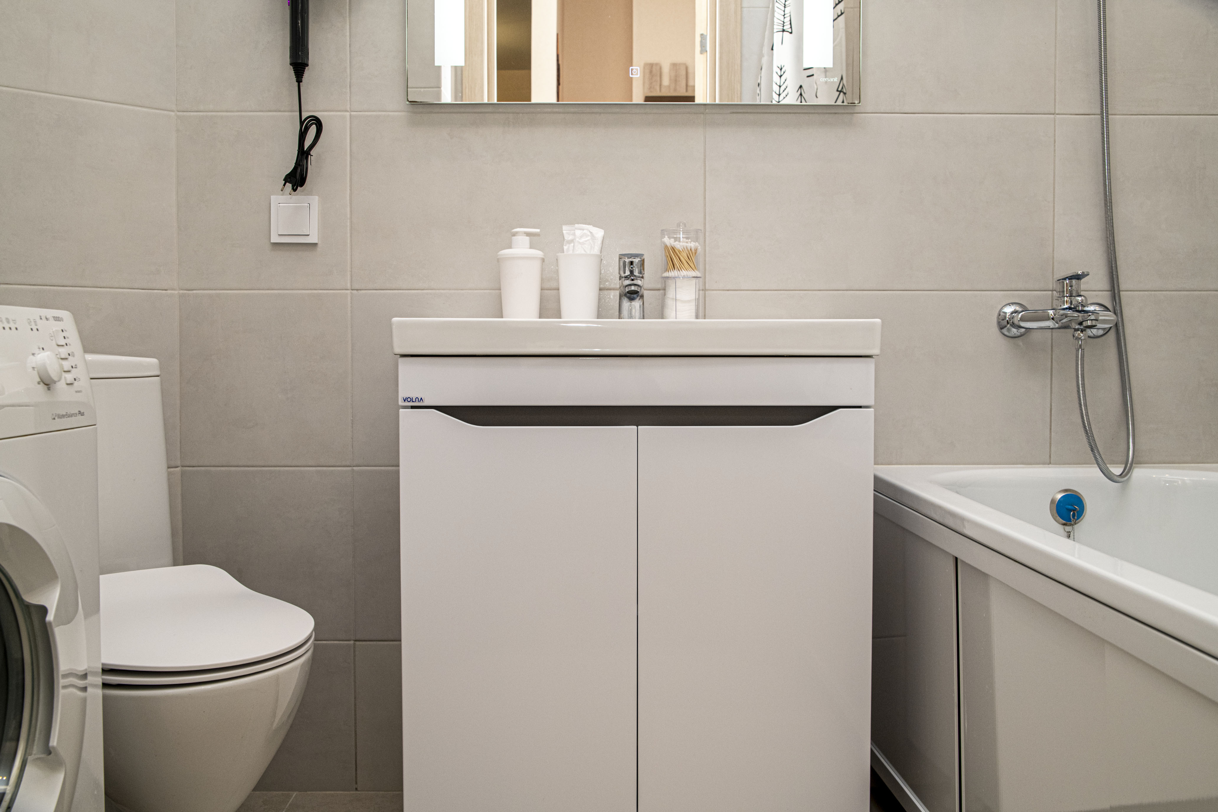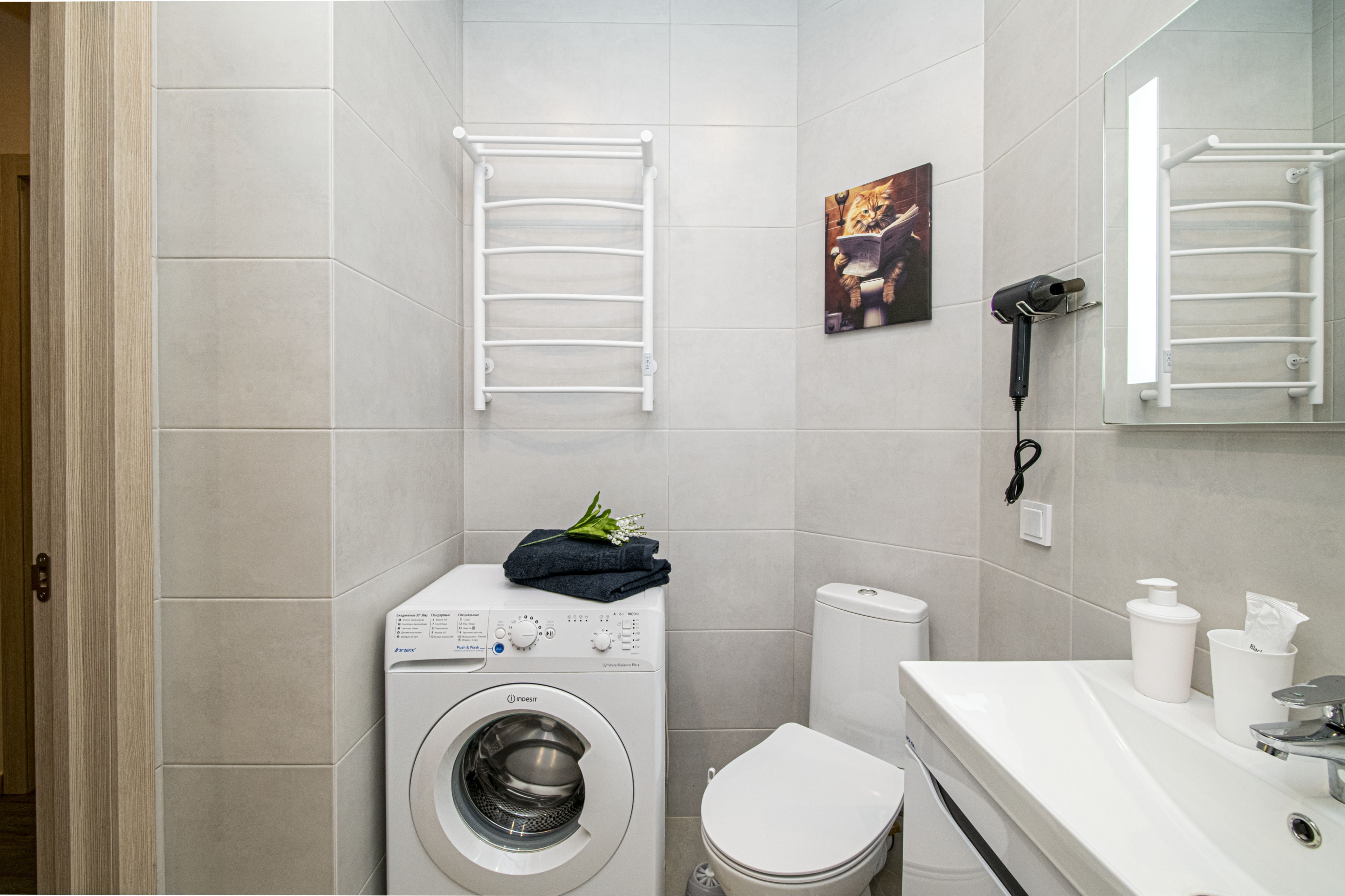 - всё нужное для проживания: кофе, чай, посуда, утюг, стиральная машина, сушилка, гладильная доска;