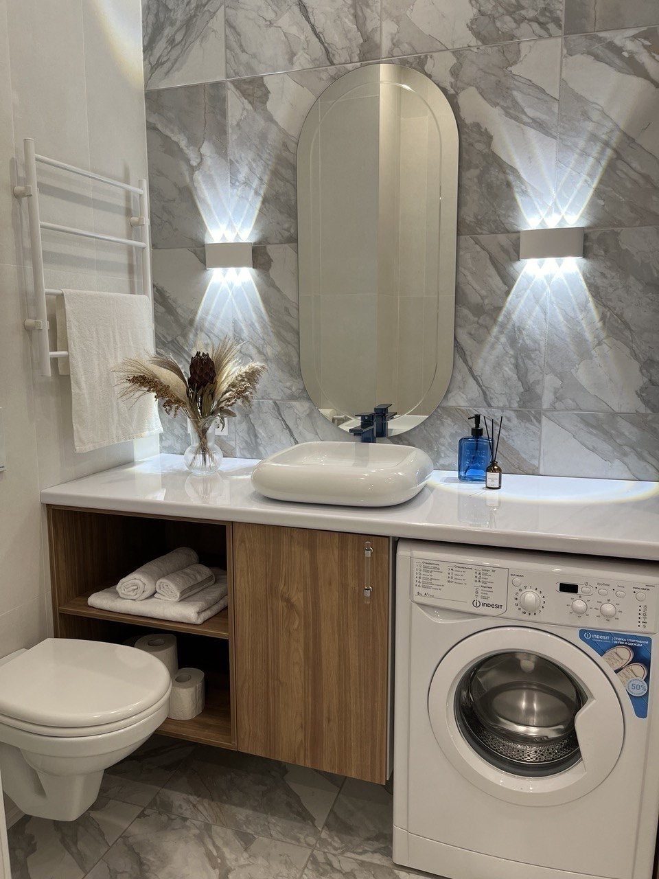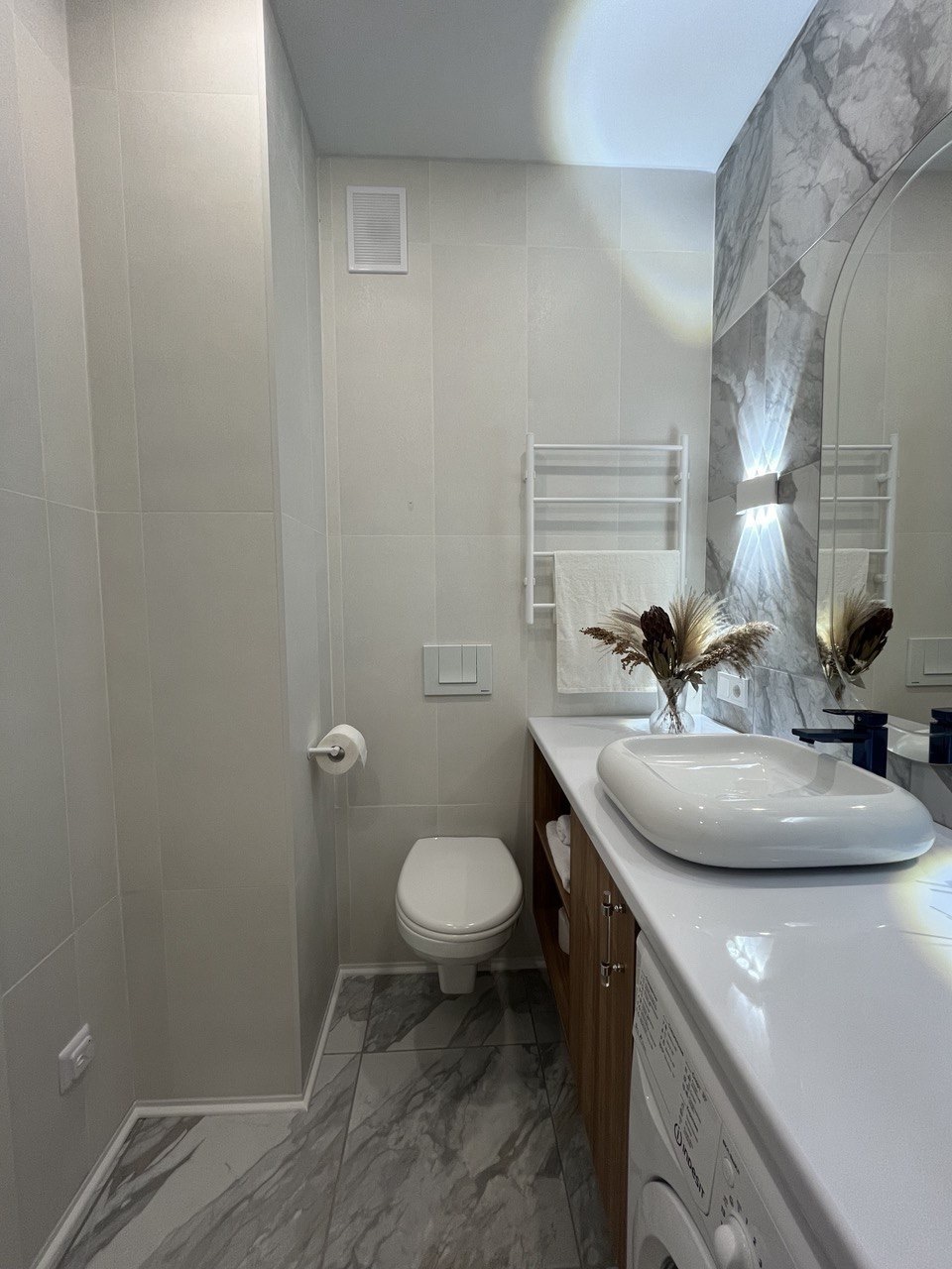 - всё нужное для проживания: кофе, чай, посуда, утюг, стиральная машина, сушилка, гладильная доска;