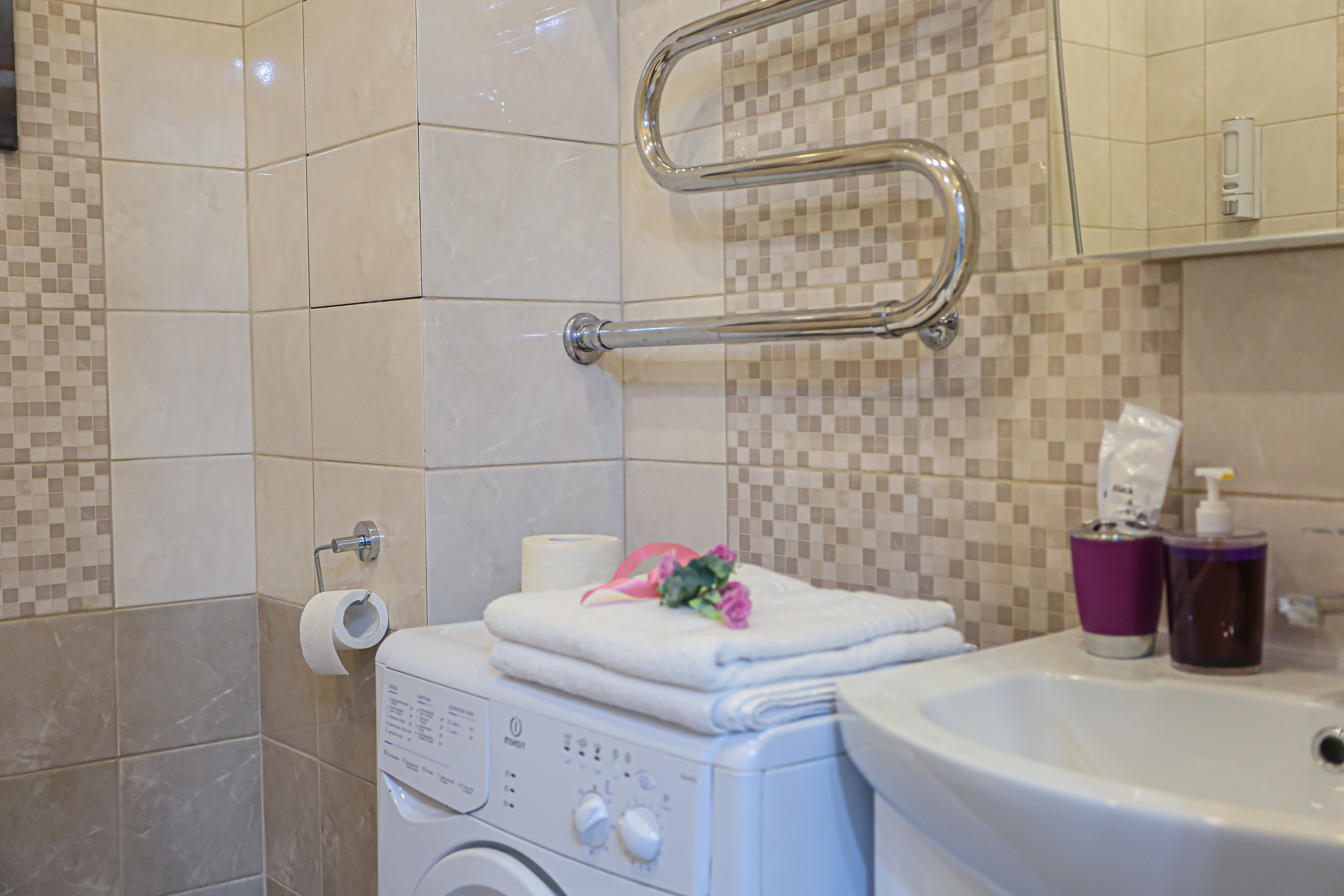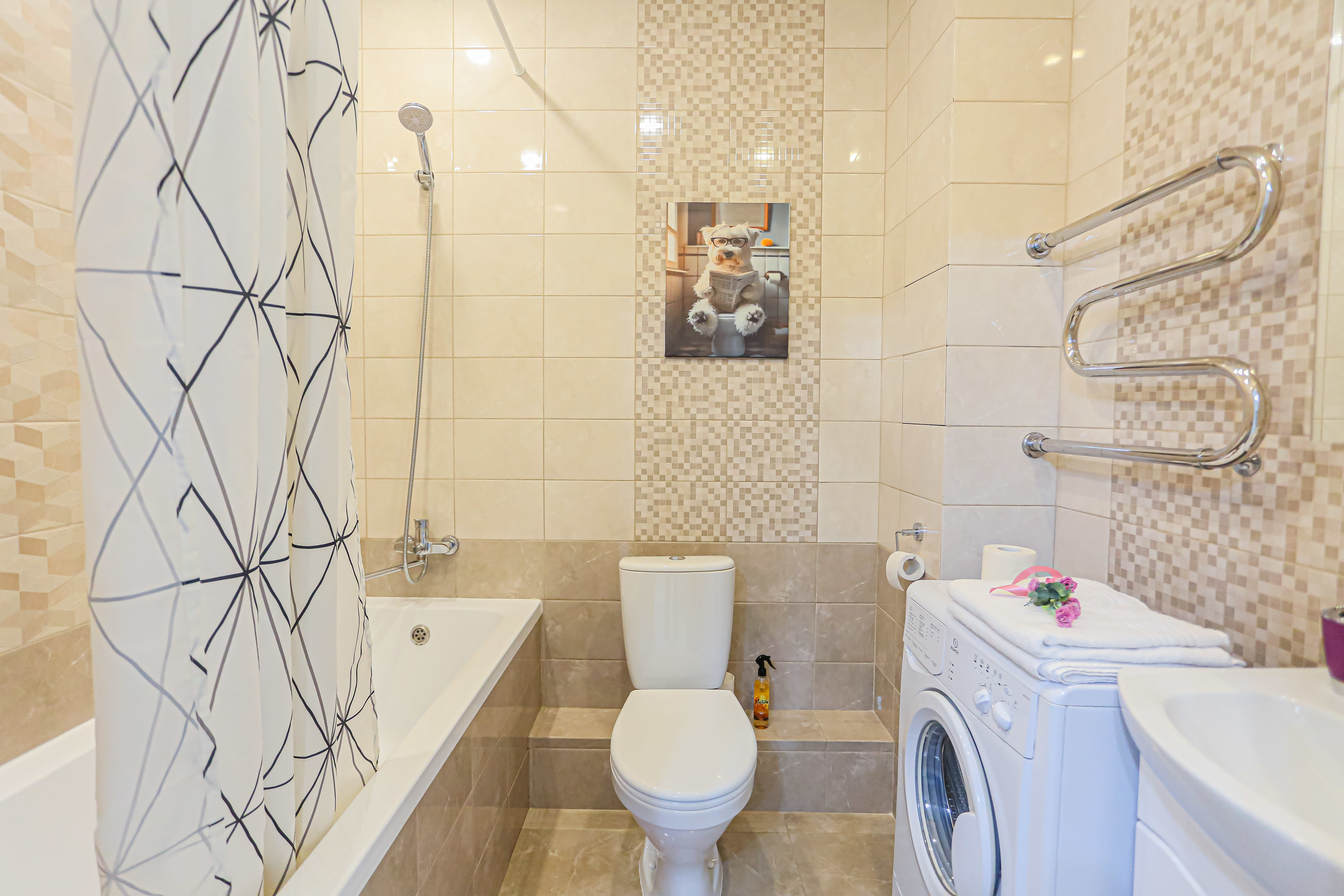 - Всё нужное для проживания: кофе, чай, посуда, утюг, стиральная машина, сушилка, гладильная доска;
