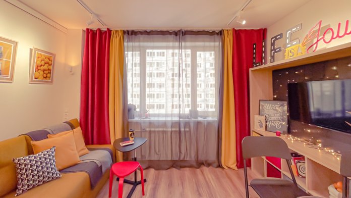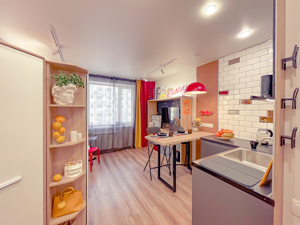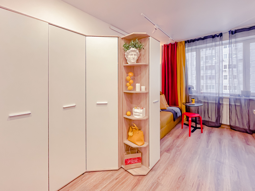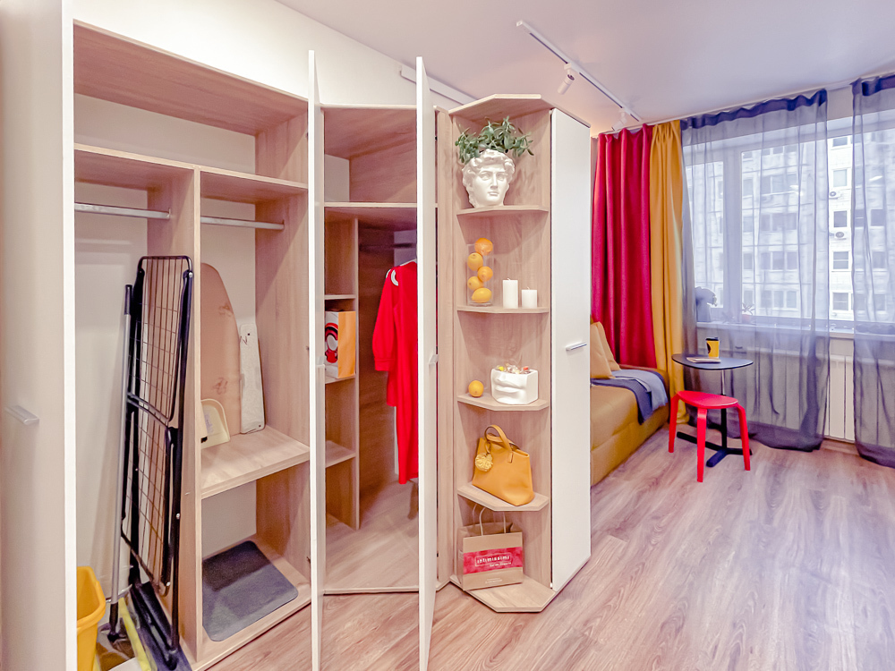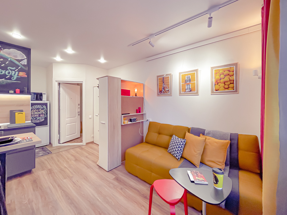 В самой комнате достаточно мест для хранения, большое спальное место (диван раскладывается, 200x140см), есть кухня, рабочая и обеденная зона с видом во двор, парковку на лес (западная сторона, виден закат).
