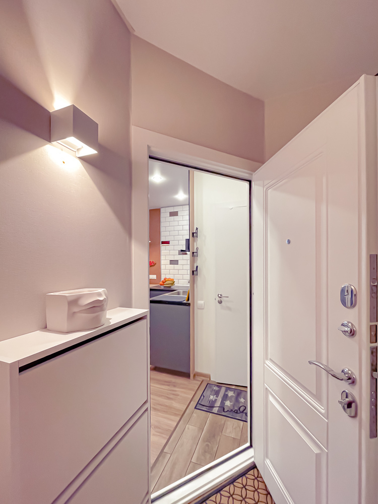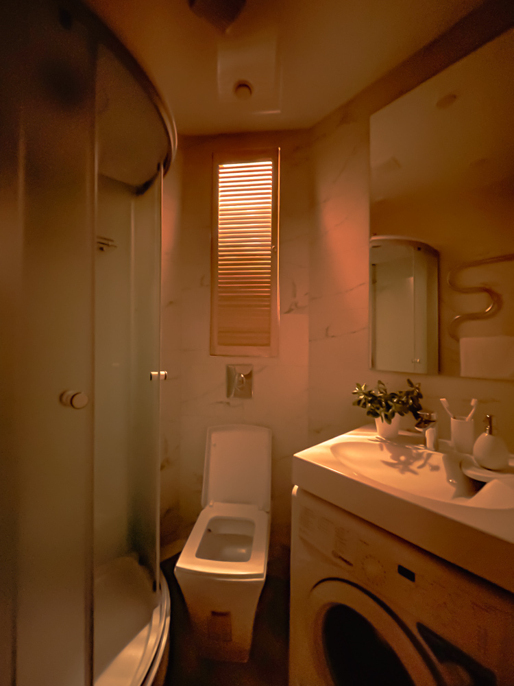На небольшой площади студии компактно размещены просторный санузел с душевой и стиралкой.