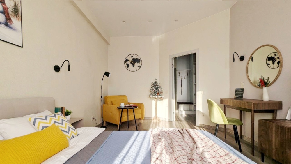 В квартире имеется: одна двухспальная кровать, один раскладывающийся диван, одно раскладывающиеся кресло, детская кроватка (по запросу).