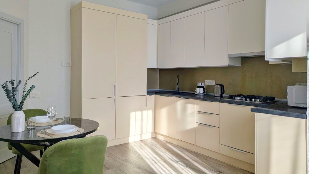Кухня оснащена всем необходимым: холодильник, газовая варочная поверхность, посудомоечная машина, электрический чайник, кофеварка, микроволновая печь. Кастрюли, сковородки, приборы, посуда.