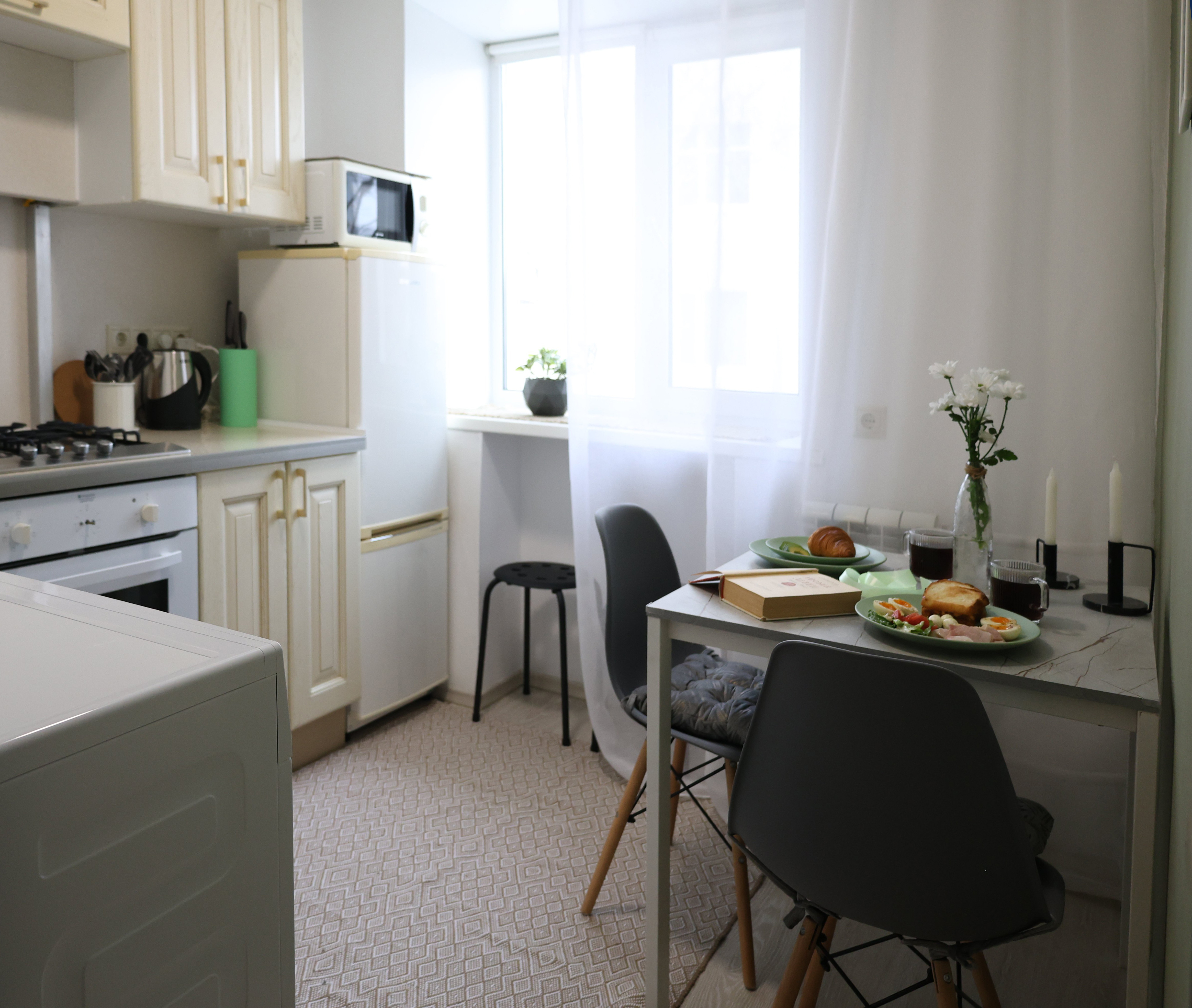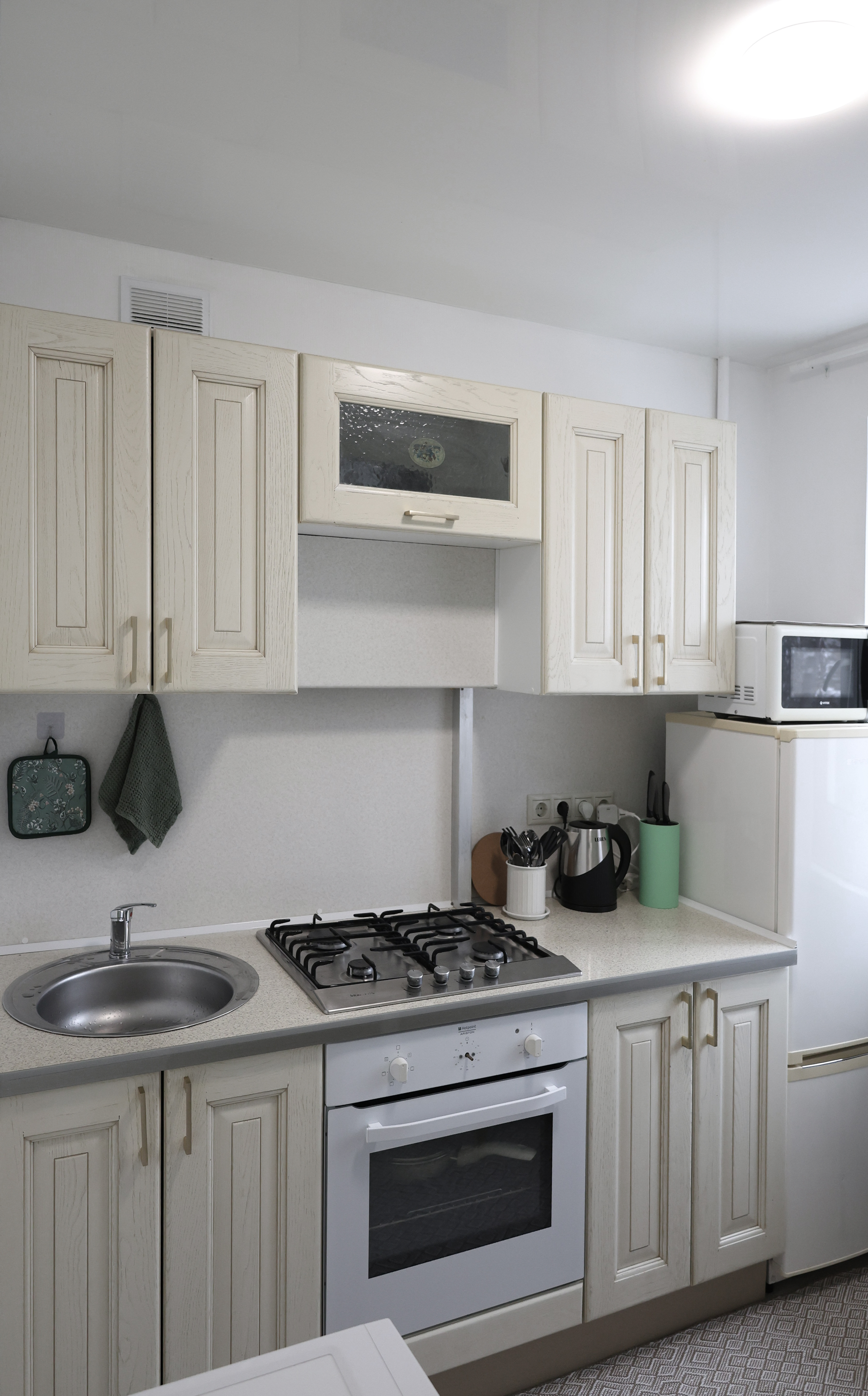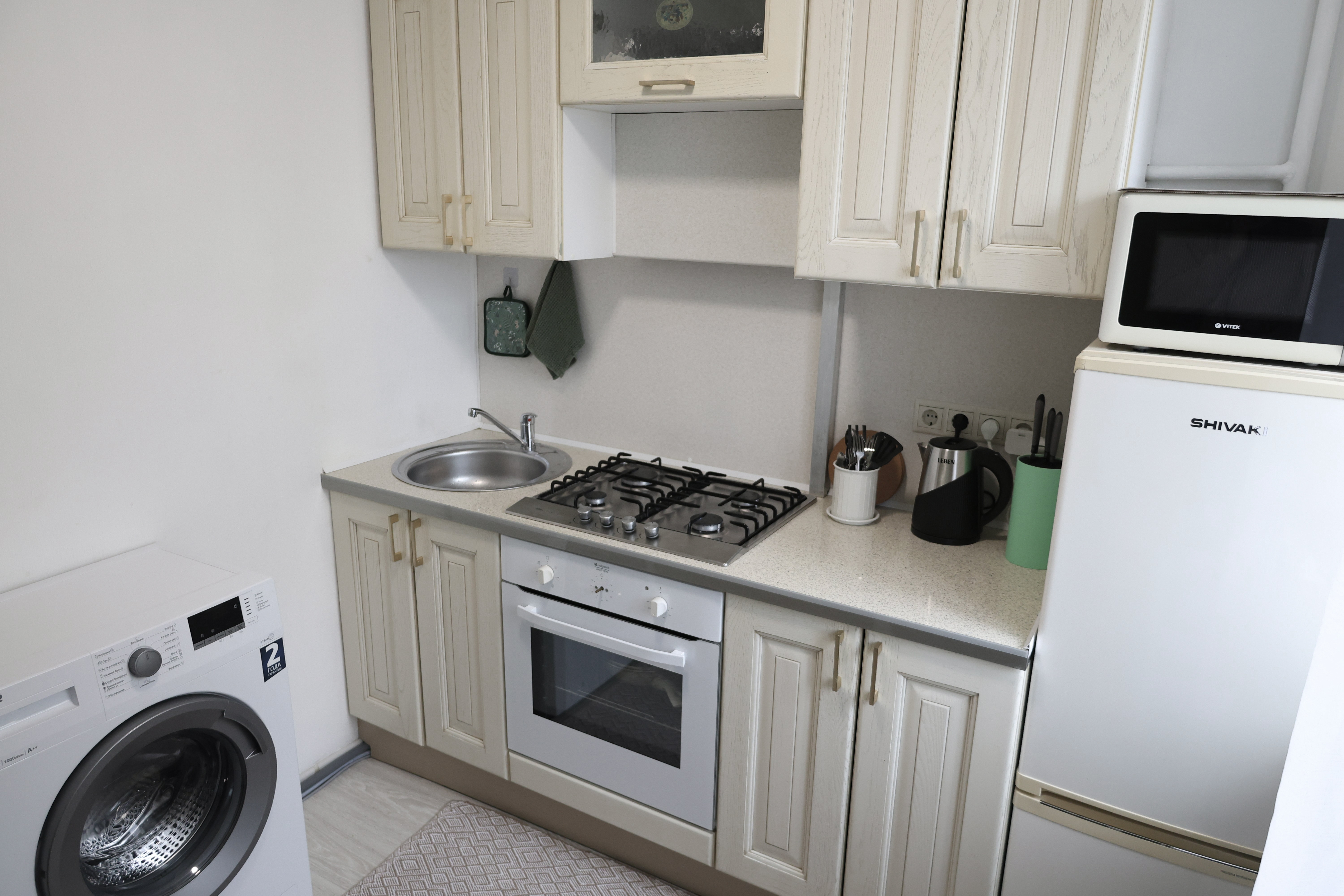 Кухня как дома: варочная поверхность, духовка, холодильник, микроволновка, чайник, посуда и всё для готовки.