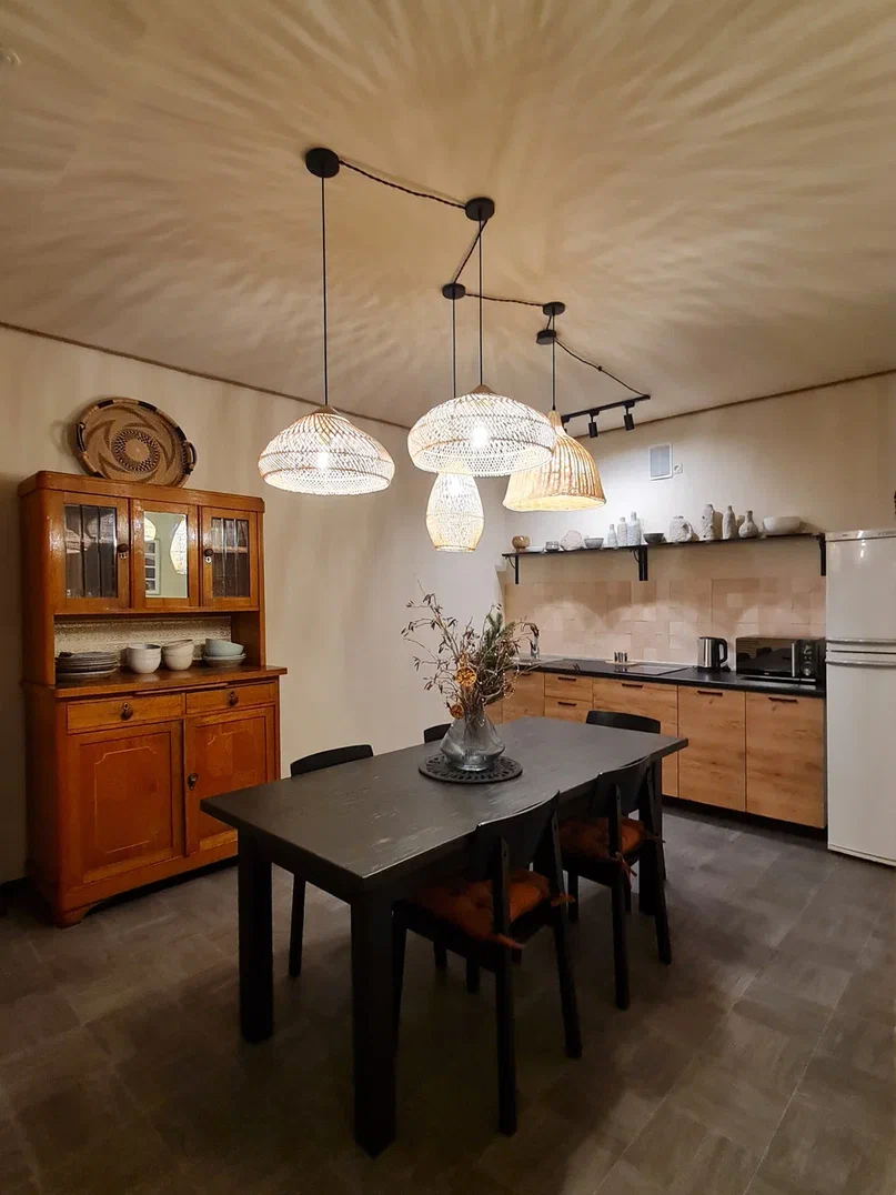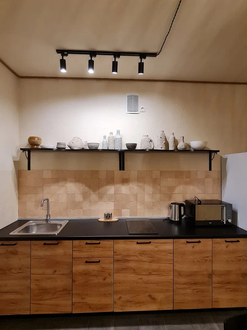 Кухня как дома: варочная поверхность, духовка, холодильник, микроволновка, чайник, посуда и всё для готовки.