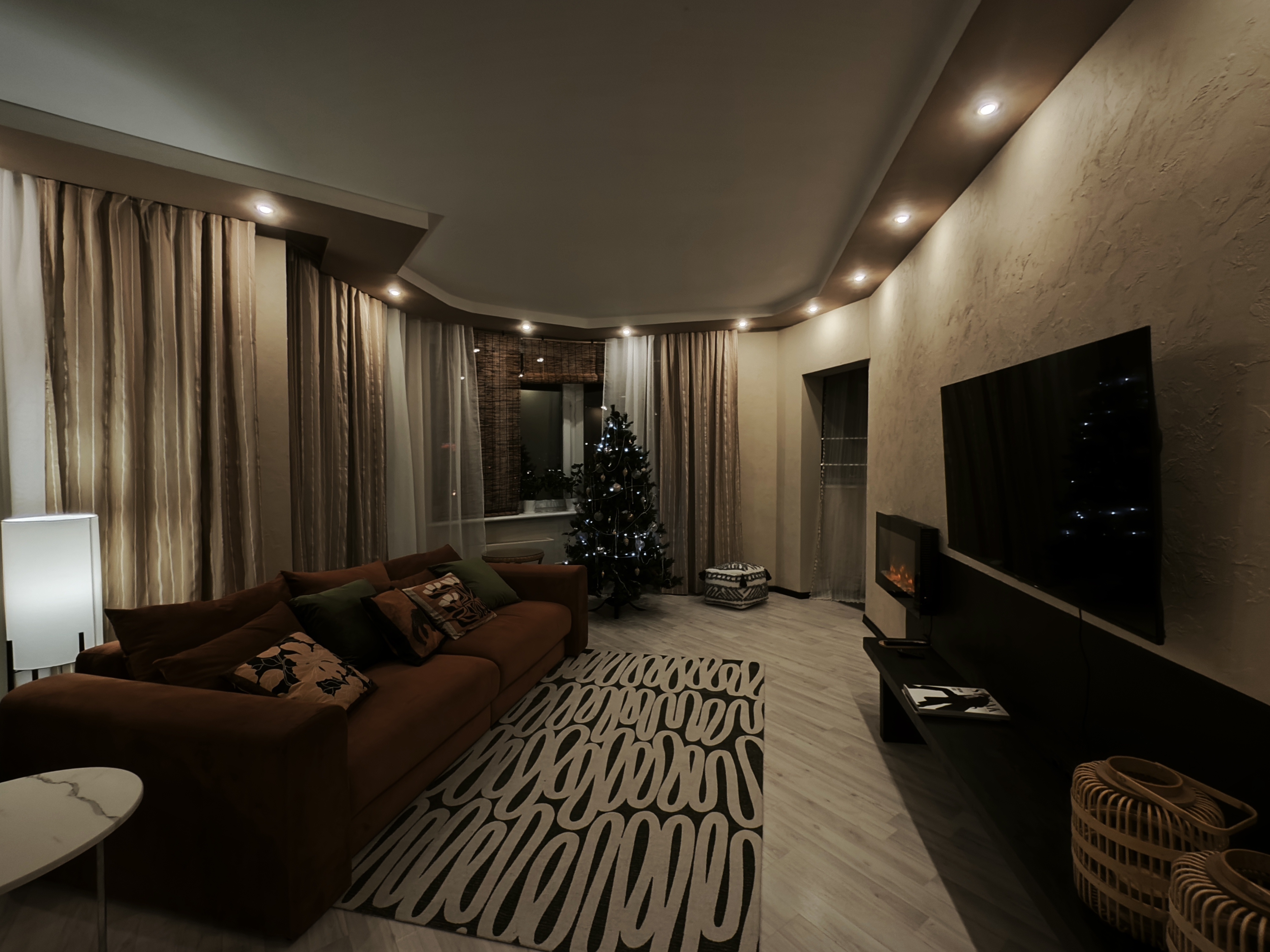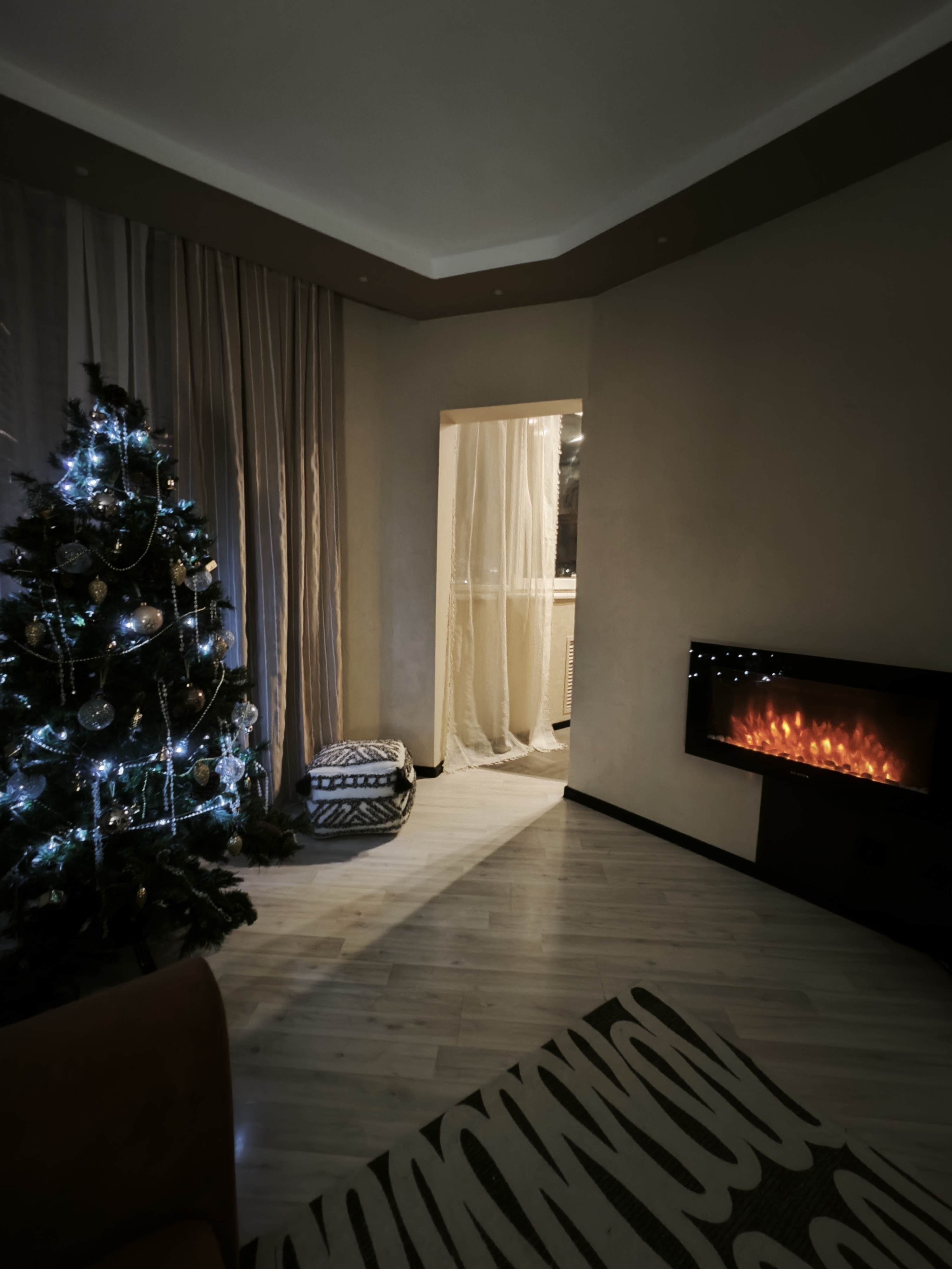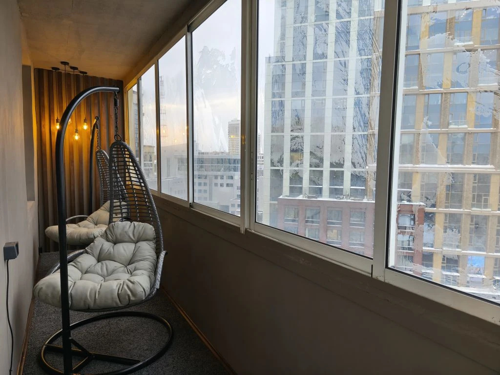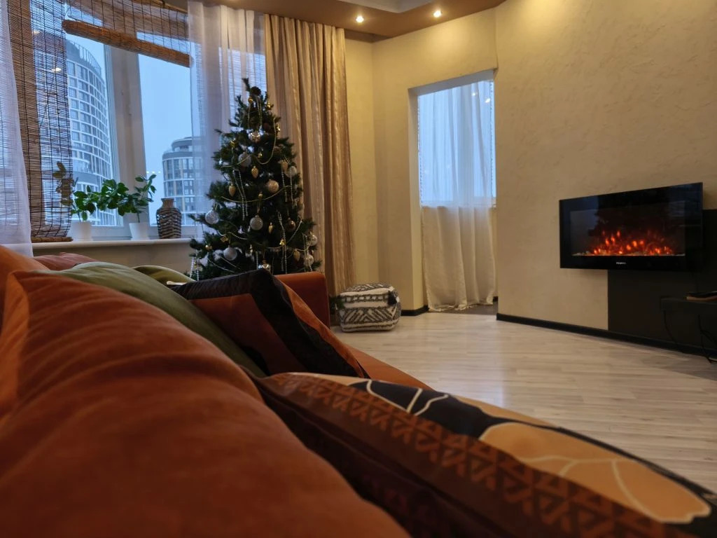 Из окон открывается впечатляющий вид на город, а в гостиной вас ждёт настенный электрокамин с эффектом живого пламени - мягкий свет, тепло, визуальный огонь и звук треска создают ощущение настоящего отдыха, особенно вечером. На лоджии - два подвесных кресла и подиум с подушками: идеальное место для утреннего кофе или вечернего бокала вина с видом на огни города.