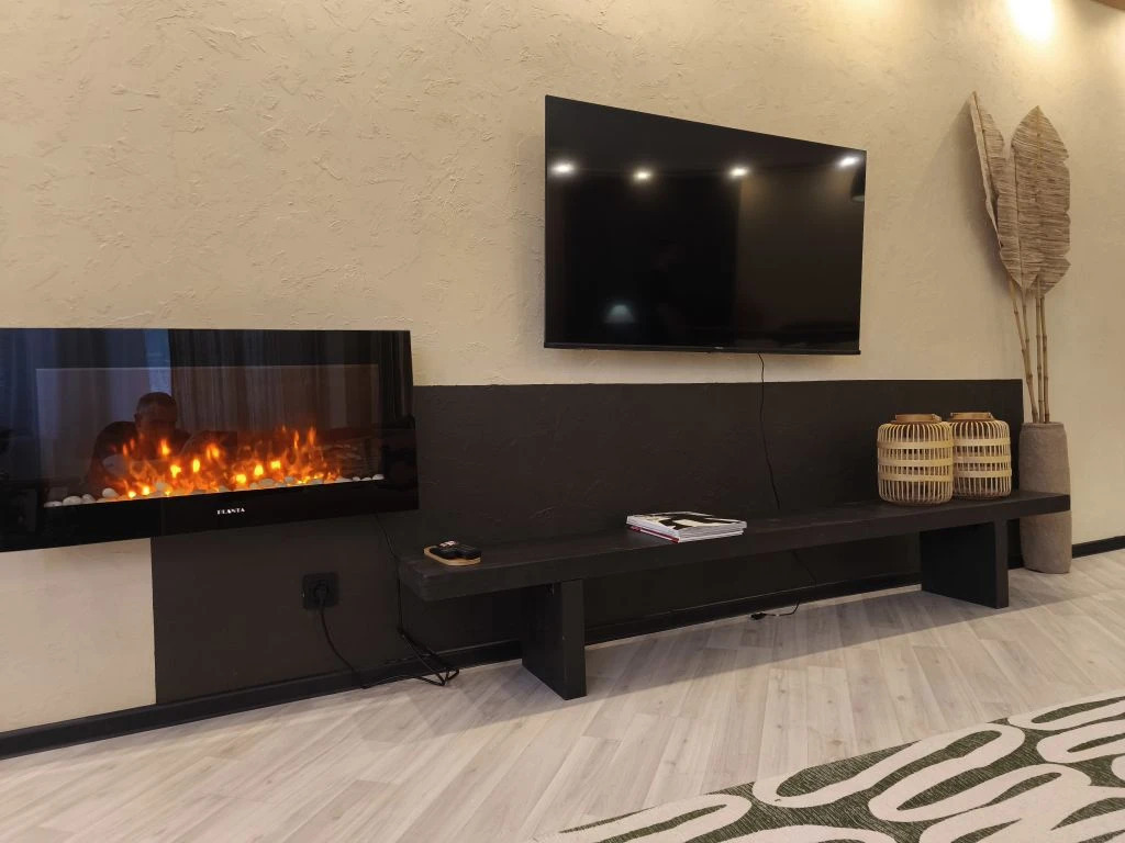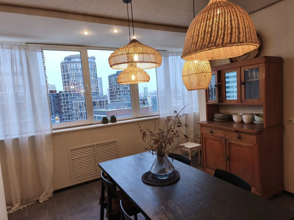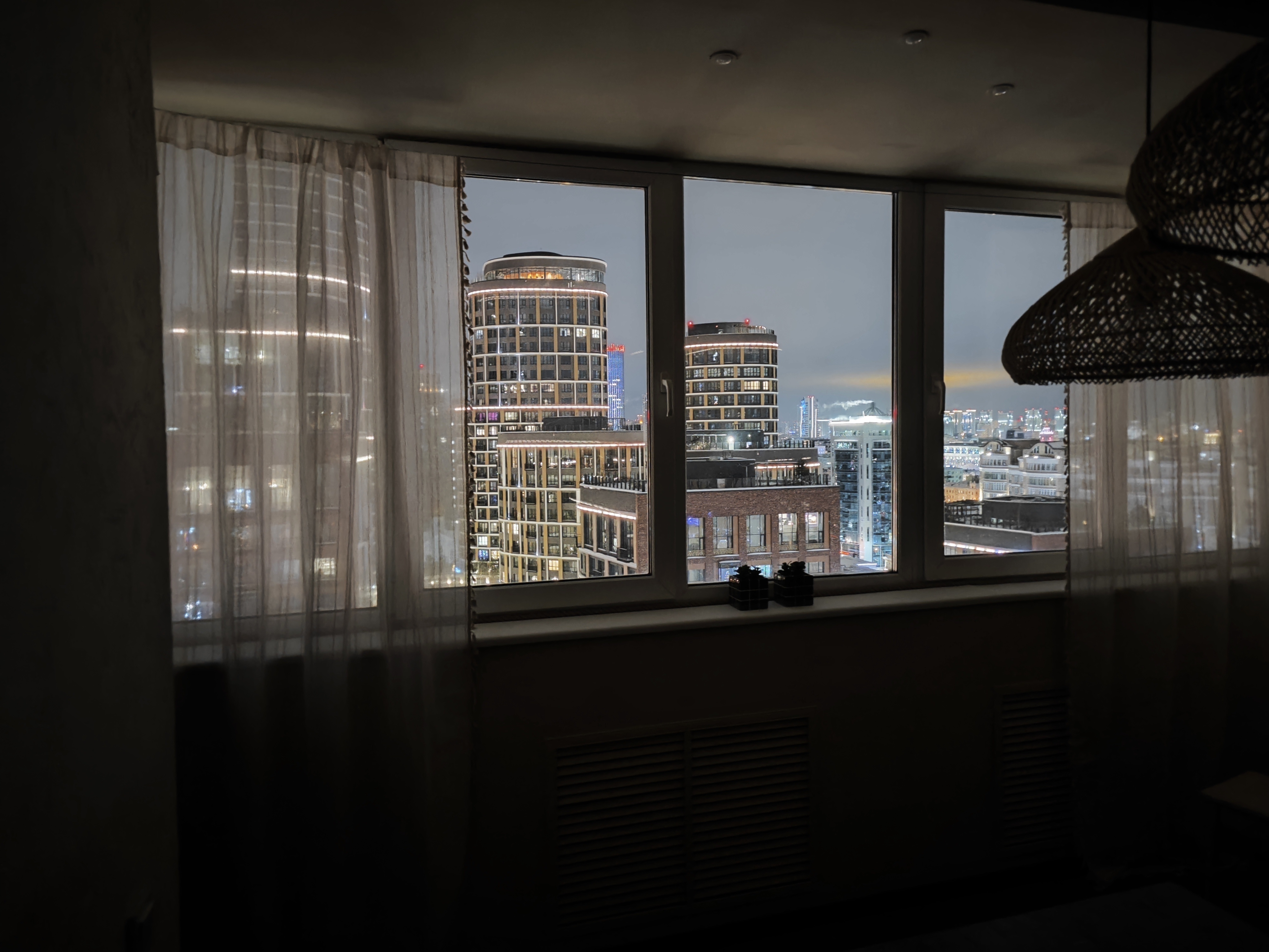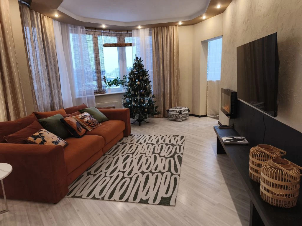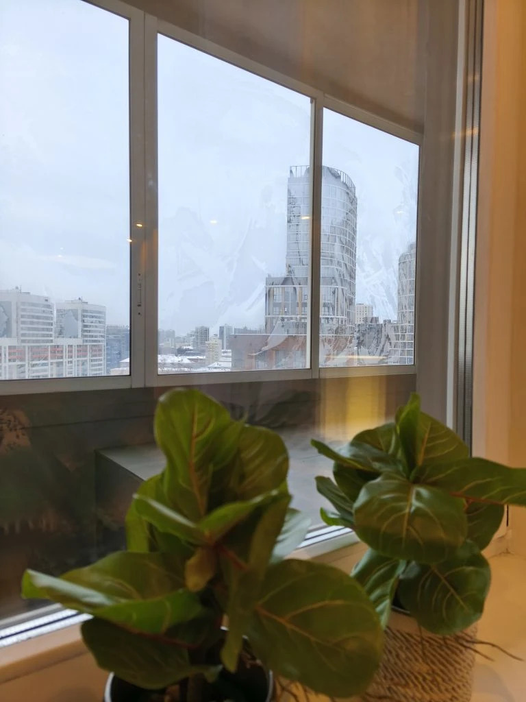Из окон открывается впечатляющий вид на город, а в гостиной вас ждёт настенный электрокамин с эффектом живого пламени - мягкий свет, тепло, визуальный огонь и звук треска создают ощущение настоящего отдыха, особенно вечером. На лоджии - два подвесных кресла и подиум с подушками: идеальное место для утреннего кофе или вечернего бокала вина с видом на огни города.